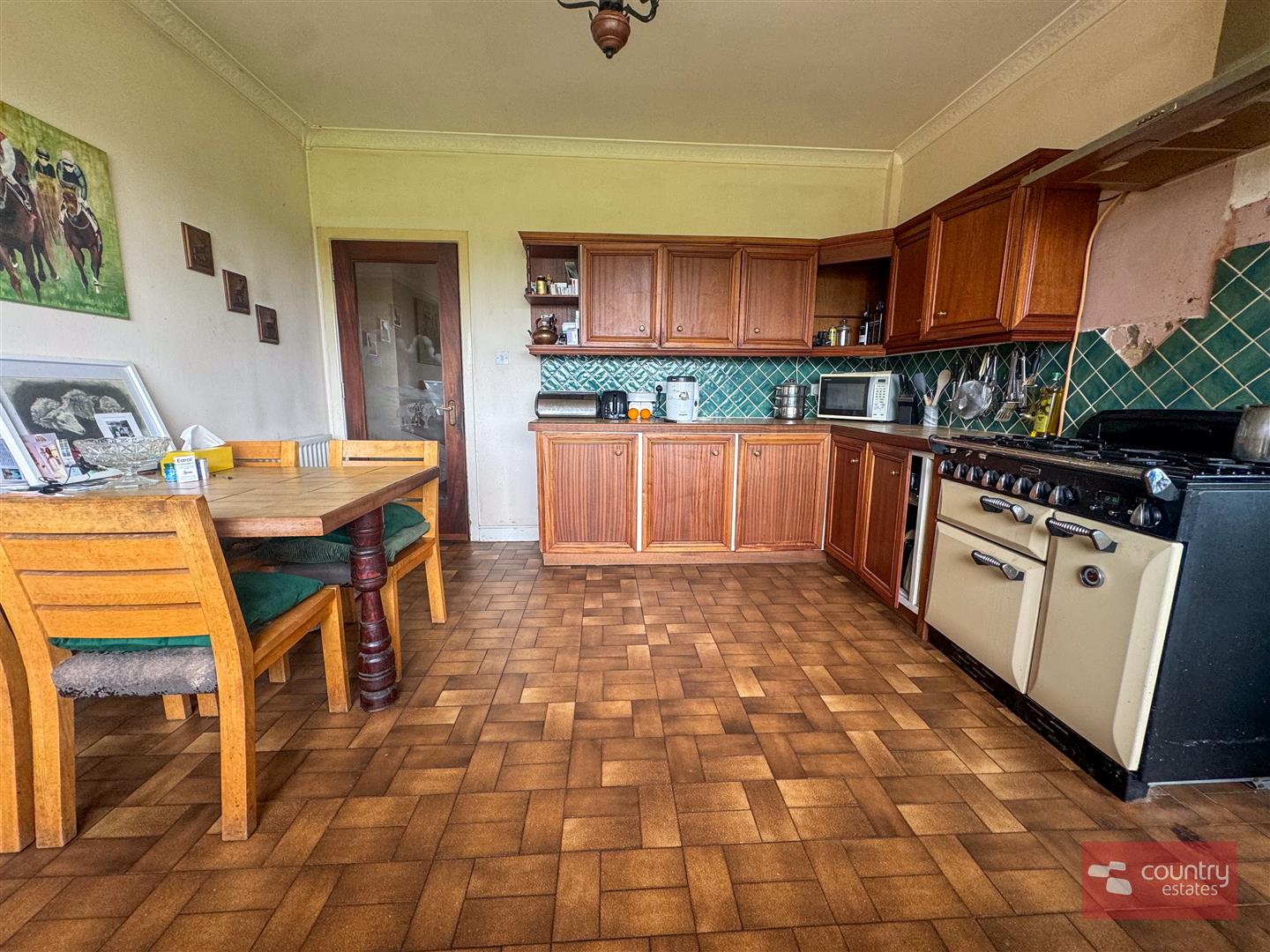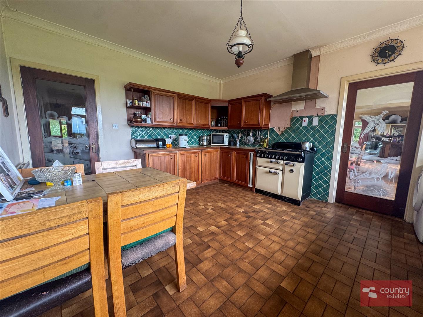 Equipped with a comprehensive range of high and low level fitted units. Single drainer stainless steel sink unit with mixer tap. Range Master cooker with built in 5 ring gas hob. Stainless steel chimney extractor fan over. Space for freestanding fridge, washing machine and dishwasher. Part tiled walls. Tiled floor. Views over garden and beyond.