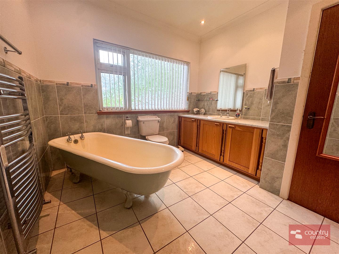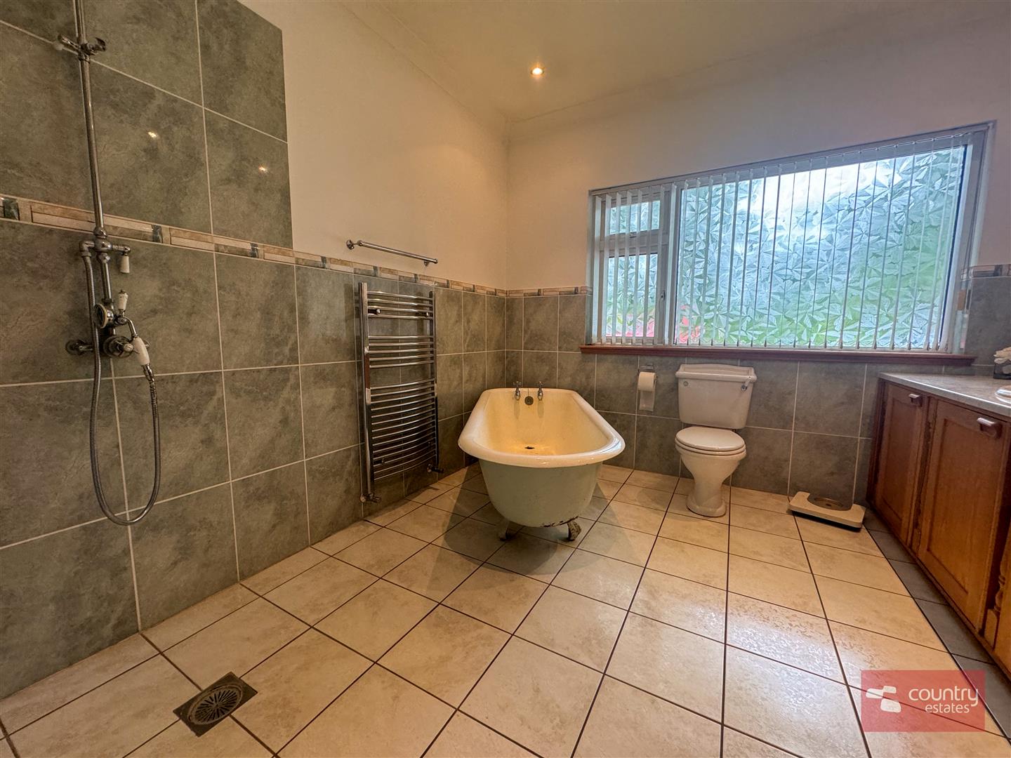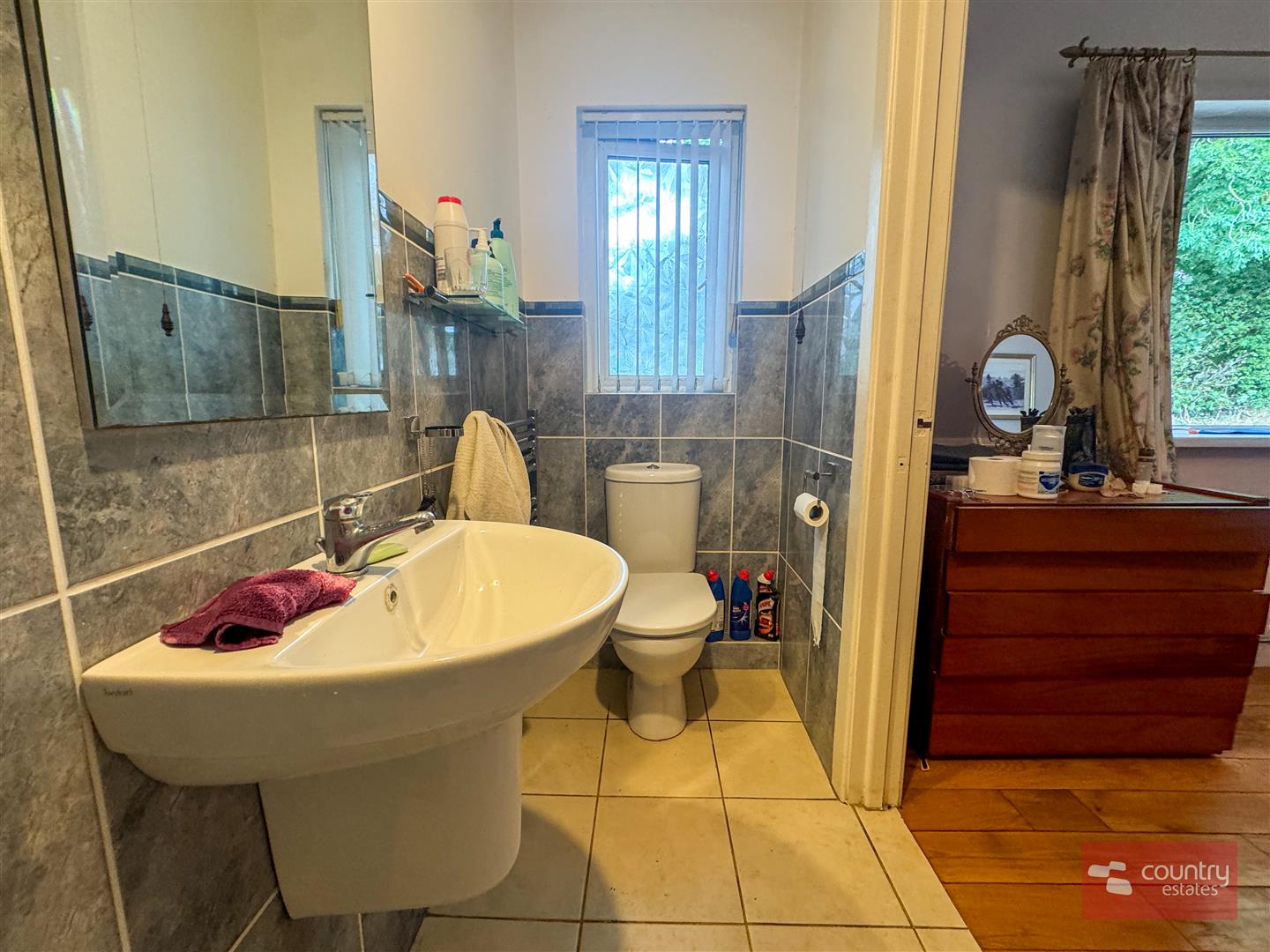 Comprising fitted vanity unit with wash hand basin, freestanding bath, low flush w.c, thermostatically controlled rainfall shower with hand shower attachment, safety handrail, chrome towel rail, recessed spot lights, part tiled walls, tiled floor. Access to shelved hot press.