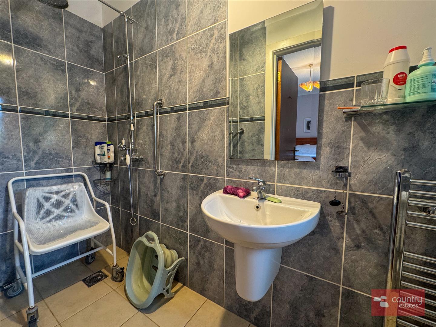 Comprising half pedestal wash hand basin with mixer tap, push button w.c, thermostatically controlled rainfall shower with hand shower attachment, safety handrail, chrome towel rail, part tiled walls, tiled floor.