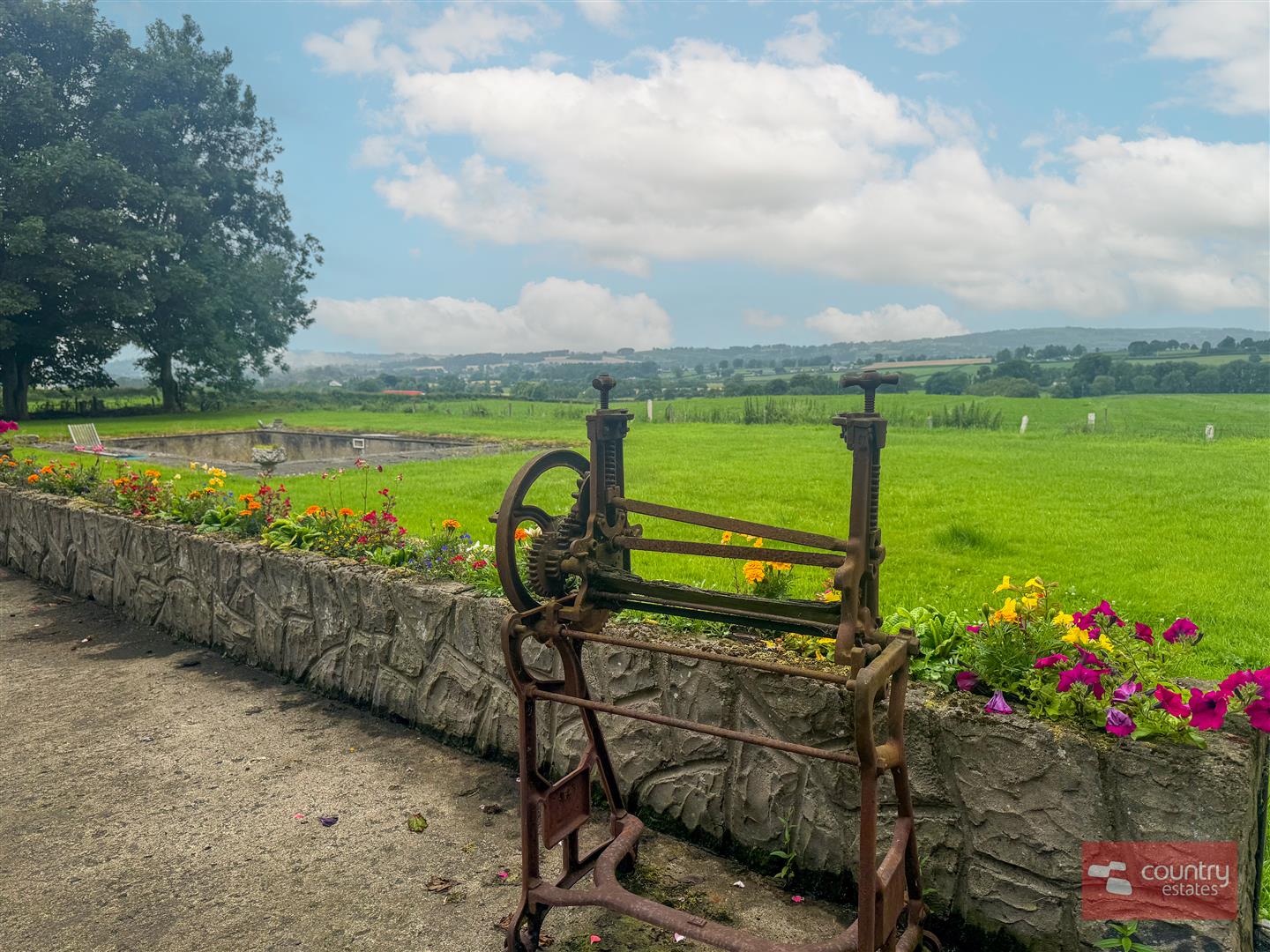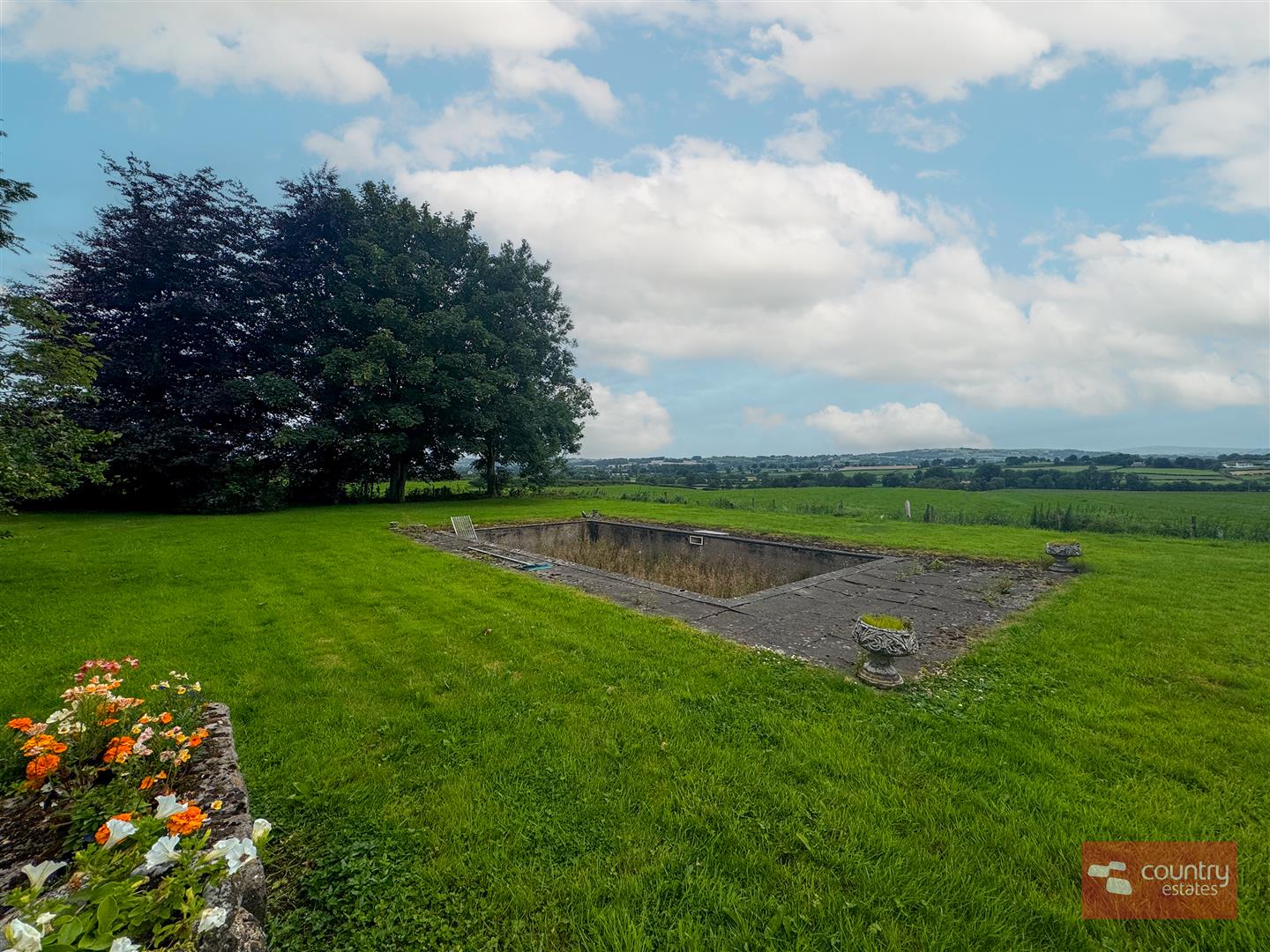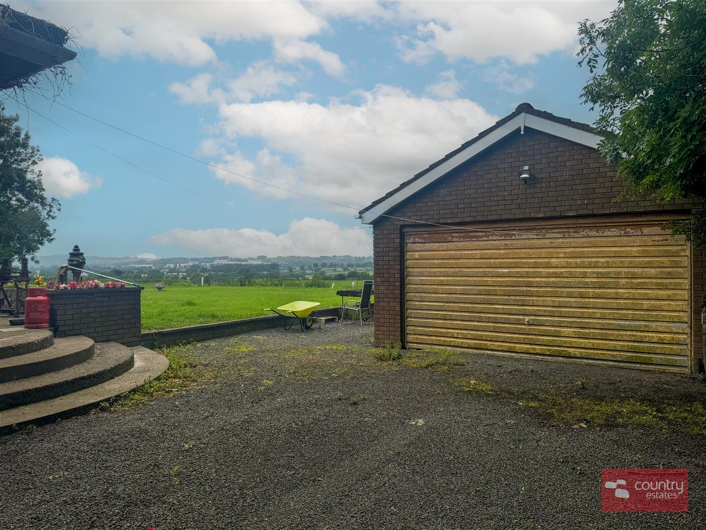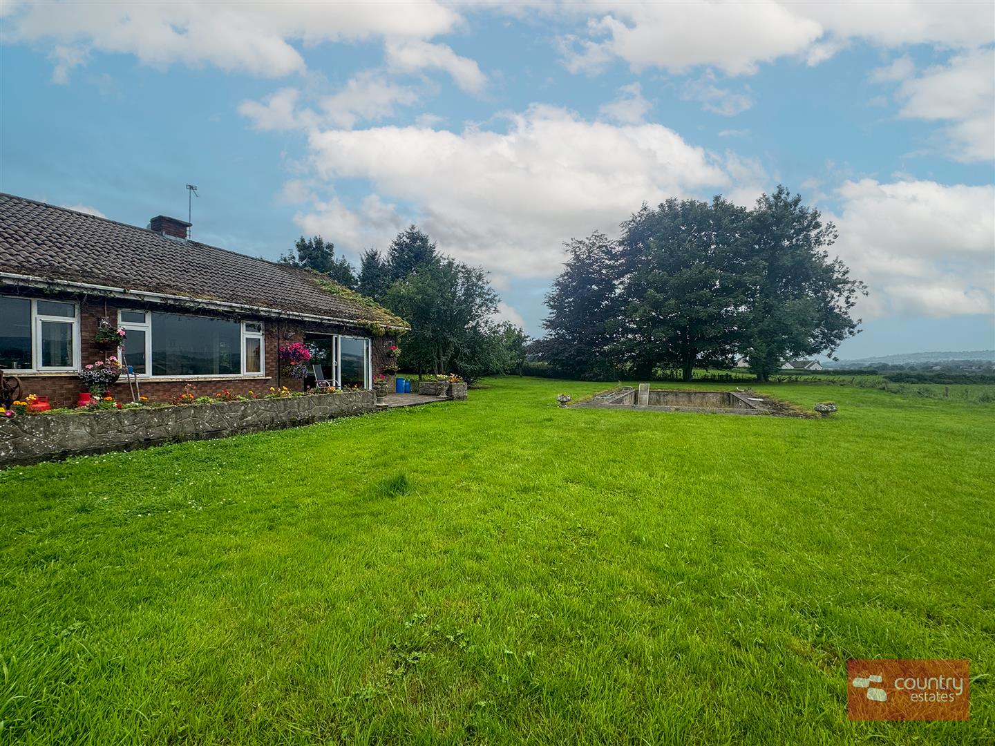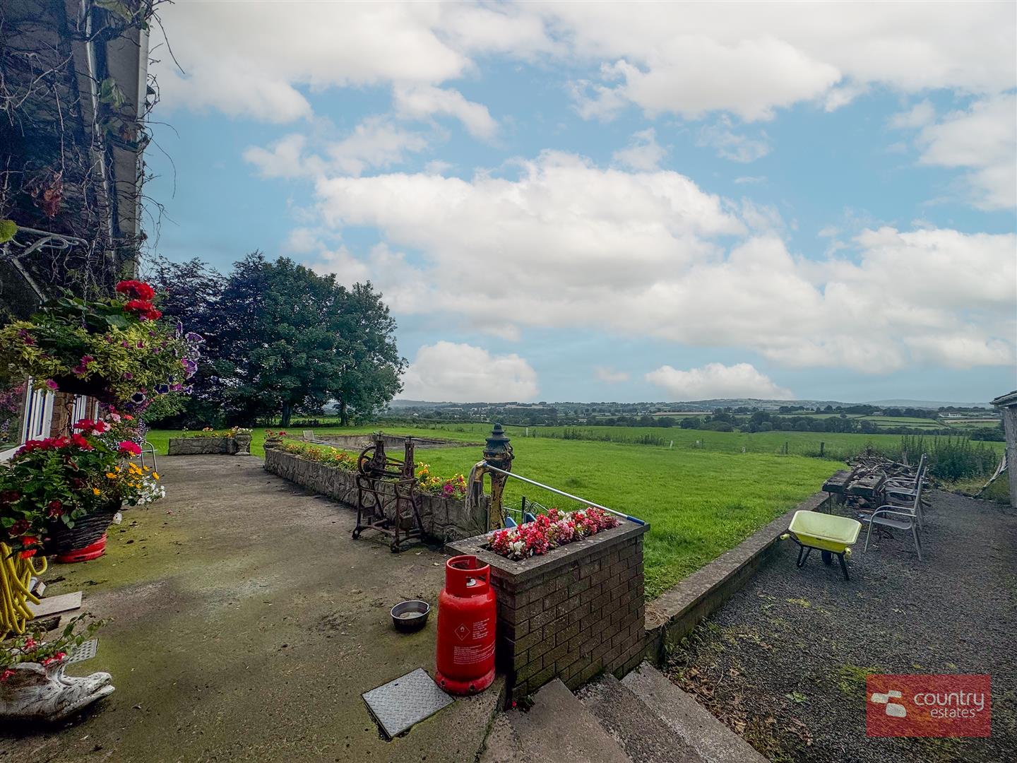 Large patio to rear with views over the surrounding countryside and raised concrete flower beds.