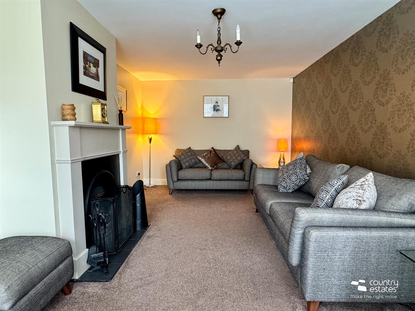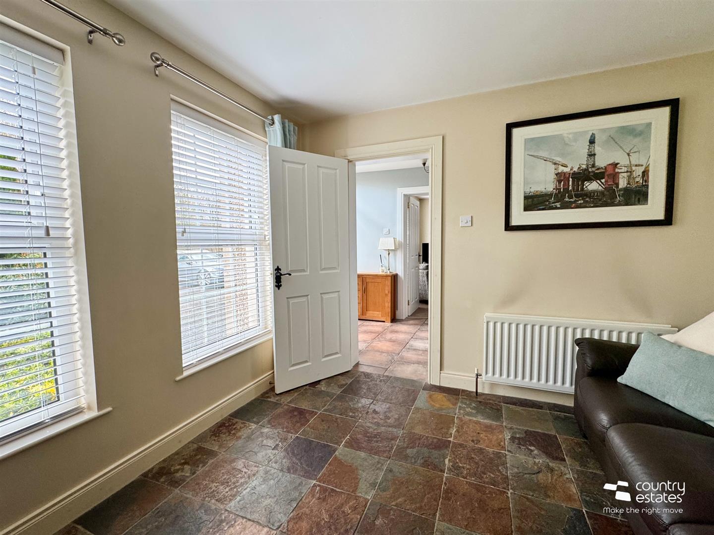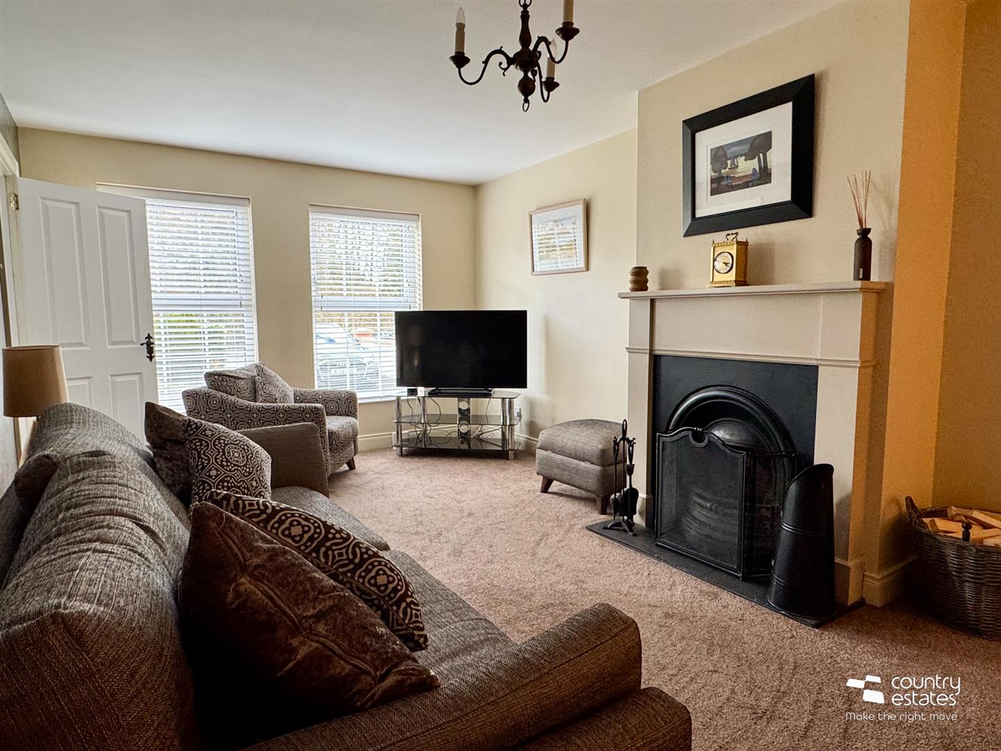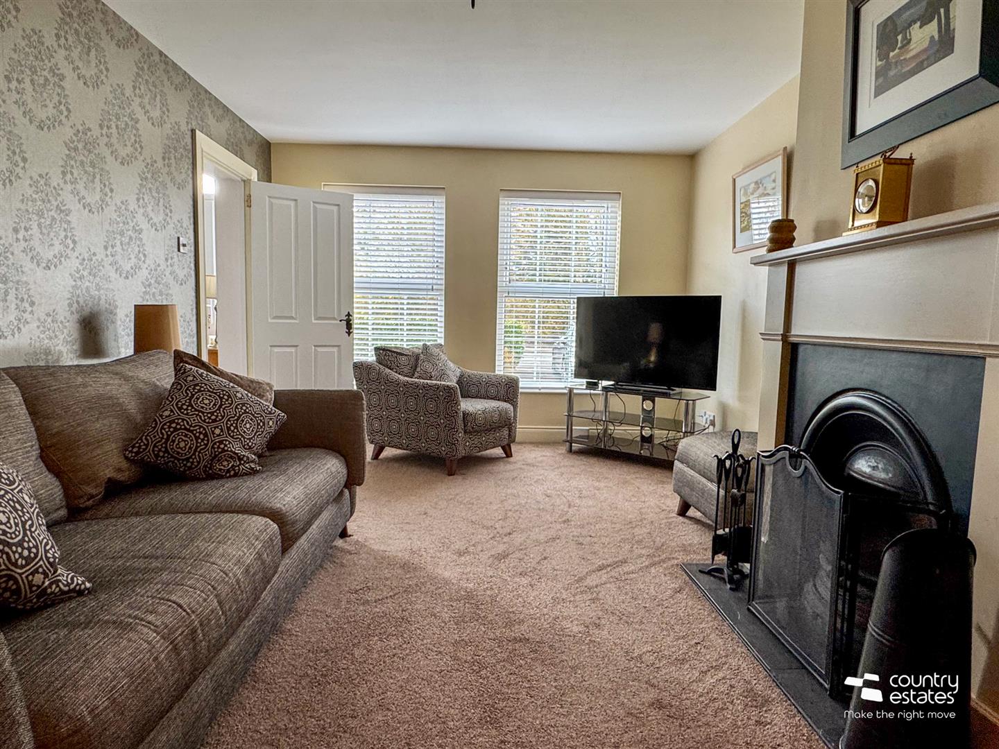 Attractive cast iron horse shoe style open fireplace with painted wooden surround and slate hearth. Dual window aspect.