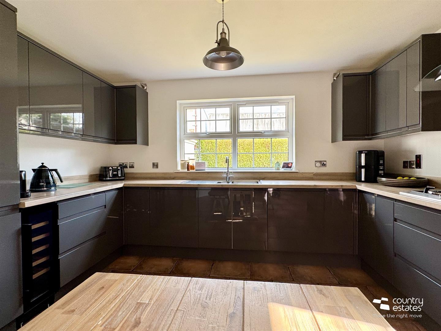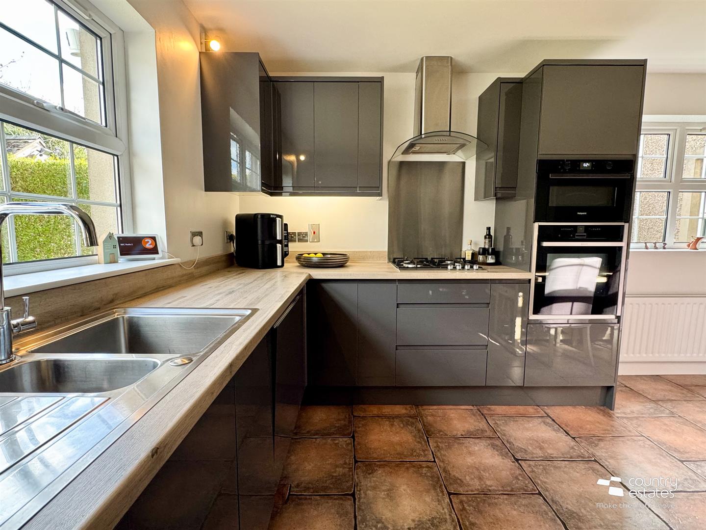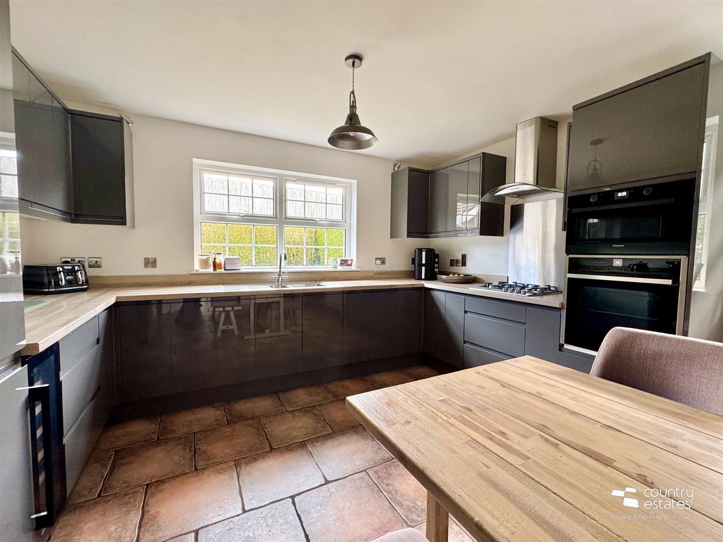 Recently installed. Equipped with a comprehensive range of high and low level modern gloss units with contrasting 'natural' wood effect work surfaces and upstands. Inlaid single drainer stainless steel sink unit with mixer tap. A range of Integrated appliances including eye level oven with separate 4 ring gas hob. Overhead extractor fan housed in stainless steel chimney with glass hood and stainless steel splashback. Fridge/ freezer and dishwasher. Pull out larder style full height cupboard.