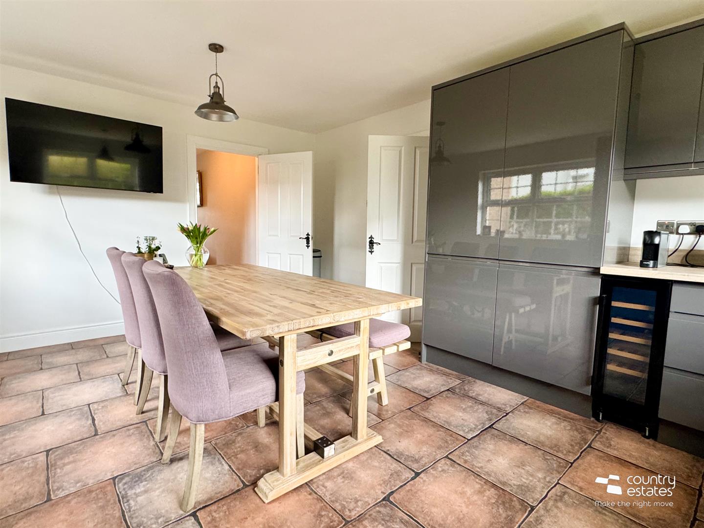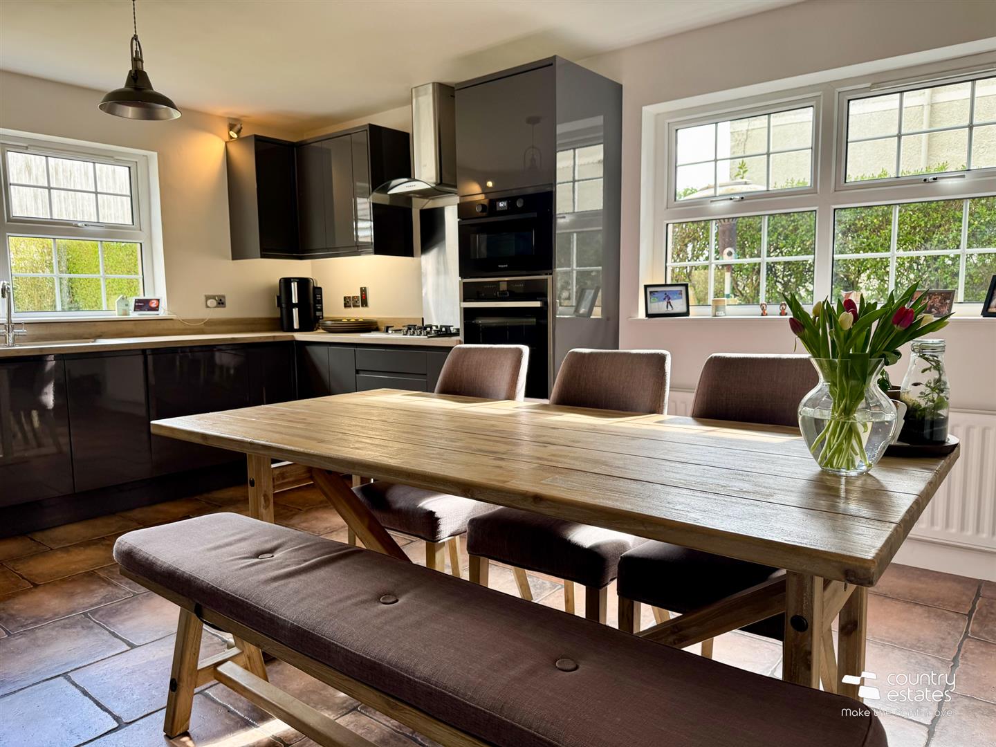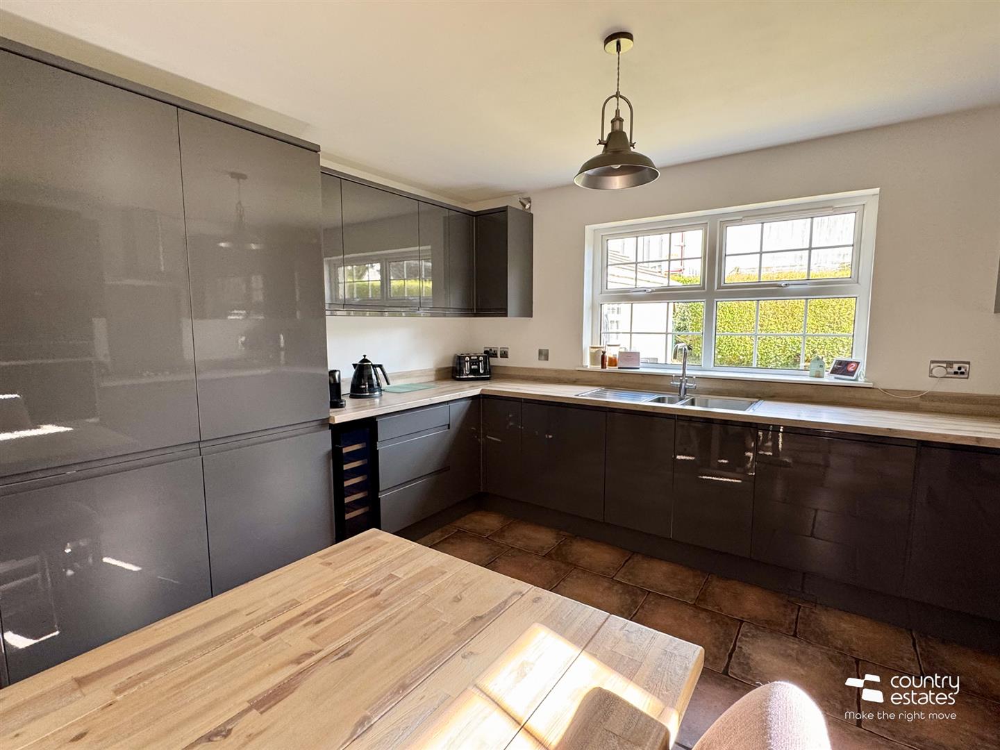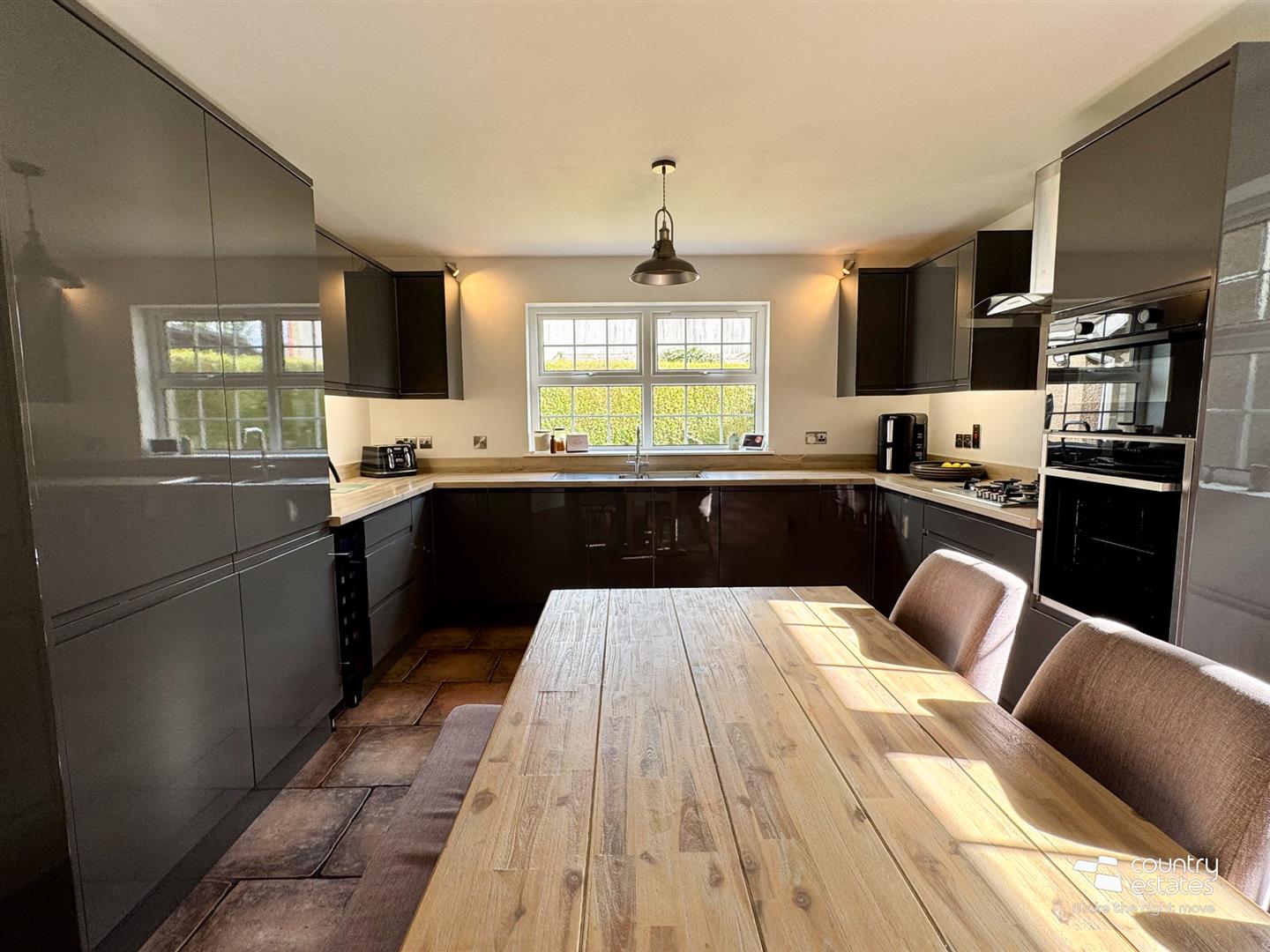 Recently installed. Equipped with a comprehensive range of high and low level modern gloss units with contrasting 'natural' wood effect work surfaces and upstands. Inlaid single drainer stainless steel sink unit with mixer tap. A range of Integrated appliances including eye level oven with separate 4 ring gas hob. Overhead extractor fan housed in stainless steel chimney with glass hood and stainless steel splashback. Fridge/ freezer and dishwasher. Pull out larder style full height cupboard.