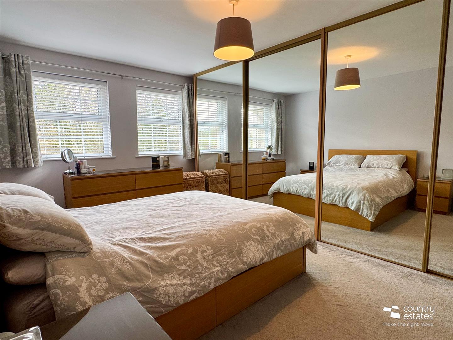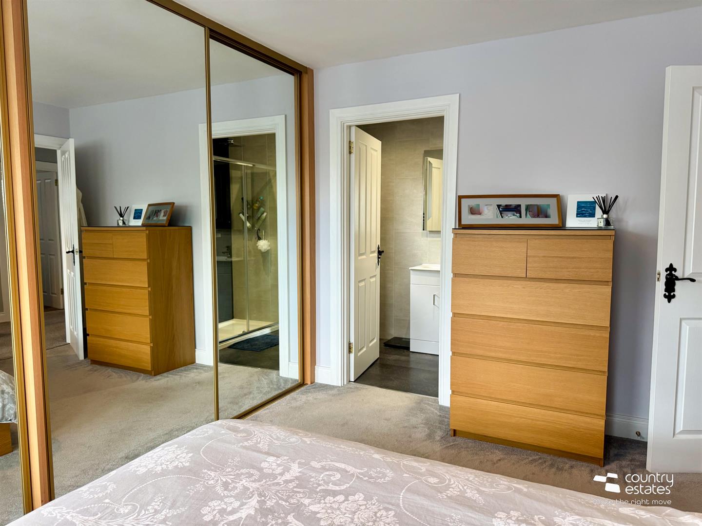 Built in range of bespoke fitted modern bedroom furniture including twin double wardrobes with matching overhead storage bays. Fixed writing desk/ dressing table with matching fitted two bay chest drawers.