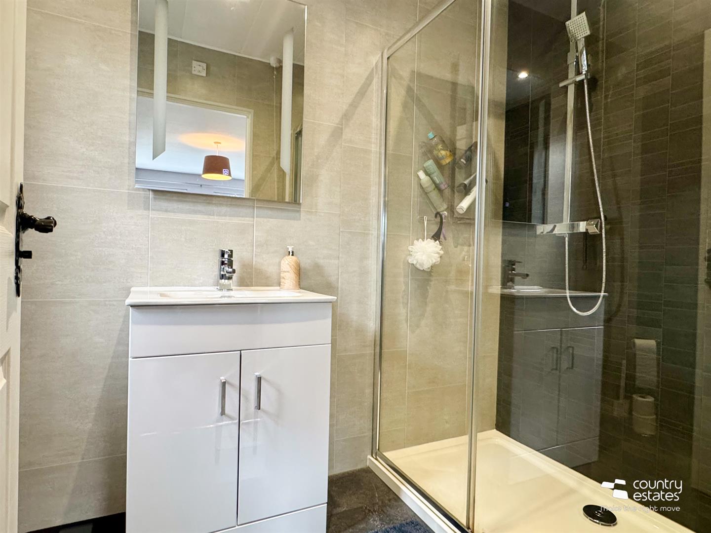 Comprising modern gloss white vanity unit with monobloc tap, button flush w.c. and large full width shower enclosure with drench style shower and hand shower attachment. PVC ceiling. Stone effect PVC panelled walls.