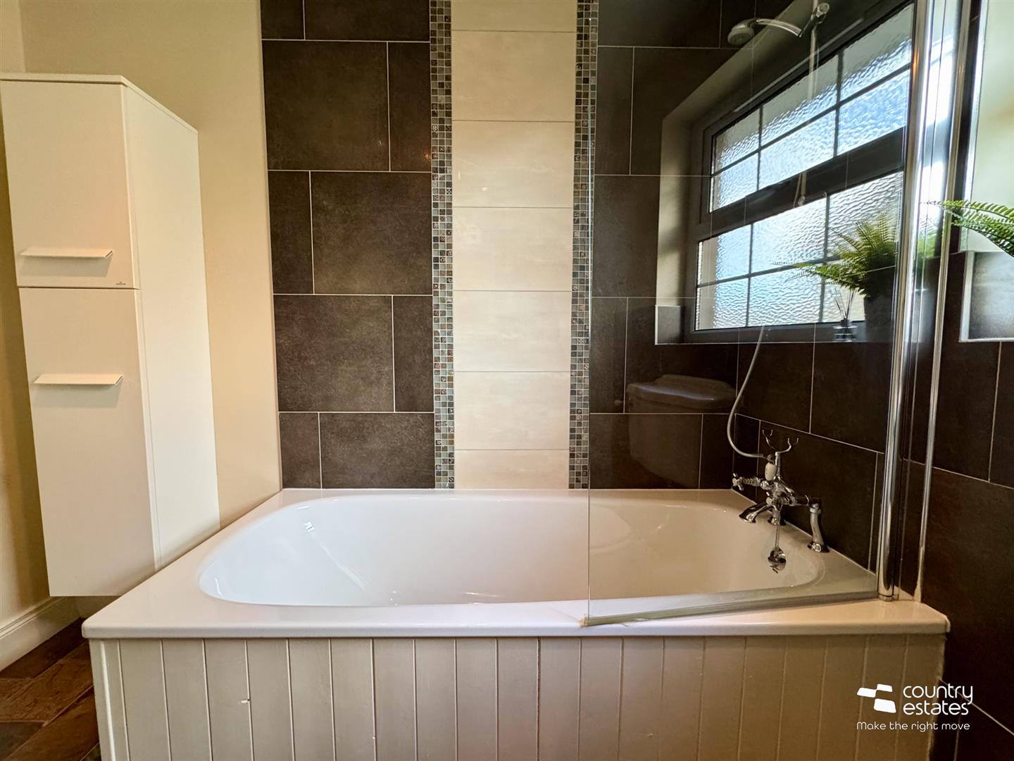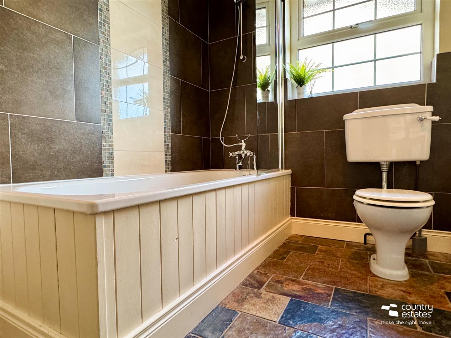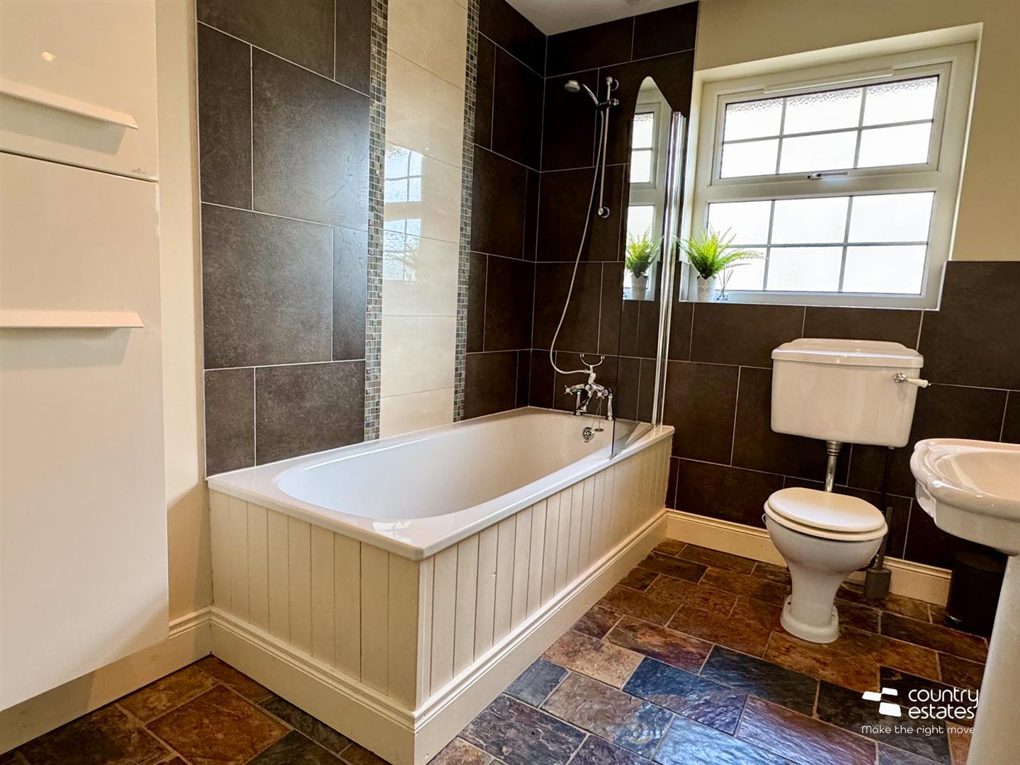 Comprising low flush w.c, pedestal wash hand basin with feature tiled accent panel, boxed panelled bath with fixed shower screen and shower attachment. Complementary wall tiling. Tiled floor.