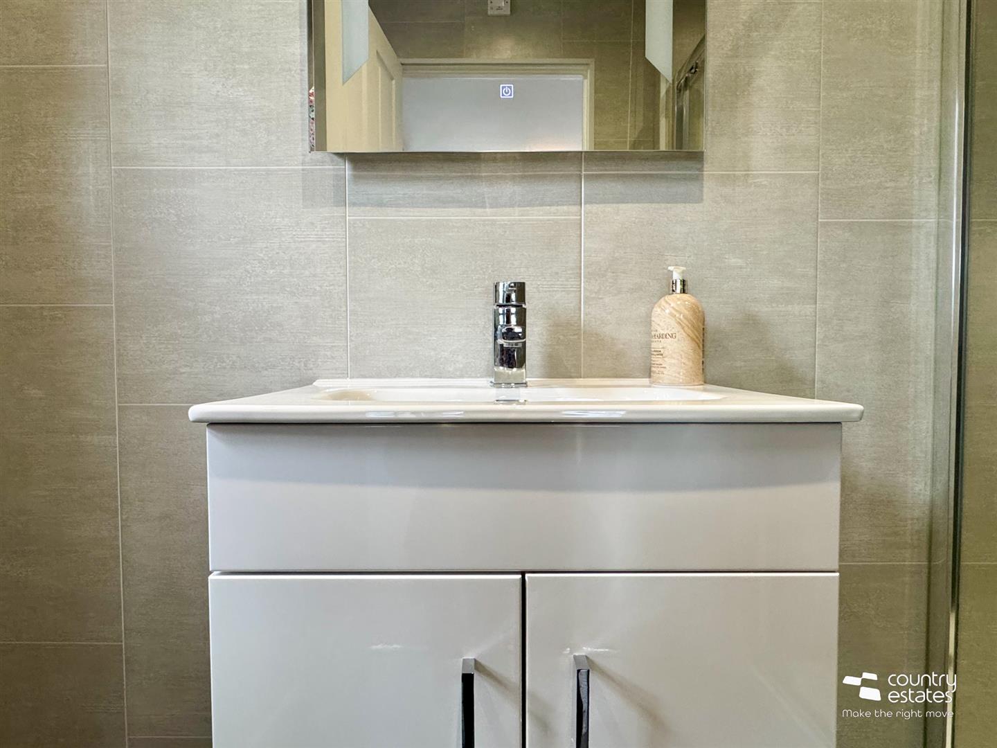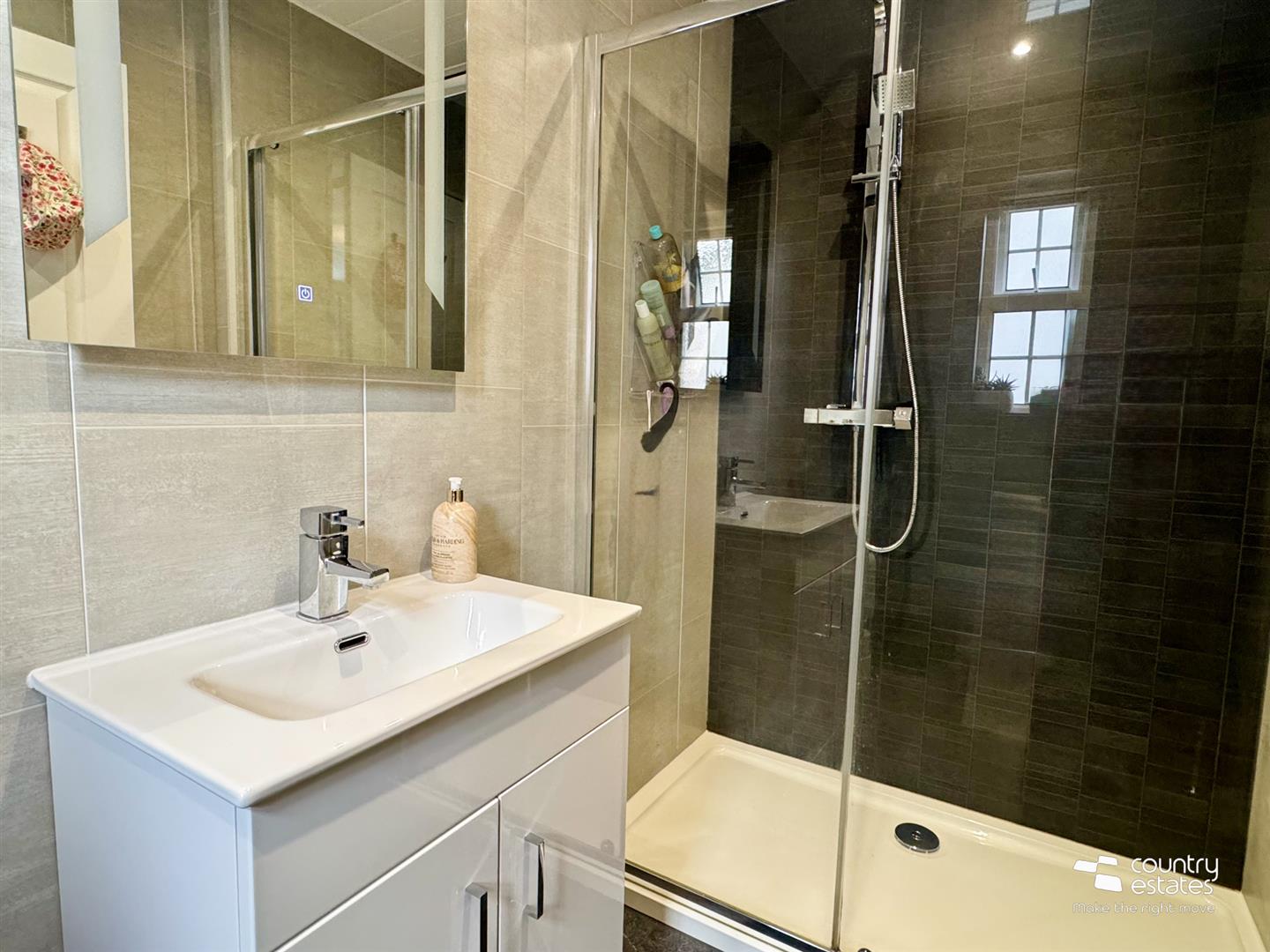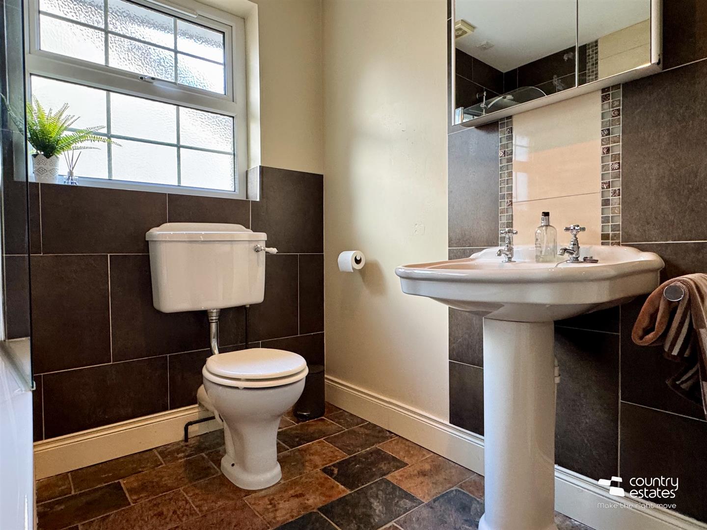 Comprising low flush w.c, pedestal wash hand basin with feature tiled accent panel, boxed panelled bath with fixed shower screen and shower attachment. Complementary wall tiling. Tiled floor.