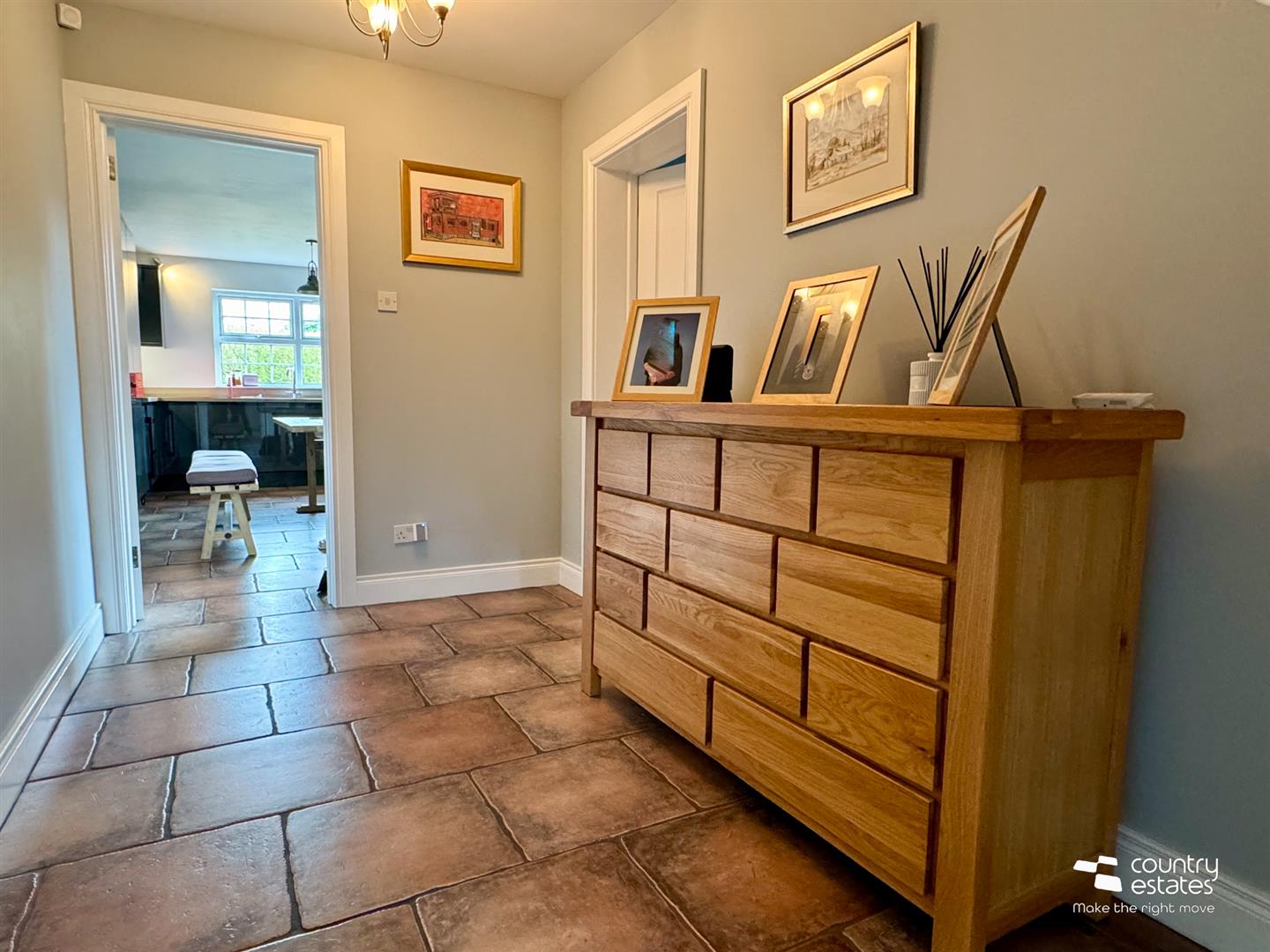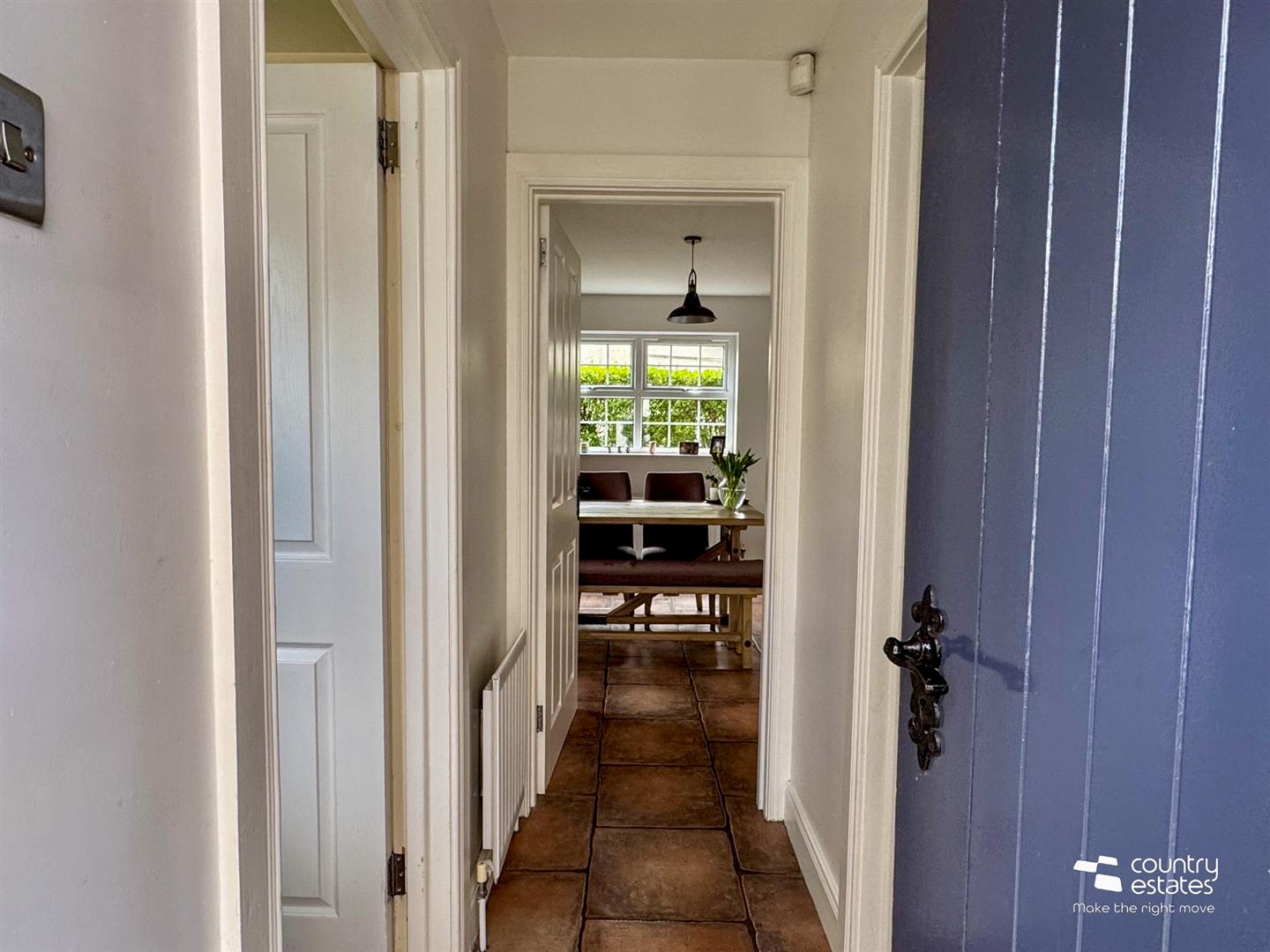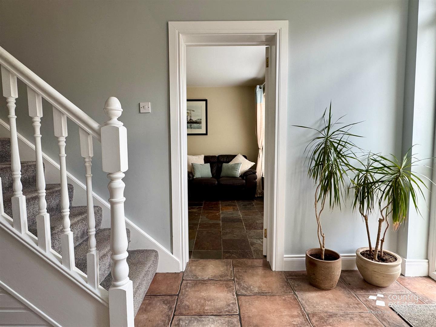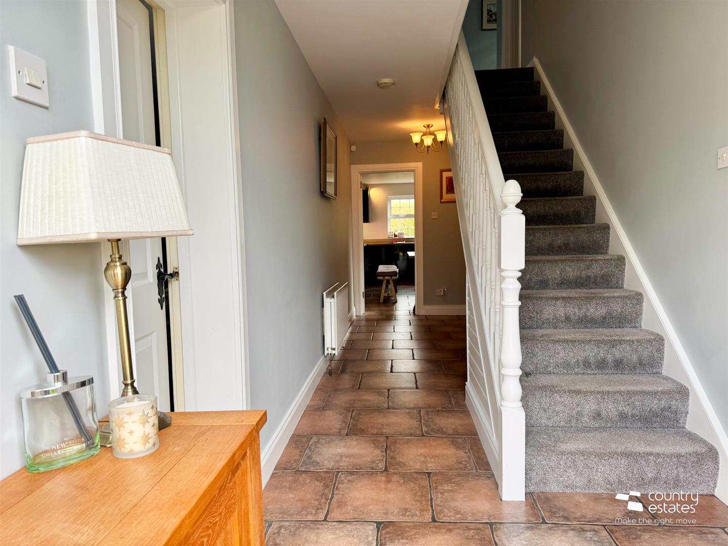 Open understairs recess. Tiled floor extending into kitchen/ dining.