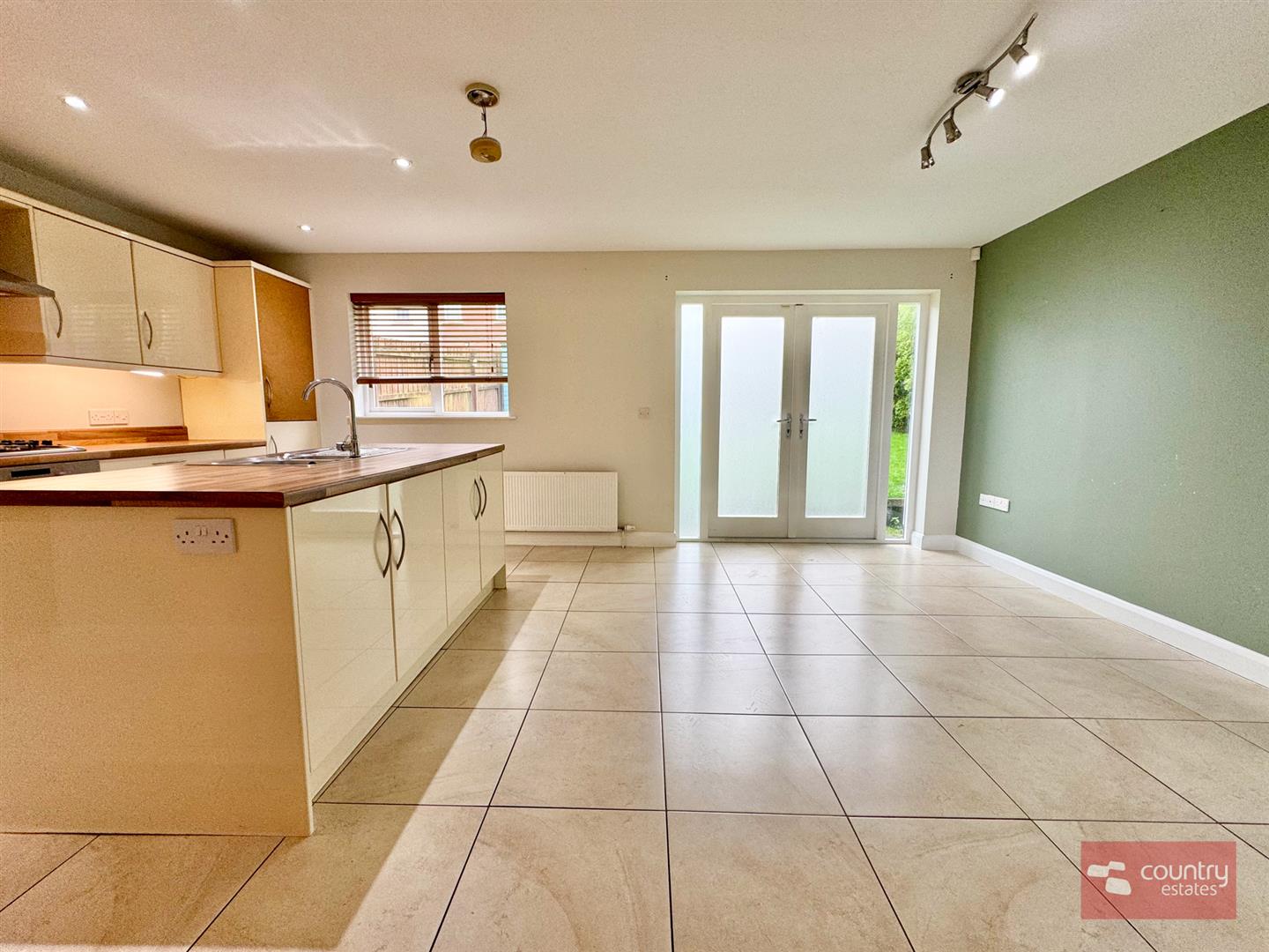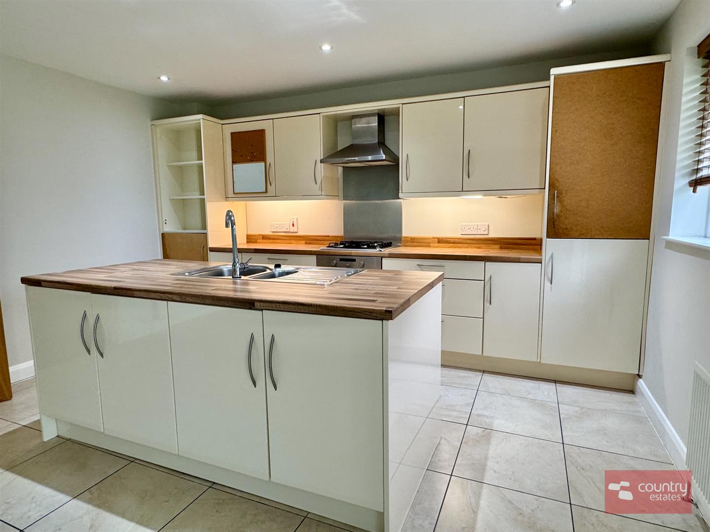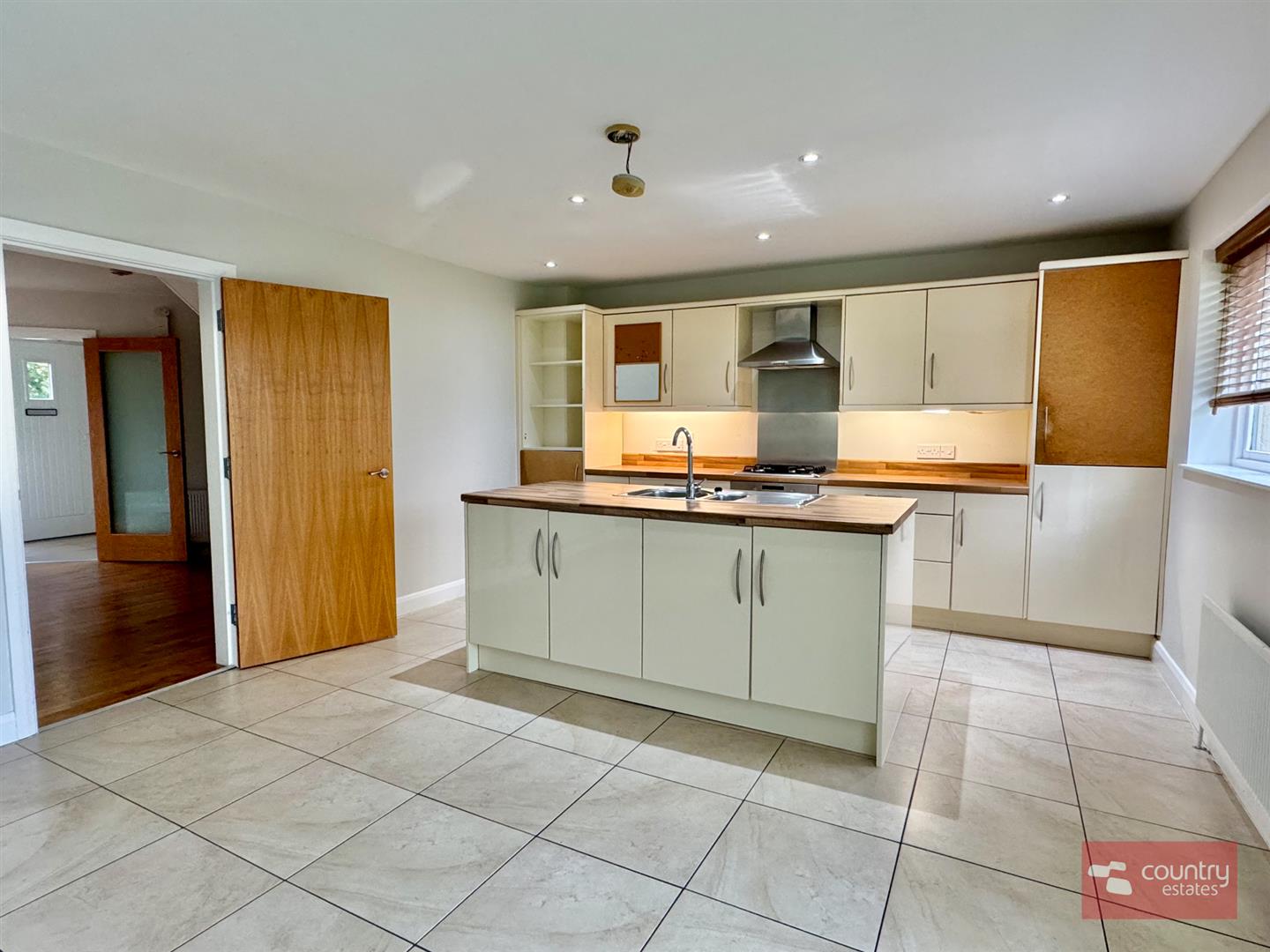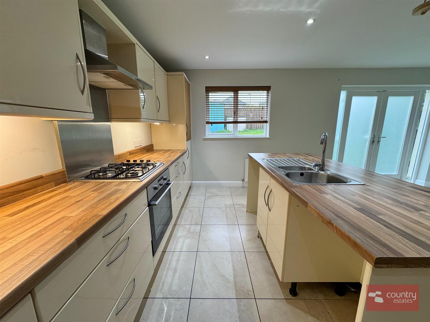 Equipped with a comprehensive range of high and low level modern fitted units in cream gloss with co-ordinating work surfaces. Built in 4 ring gas hob with under bench oven and overhead stainless steel extractor fan. Fixed centre island with inlaid stainless steel sink unit with mixer tap and storage cupboards. Integrated fridge/freezer. Space for freestanding dishwasher. Plumbed for automatic washing machine. Ceramic tiled flooring. French doors to enclosed rear garden.