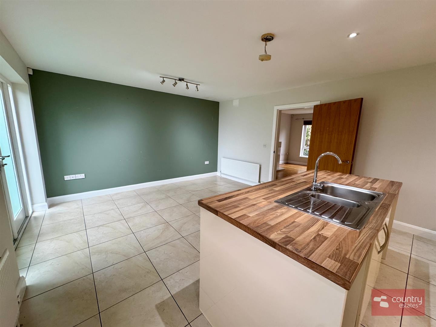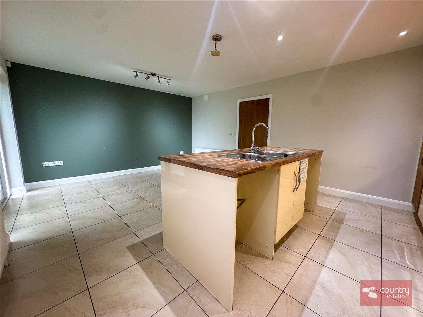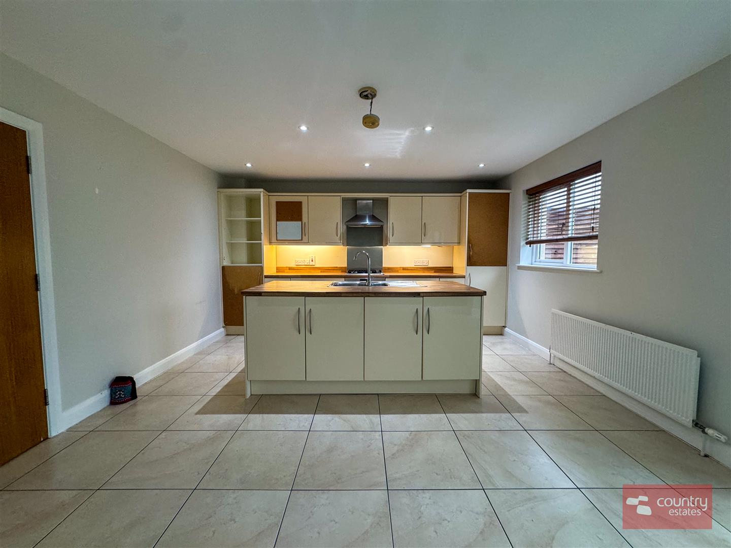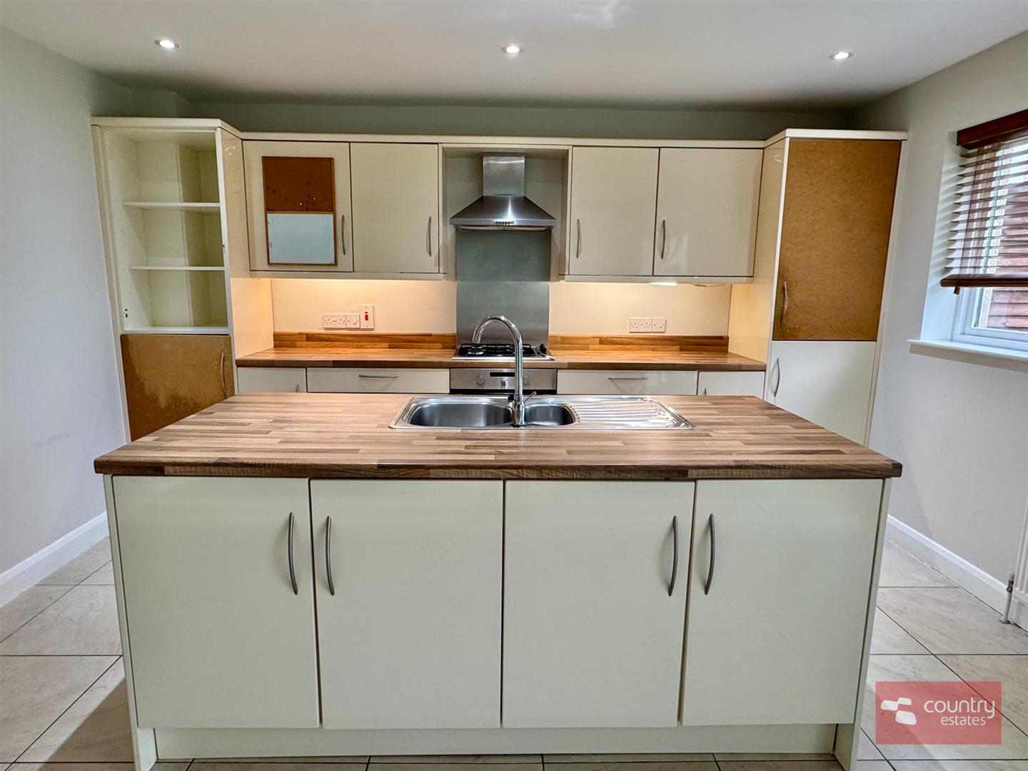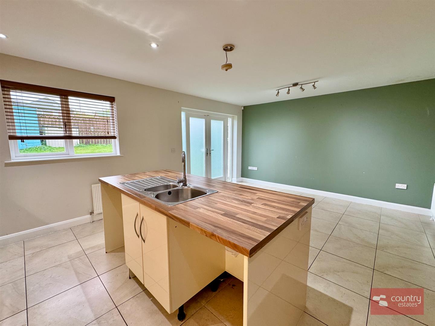 Equipped with a comprehensive range of high and low level modern fitted units in cream gloss with co-ordinating work surfaces. Built in 4 ring gas hob with under bench oven and overhead stainless steel extractor fan. Fixed centre island with inlaid stainless steel sink unit with mixer tap and storage cupboards. Integrated fridge/freezer. Space for freestanding dishwasher. Plumbed for automatic washing machine. Ceramic tiled flooring. French doors to enclosed rear garden.