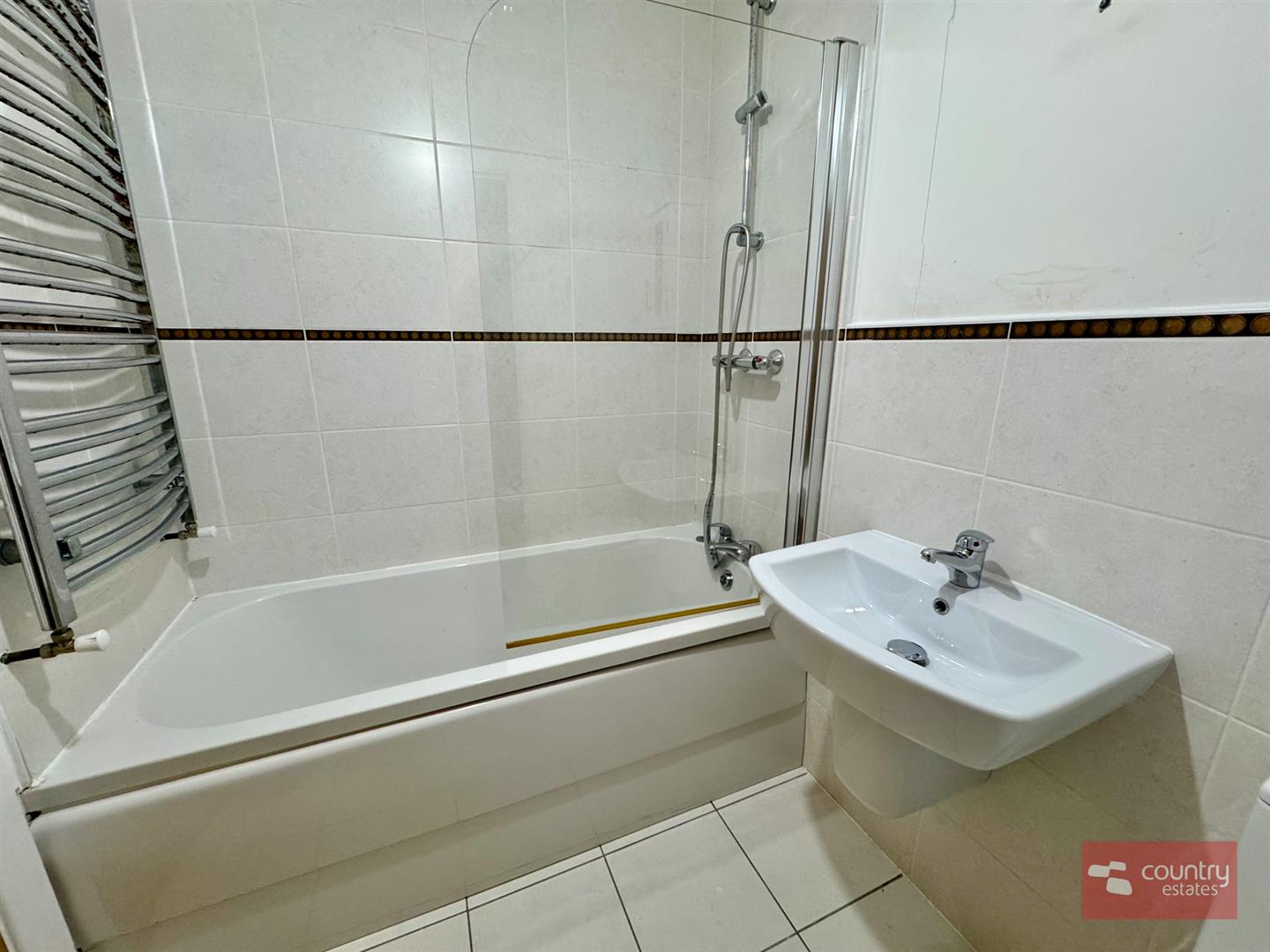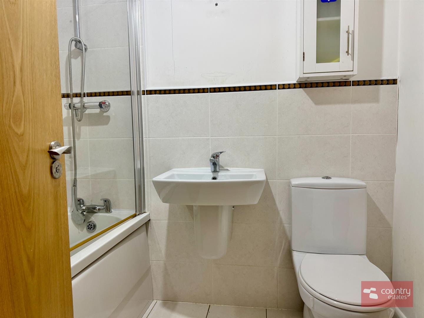 Comprising paneled bath with fixed shower screen. Thermostatically controlled shower. Button flush w.c. Modern gloss vanity unit with wash hand basin and tiled splashback. Fitted mirror with storage cupboard. Heated towel rail. Decorative wall tiling. Tiled floor.