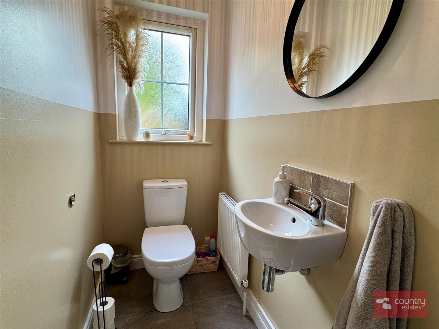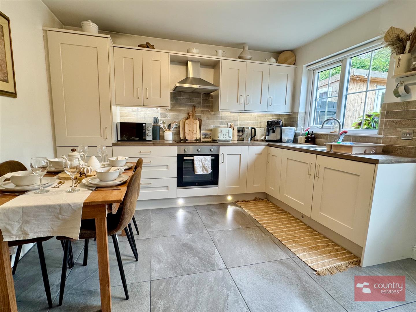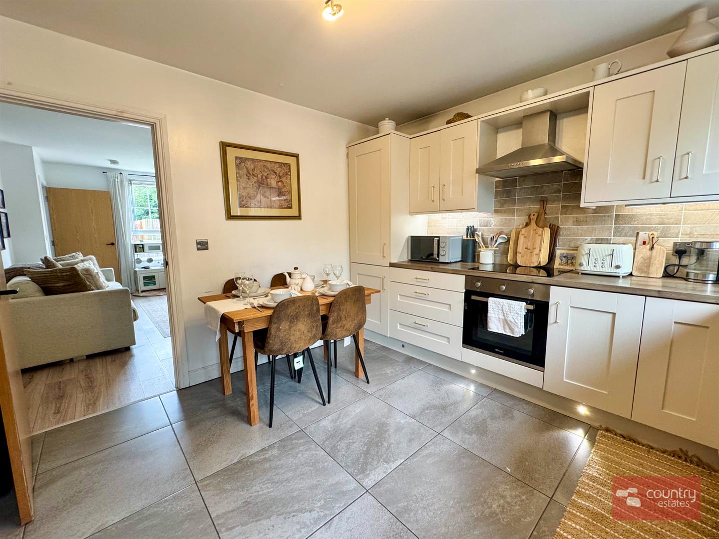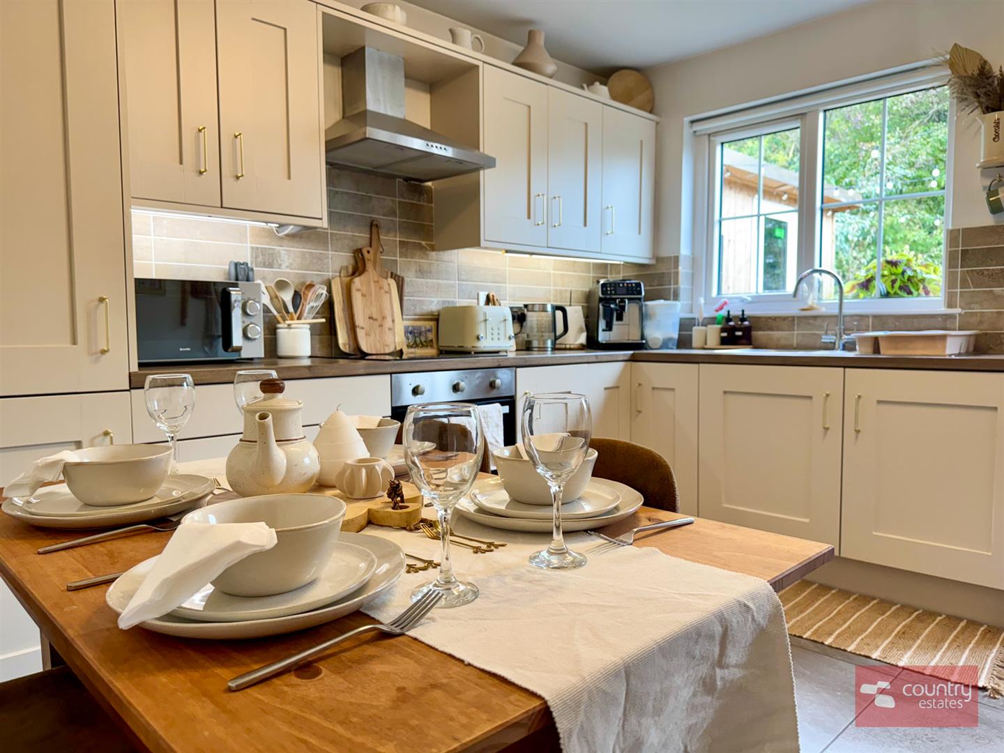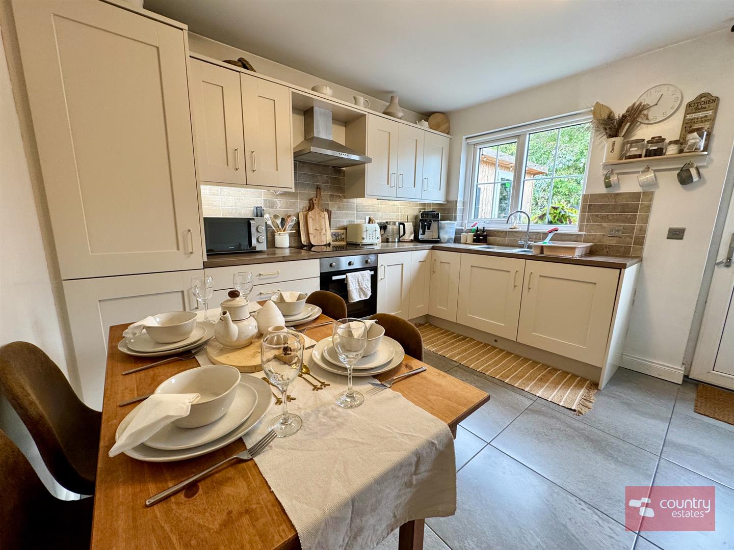 Equipped with a comprehensive range of high and low level fitted shaker style units with contrasting wood effect work surfaces. Single drainer stainless steel sink unit with swan neck tap. Integrated oven with four ring hob and overhead extractor fan housed in stainless steel canopy. Integrated fridge freezer. Tiled floor. Complementary wall tiling.