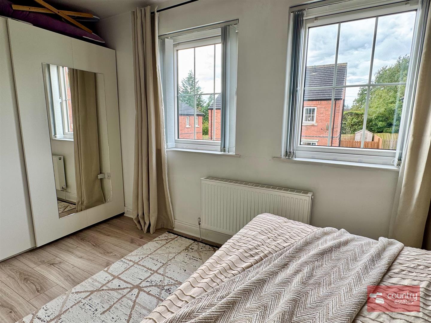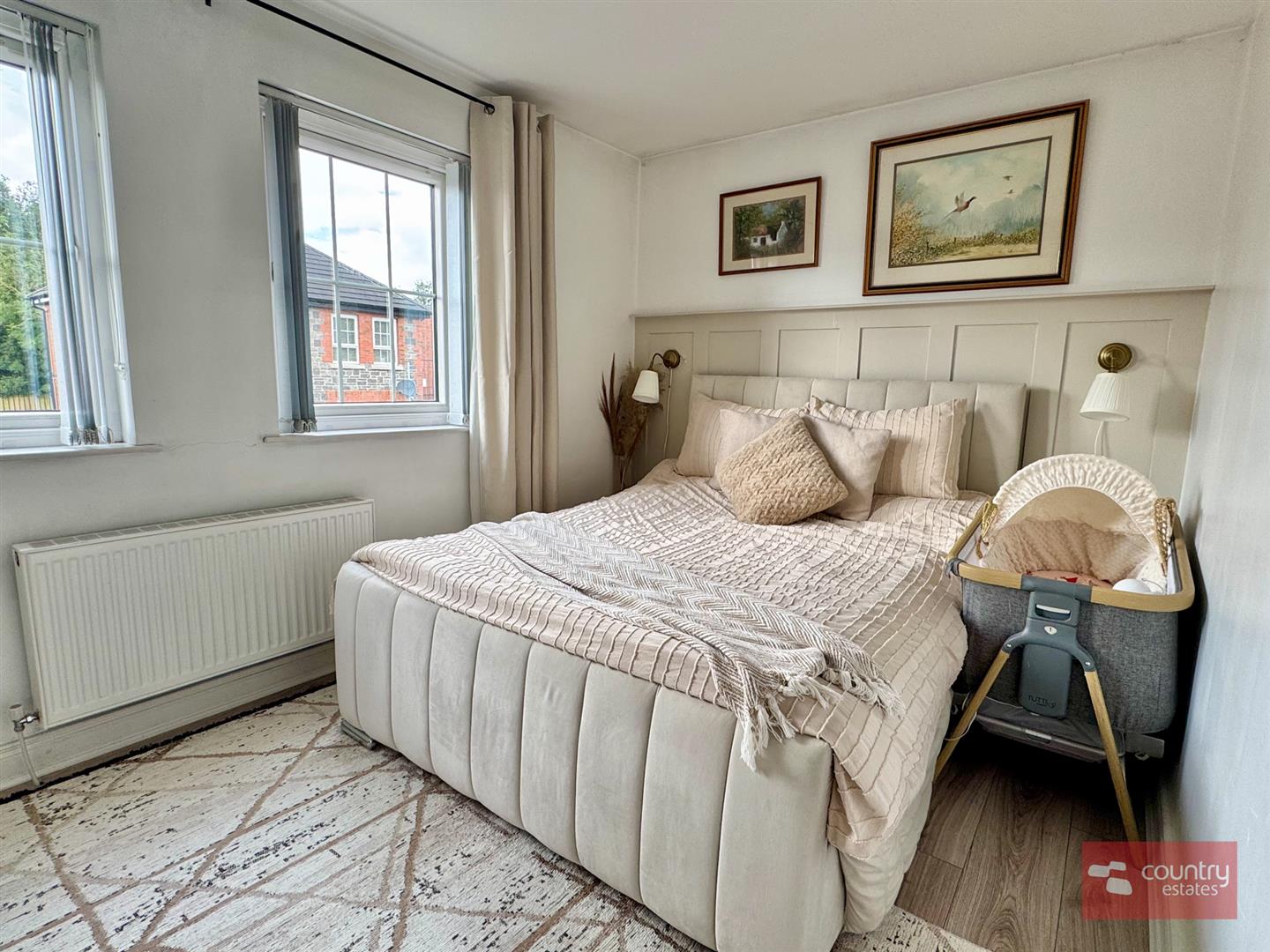 Dual window aspect. Feature accent part panelled wall with twin fitted bedside lights. Quality laminate plank flooring.