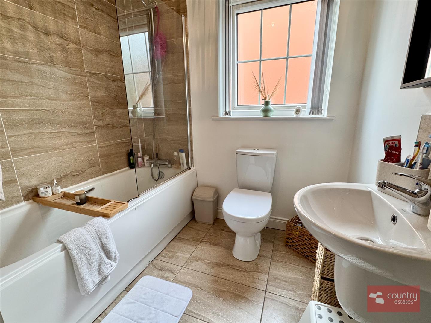 Comprising button flush w.c, semi pedestal wash hand basin with monobloc tap and tiled splashback and panelled bath with fixed shower screen and shower attachment. Tiled floor. Complementary wall tiling.
