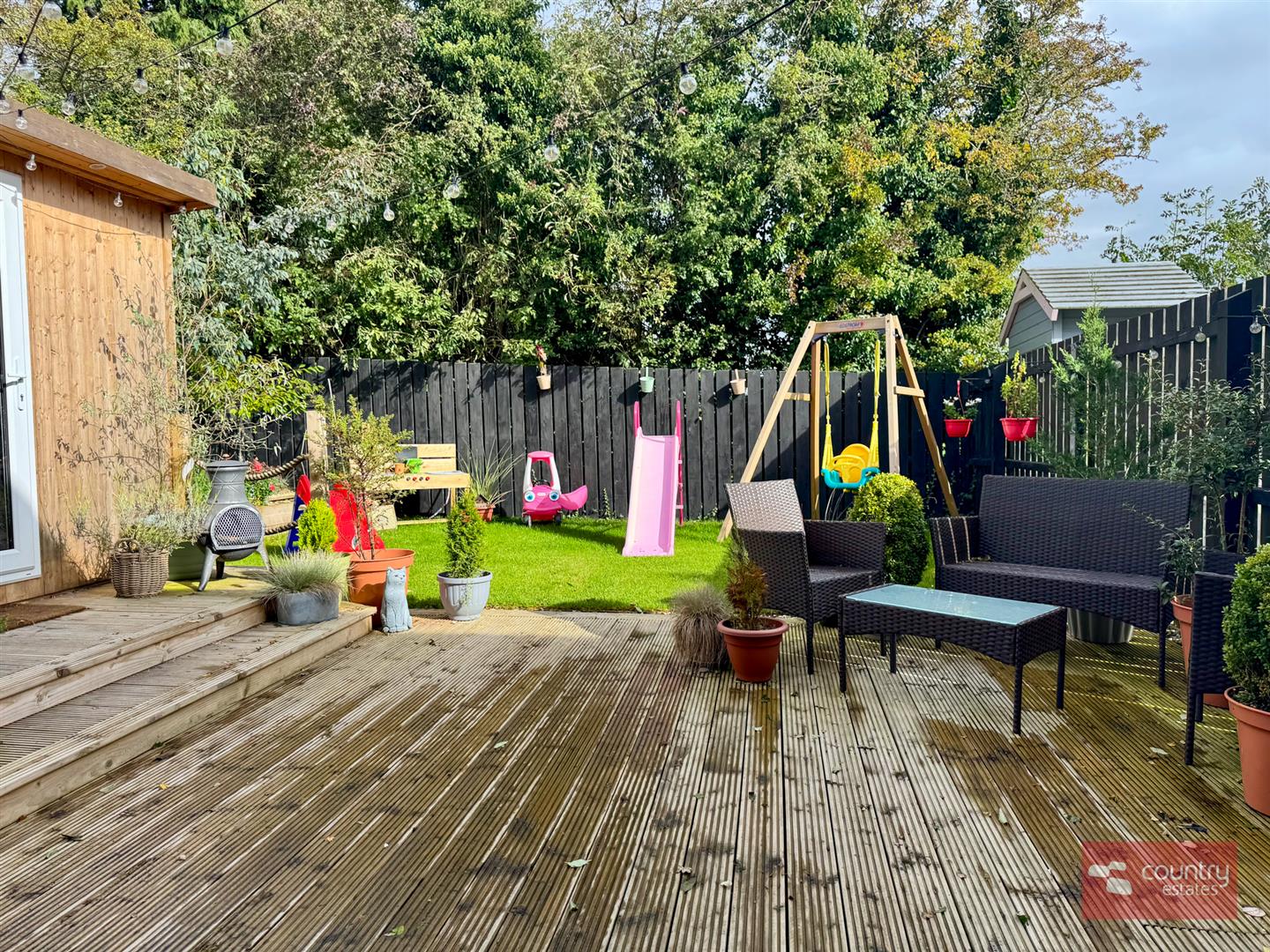 Private enclosed garden to rear screened by perimeter fence. Laid in neat lawn with extensive decked area. Perfect for family barbecues.