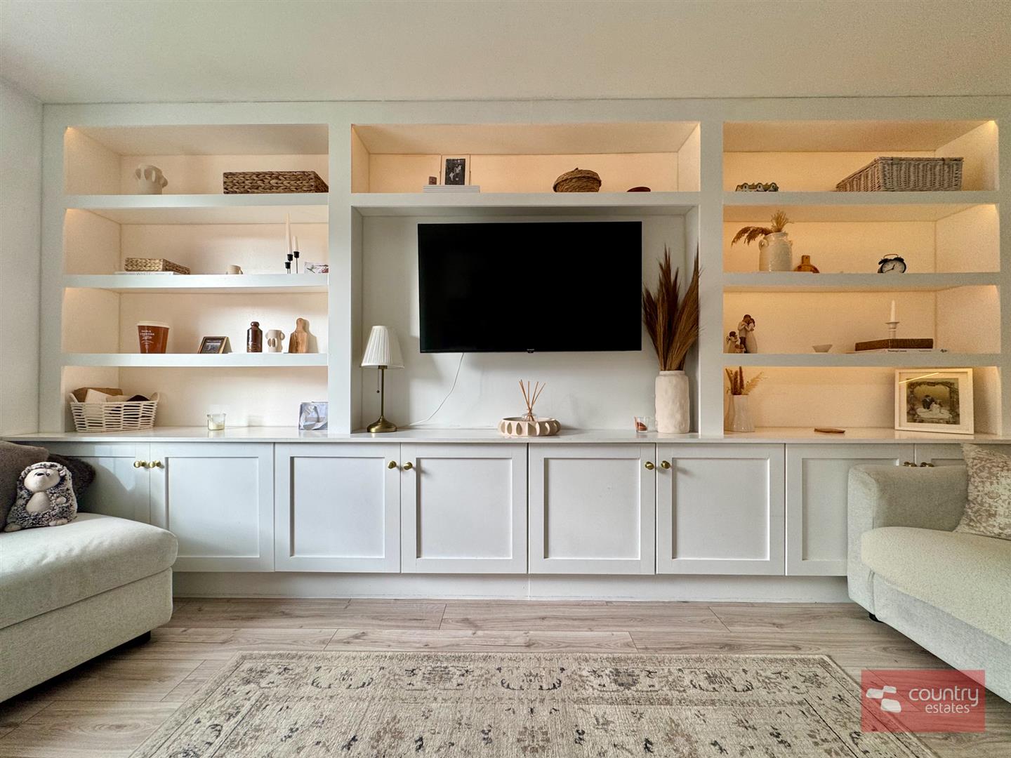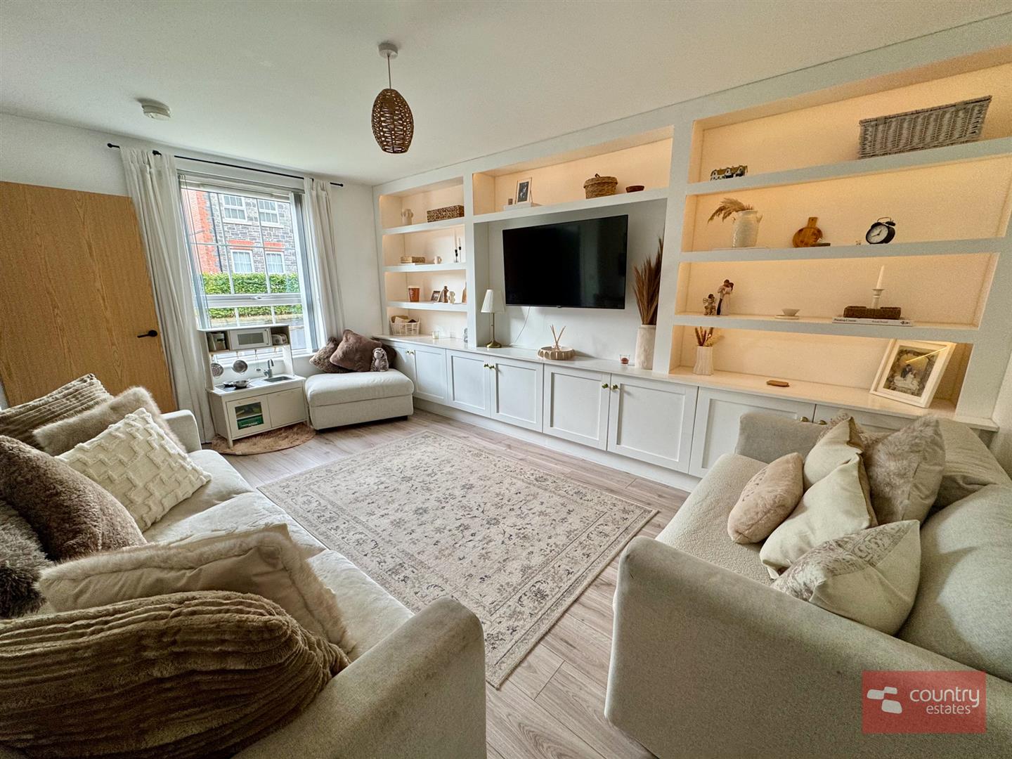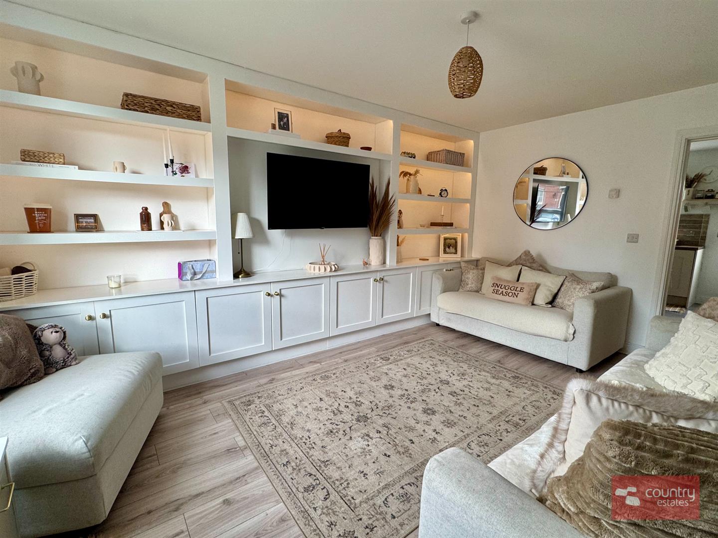 Feature wall with bespoke fitted low level storage bays and fixed four tier display shelves. Quality laminate plank flooring. Understair storage cupboard.