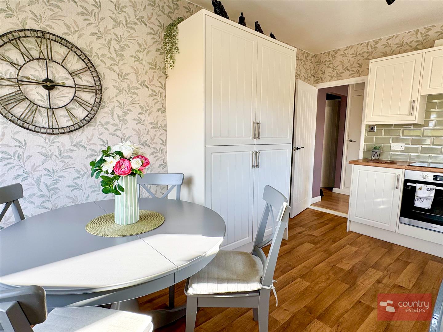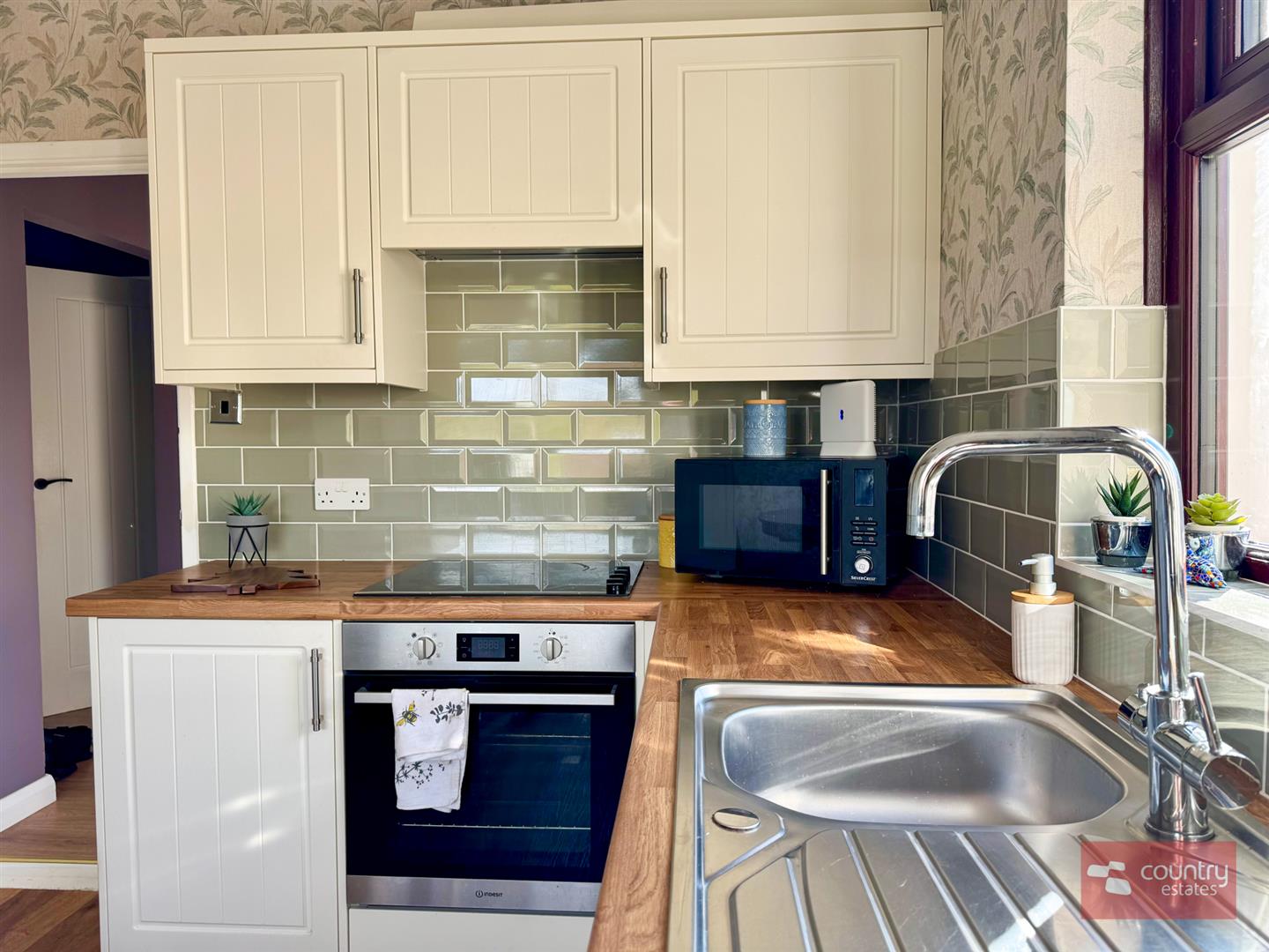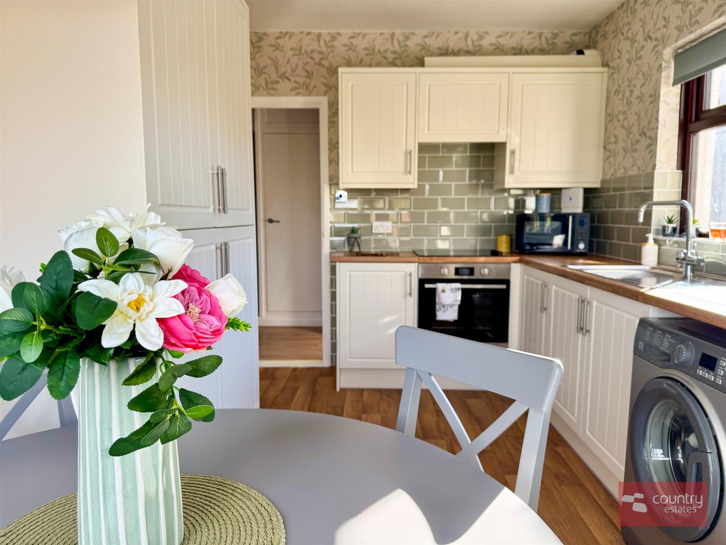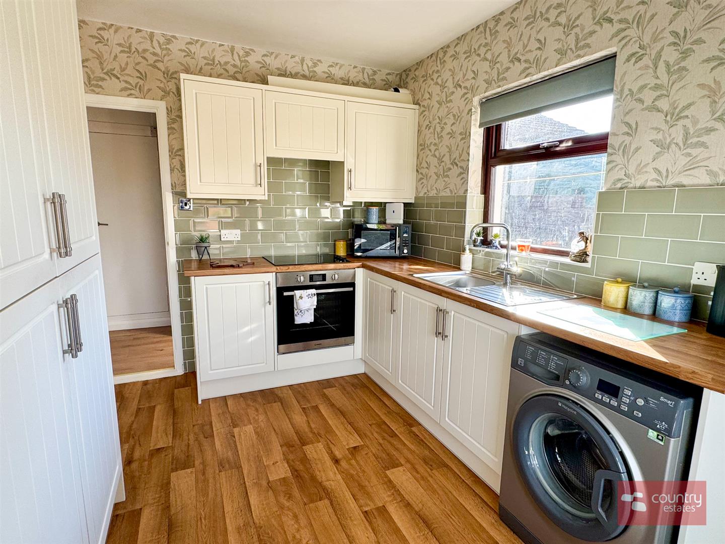 MODERN FITTED KITCHEN WITH CASUAL DINING AREA 14'7" X 9'4" (4.45m X 2.84m) Equipped with a comprehensive range of high and low level modern fitted units with contrasting wood effect work surfacces. Single drainer stainless steel sink unit with mixer hot tap. Integrated oven with four ring hob concealed overhead extractor fan. Integrated fridge/ freezer. Plumbed for washing machine. Part tiled walls in metro brick tile. Dual window aspect.