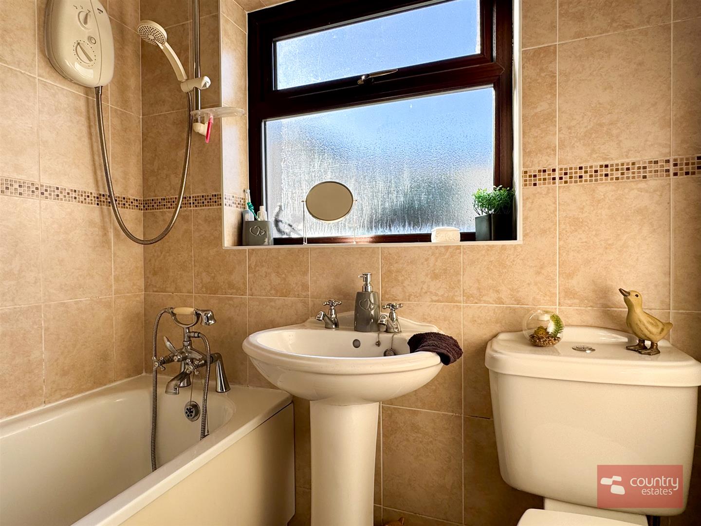 FAMILY BATHROOM Comprising panelled bath with telephone shower attachment and electric shower unit over, pedestal wash hand basin and button flush WC. Tiled floor. Fully tiled walls.