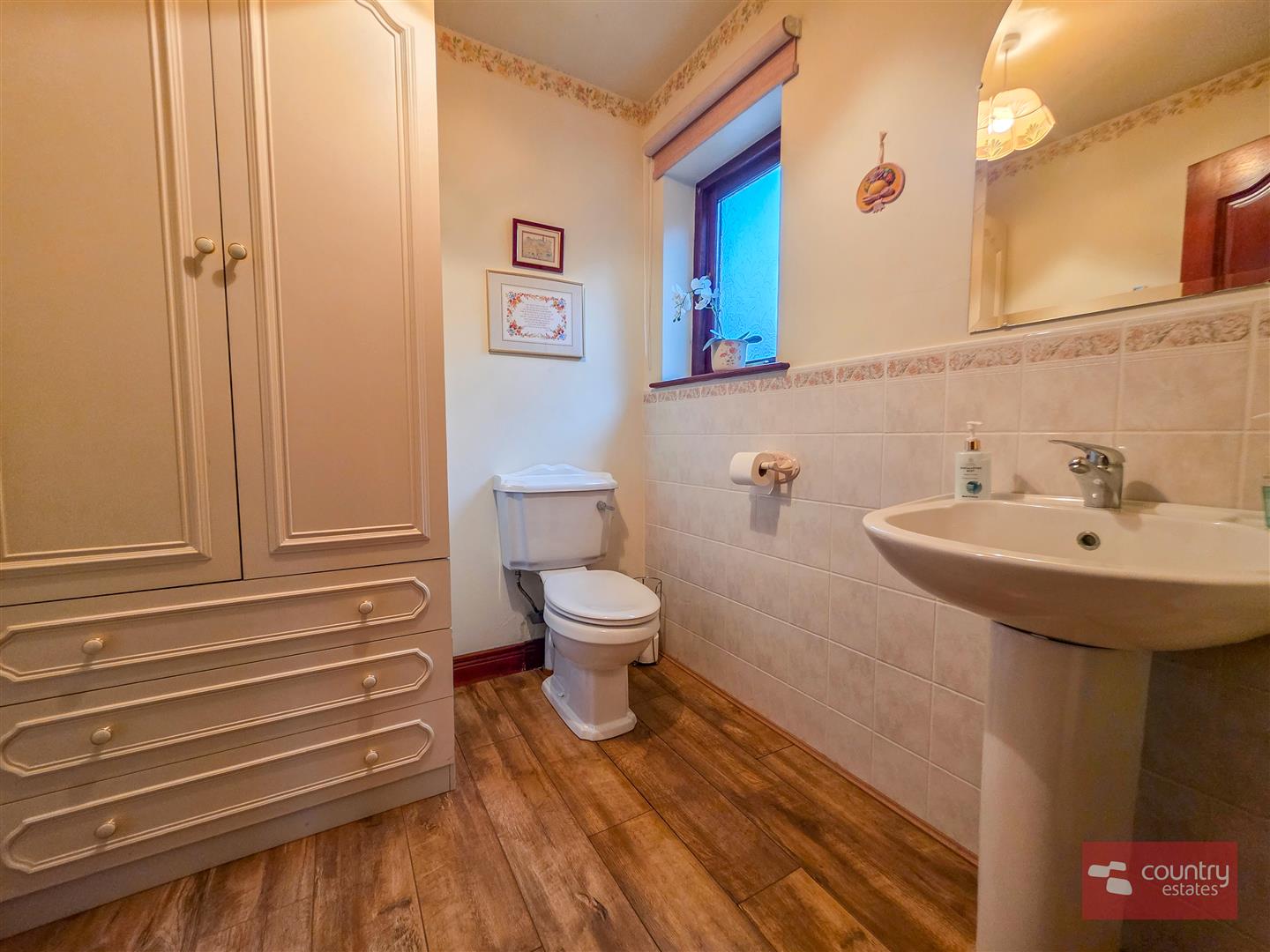 As part of Bedroom 1: Comprising quadrant shower cubicle with thermostatically controlled shower, pedestal wash hand basin with monobloc tap and a button flush WC. PVC panelled walls. Velux window. Storage into the eaves.
