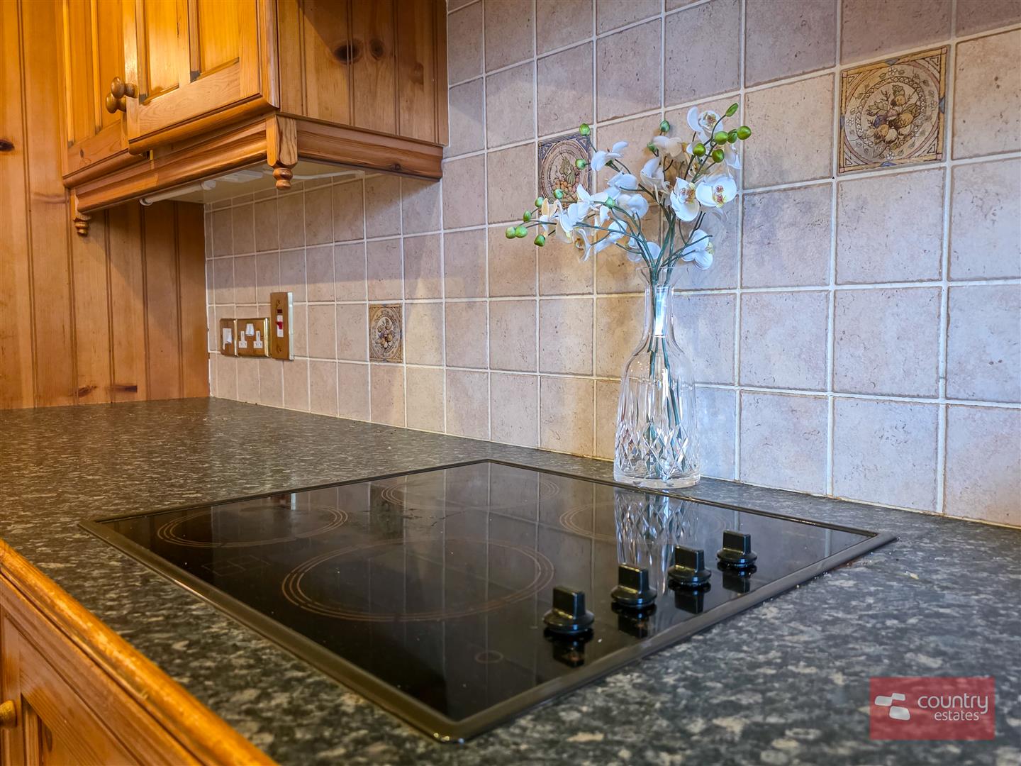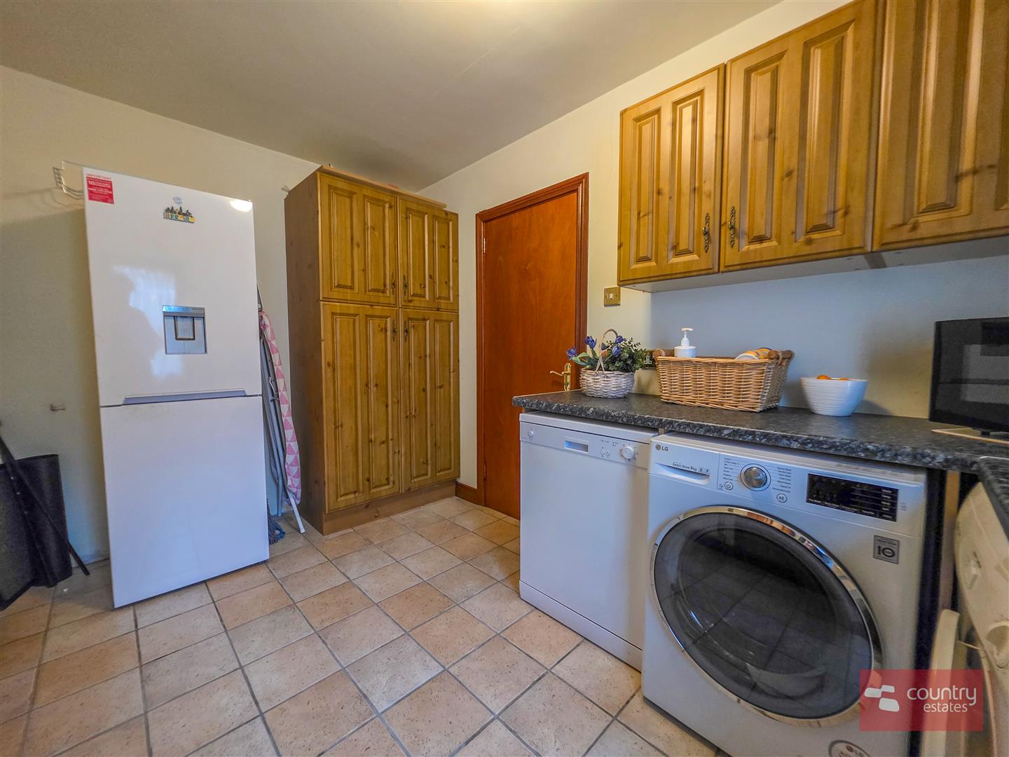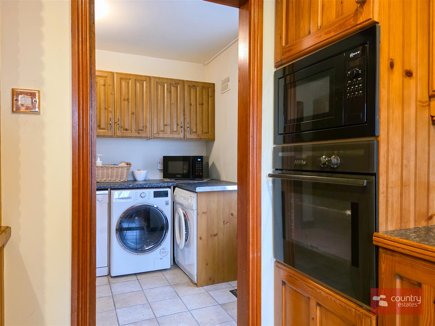 Equipped with fitted storage units and contrasting work surfaces. Plumbed for washing machine. Plumbed for dishwasher. Vented for tumble dryer. Tiled floor. Hardwood double glazed door to side. Service door to integral garage.