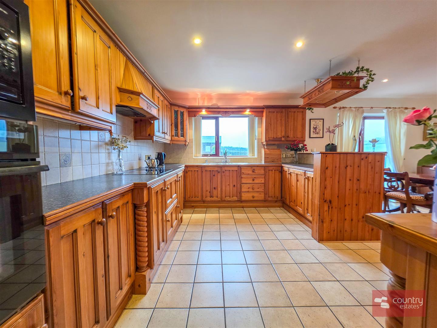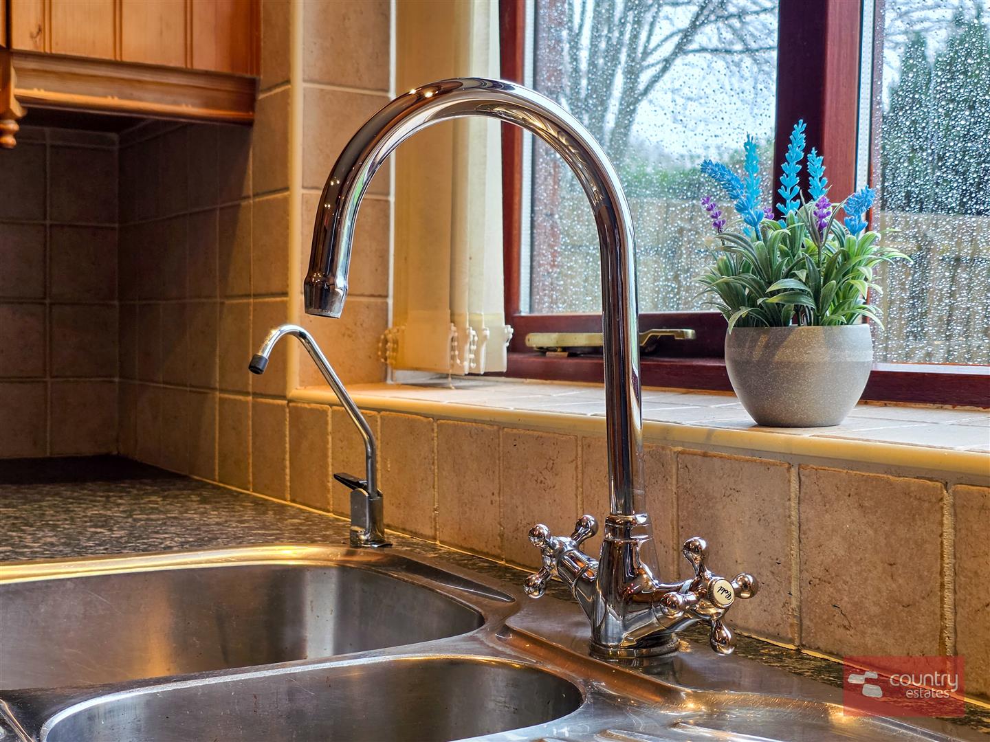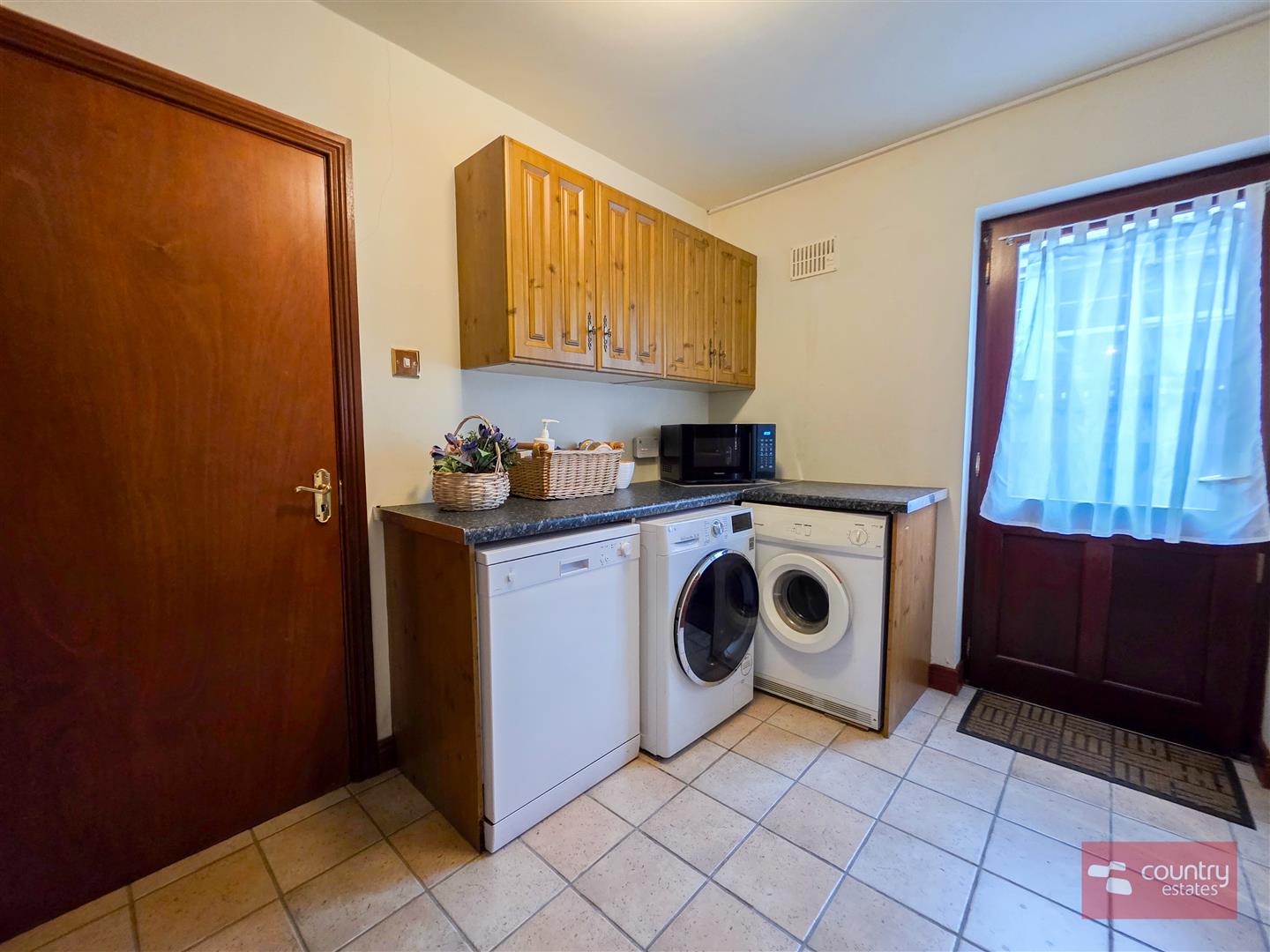 Equipped with fitted storage units and contrasting work surfaces. Plumbed for washing machine. Plumbed for dishwasher. Vented for tumble dryer. Tiled floor. Hardwood double glazed door to side. Service door to integral garage.