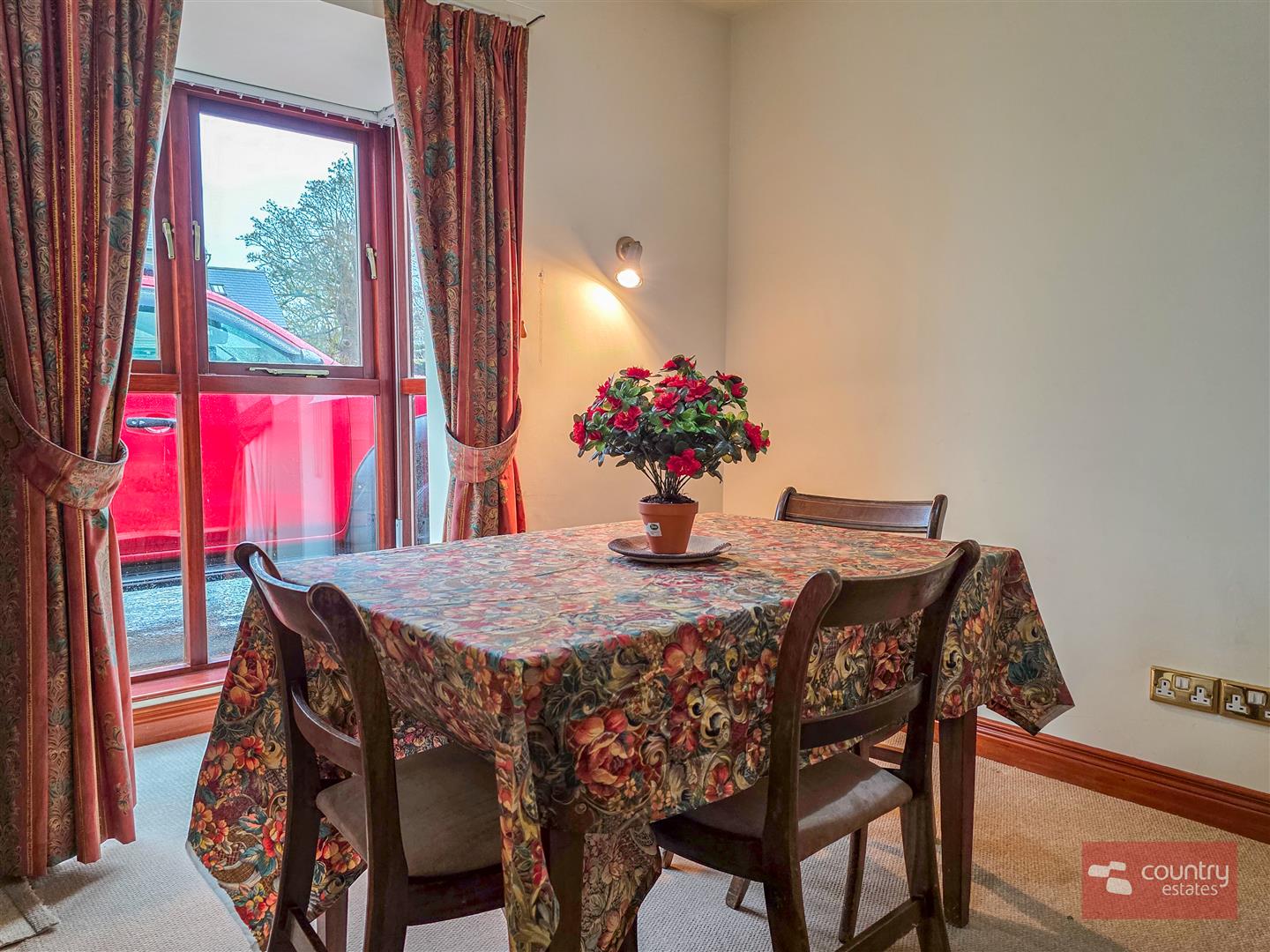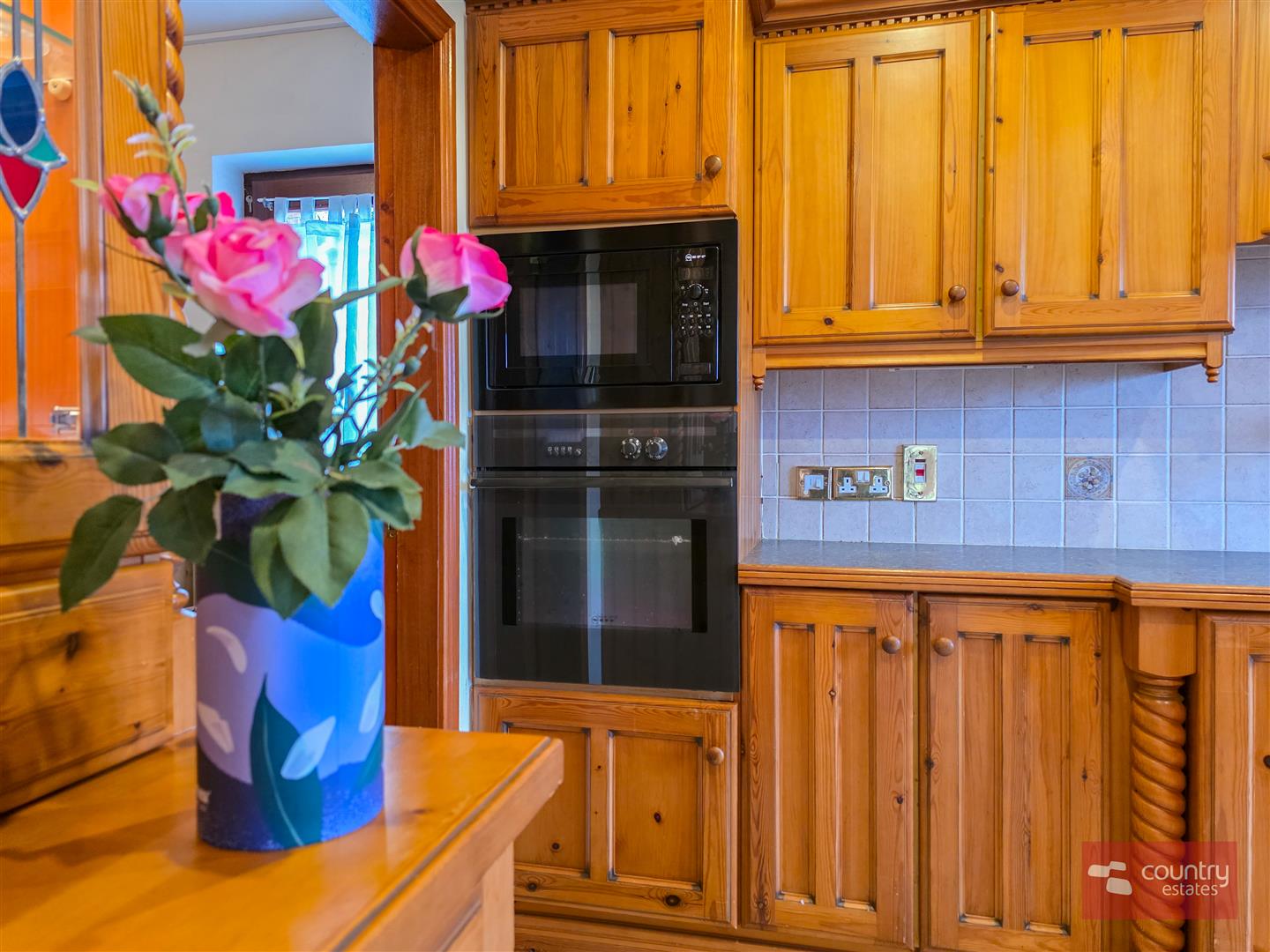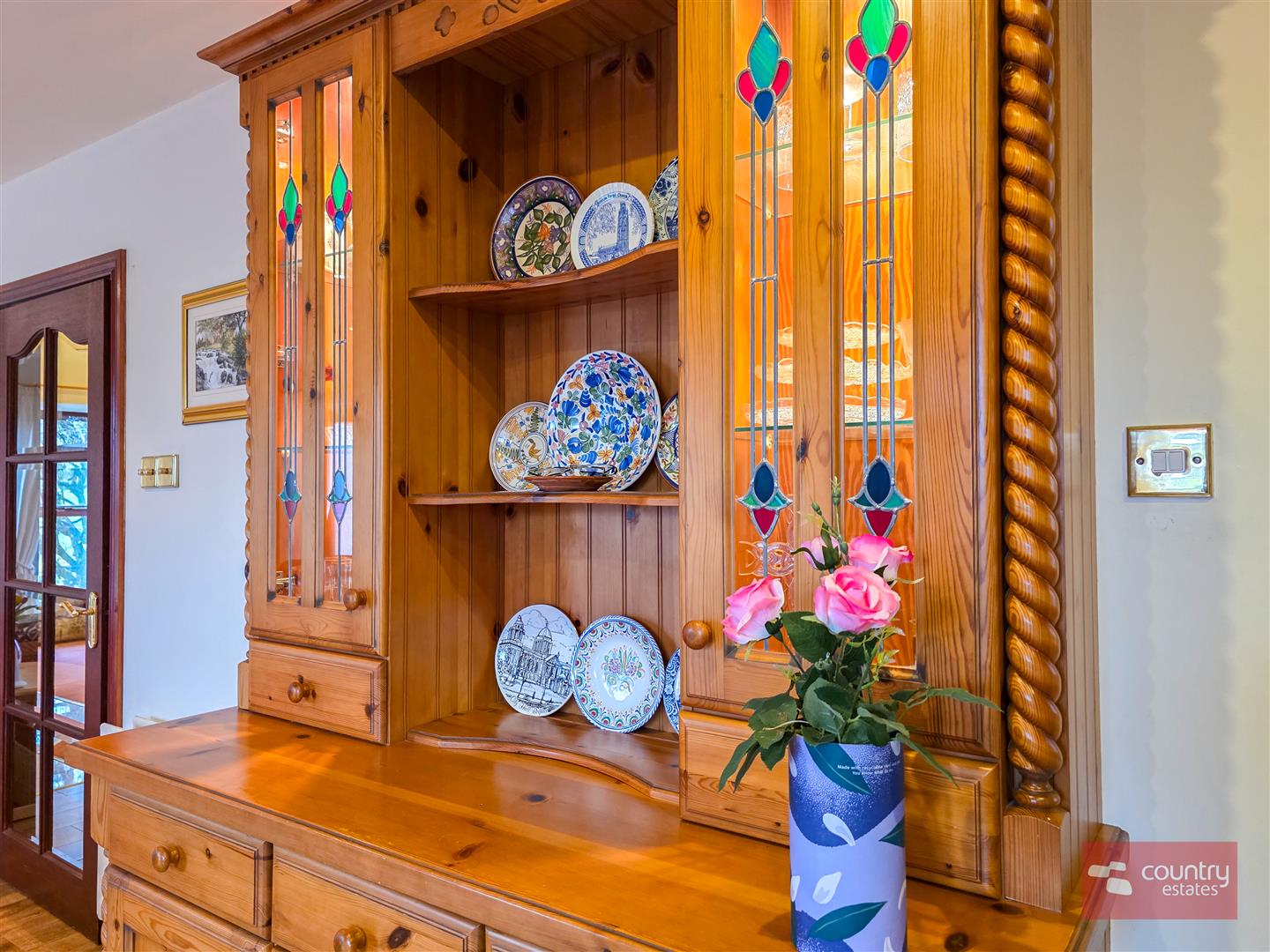 Equipped with a comprehensive range of high and low level shaker style Pine fitted units with contrasting work surfaces. One and a half bowl, single drainer stainless steel sink unit with swan neck mixer tap. Integrated eye-level NEFF oven and microwave, separate inlaid four ring electric hob, overhead extractor housed in decorative Pine canopy and an under-counter fridge. Stained glass display cabinet. Fitted Pine Welsh stye Dresser with stained glass display cupboards. Part tiled walls. Tiled floor. Recessed Downlighting. Open plan into: