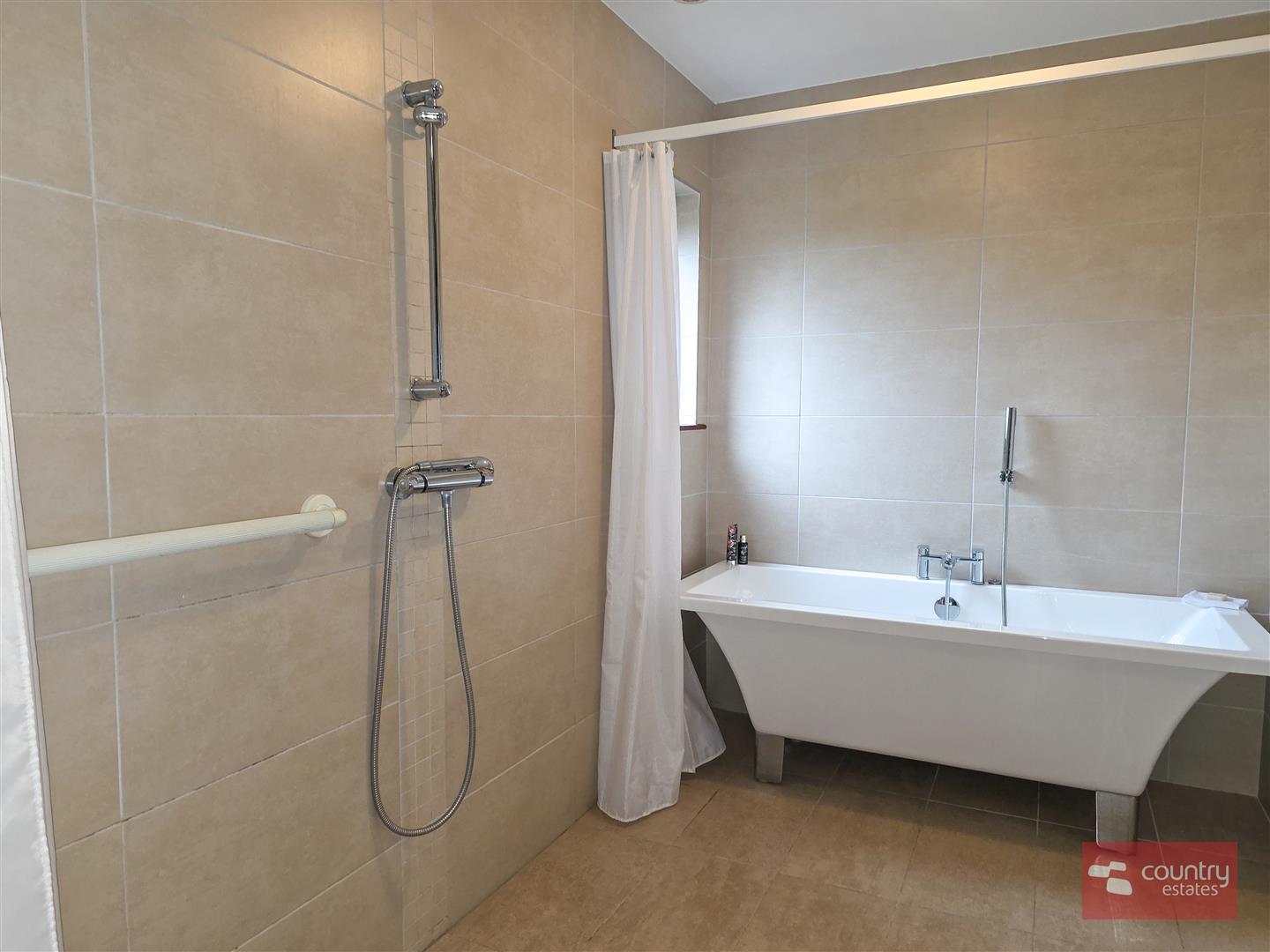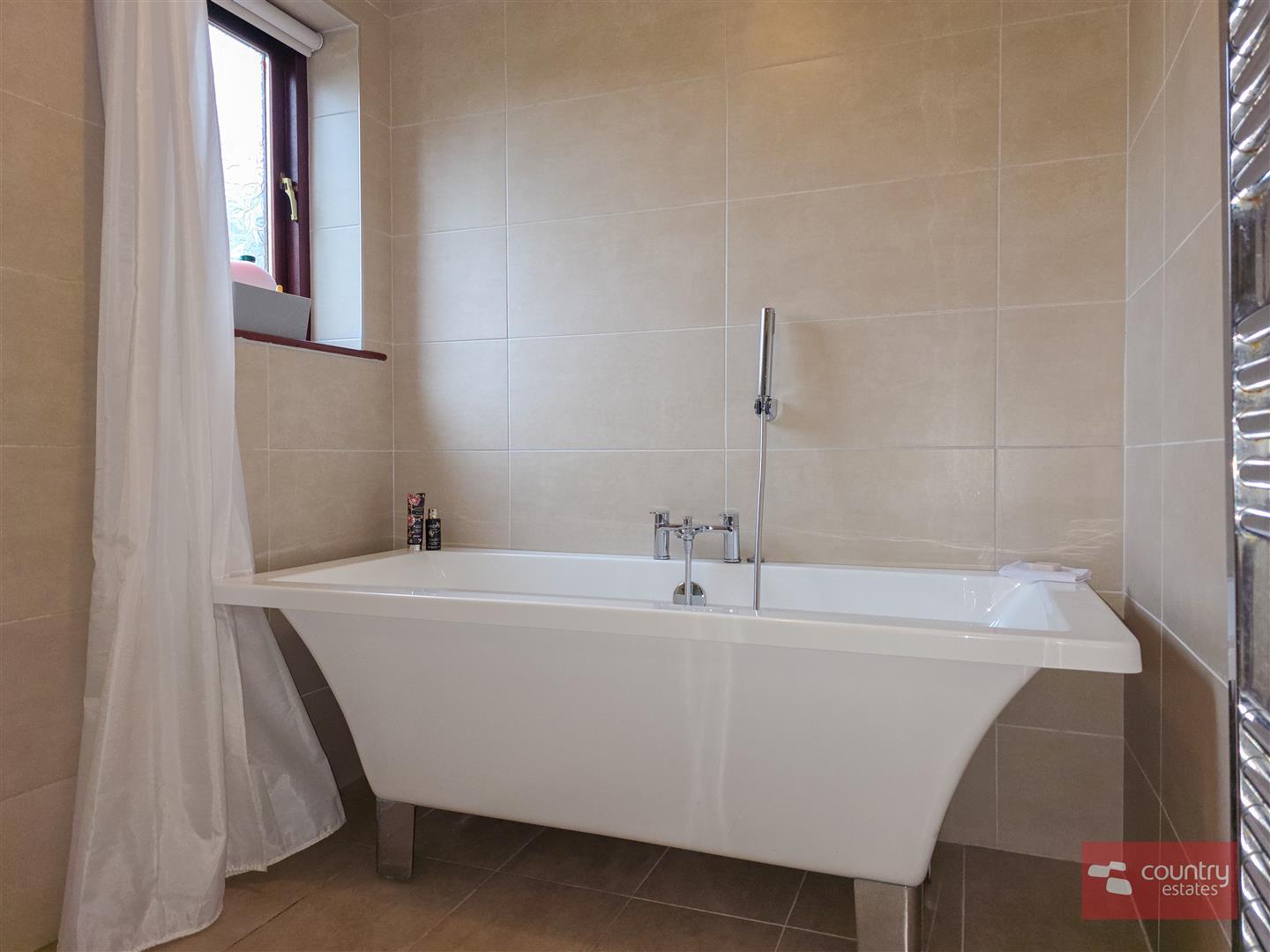 Comprising free standing double ended bath with hand shower attachments, thermostatically controlled wet room shower, wall mounted wash hand basin with monobloc tap and a tiled splashback and a low flush WC. Tiled walls. Tiled floor. Chrome towel radiator.