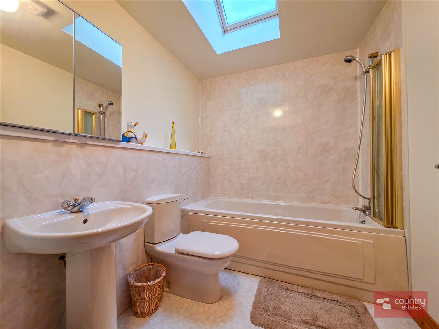 Comprising panel bath with shower attachment over bath and a fixed shower screen, Pedestal wash hand basin and a low flush WC. PVC panelled walls. Velux window.