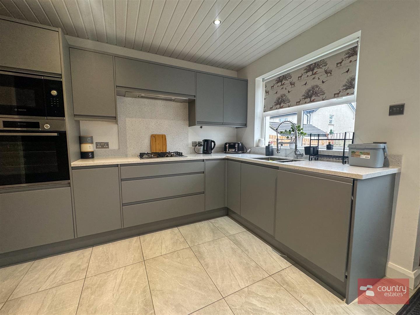 Equipped with a comprehensive range of high and low level fitted units in matt grey with contrasting corian work surfaces. A host of integrated appliances including eye level oven, microwave, separate 4 ring gas hob, concealed overhead extractor fan, washing machine and fridge freezer. Inlaid stainless steel sink unit with flexible hose tap. Integrated larder cupboard.