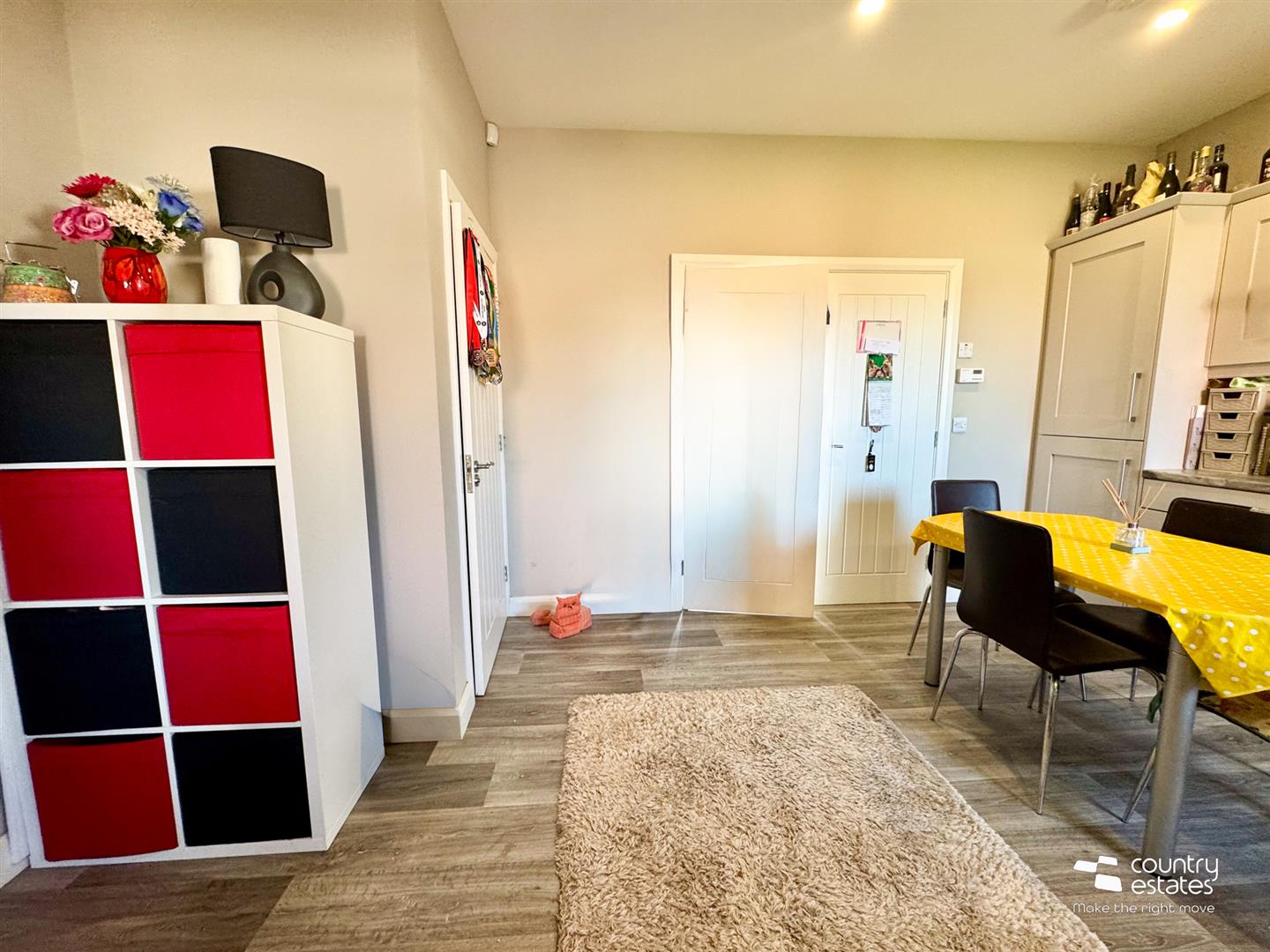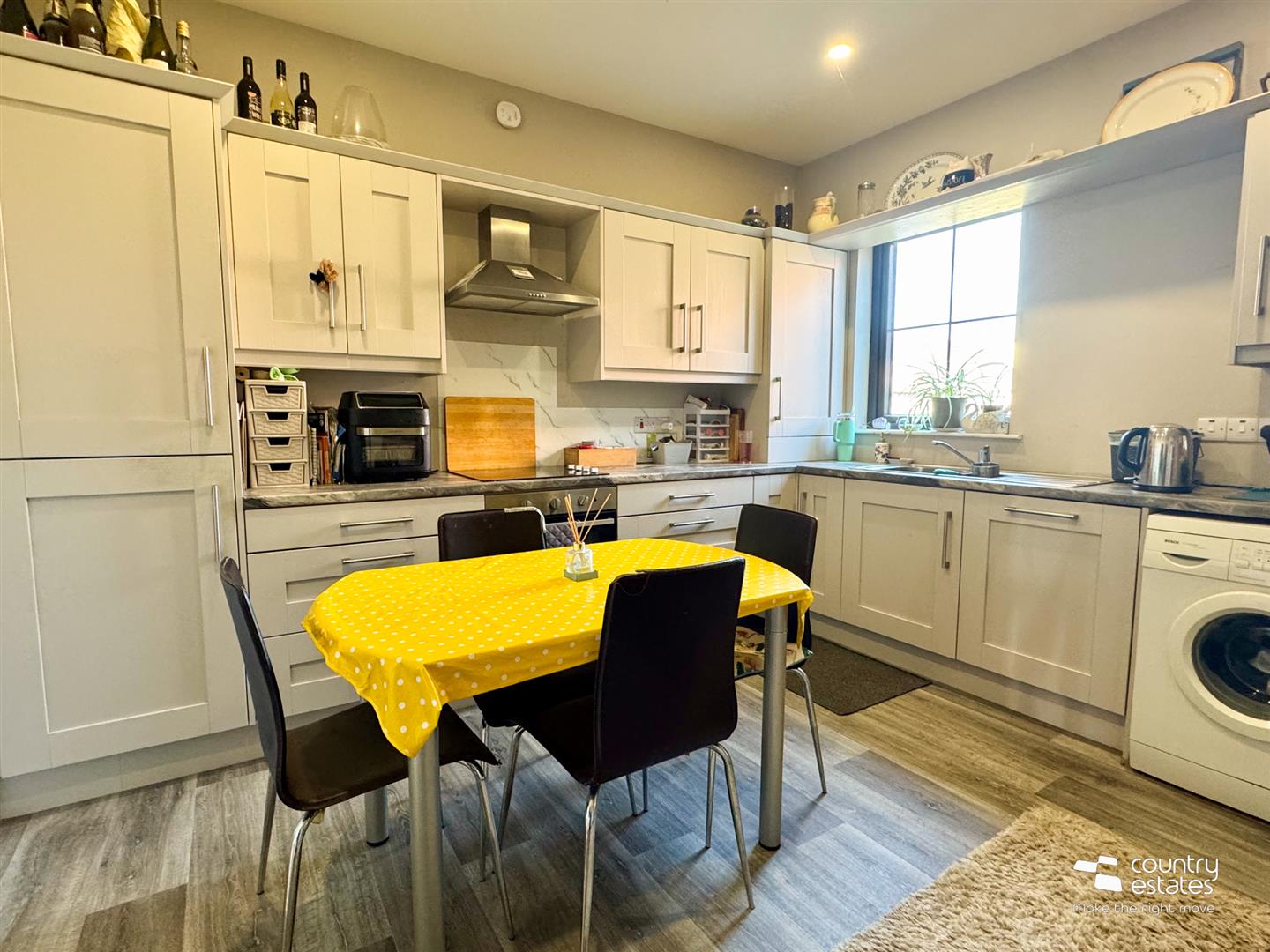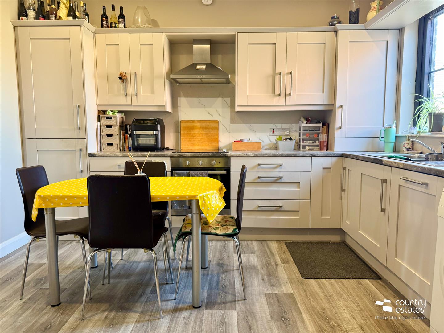Equipped with a comprehensive range of high and low level shaker style fitted units with contrasting work surfaces. Single drainer stainless steel sink unit with mixer tap. A range of integrated appliances including fridge/ freezer, oven with four ring hob, overhead extractor fan with stainless steel canopy and dish washer. Plumbed for washing machine. Open plan into:-