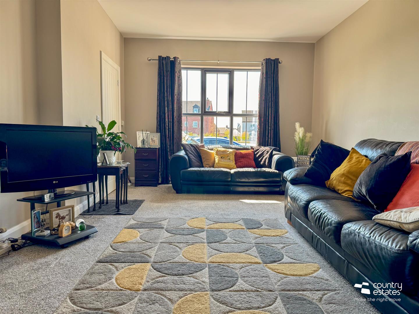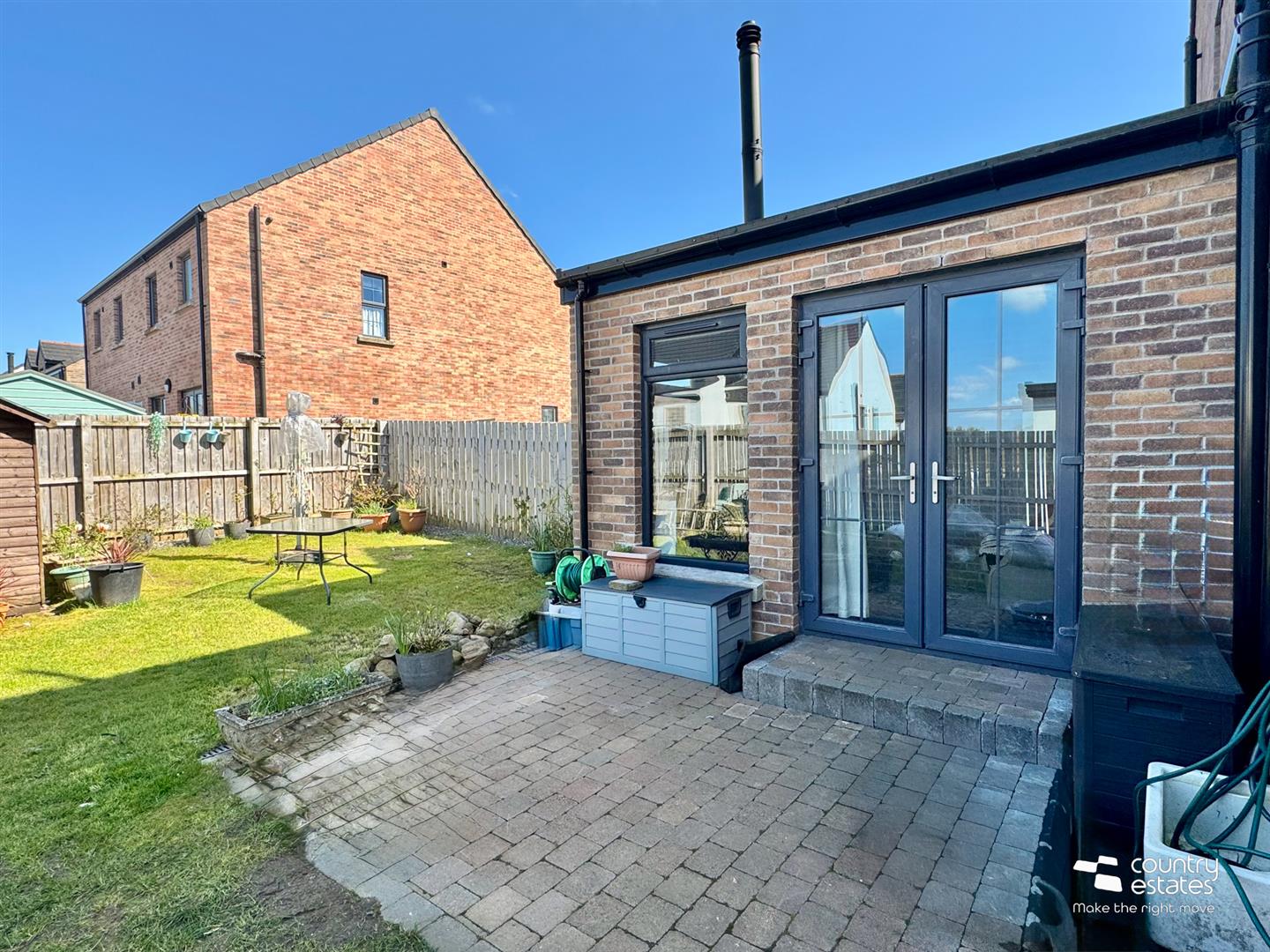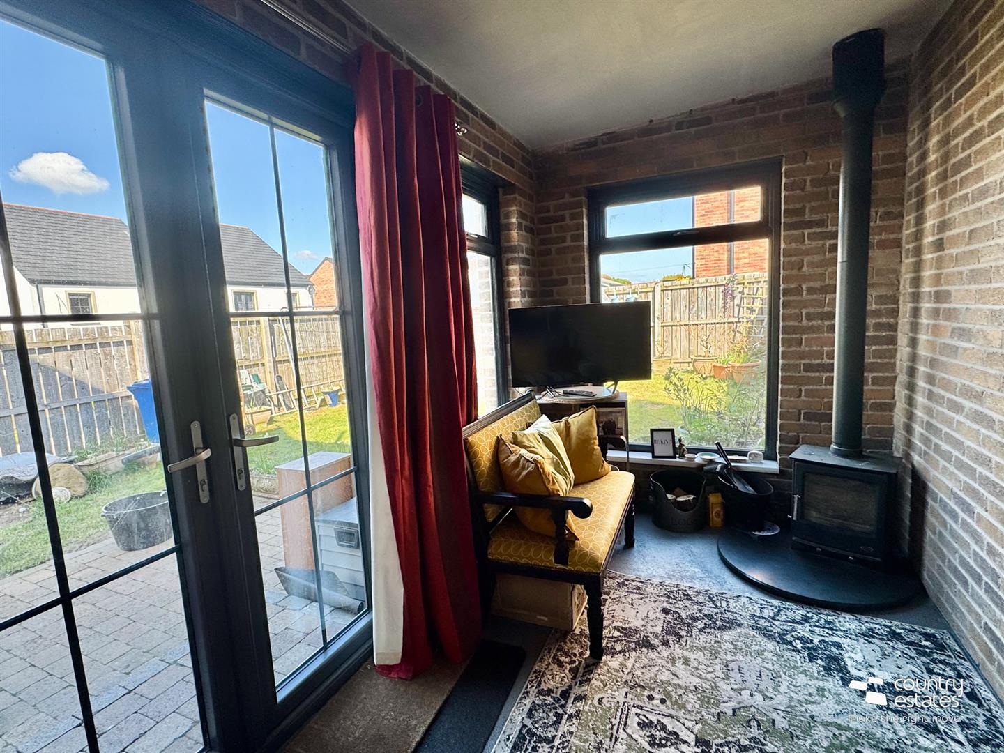 Feature exposed brick accent wall. Cast iron multi fuel stove on granite hearth. Dual window aspect. Twin doors to patio.