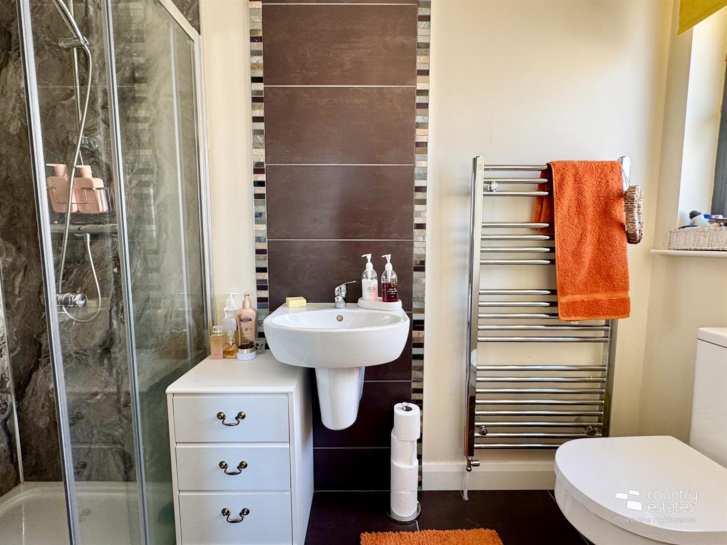 Comprising button flush w.c, semi pedestal wash hand basin with tiled accent panel and large shower enclosure with thermostatically controlled shower. Tiled floor.