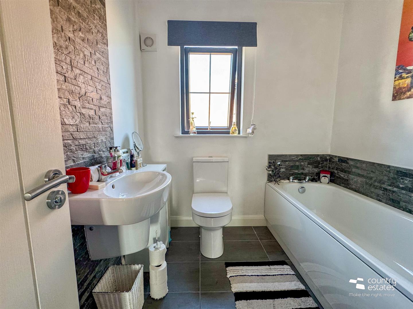 Comprising panelled bath with tiled splashback, semi pedestal wash hand basin with tiled accent panel and button flush w.c. Tiled floor.