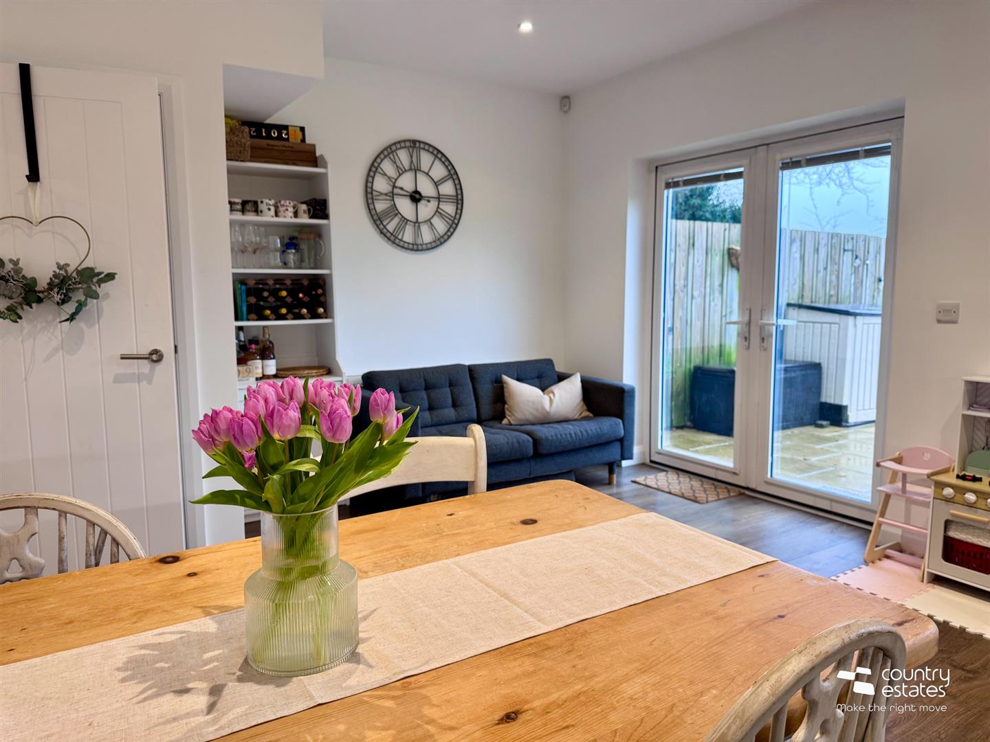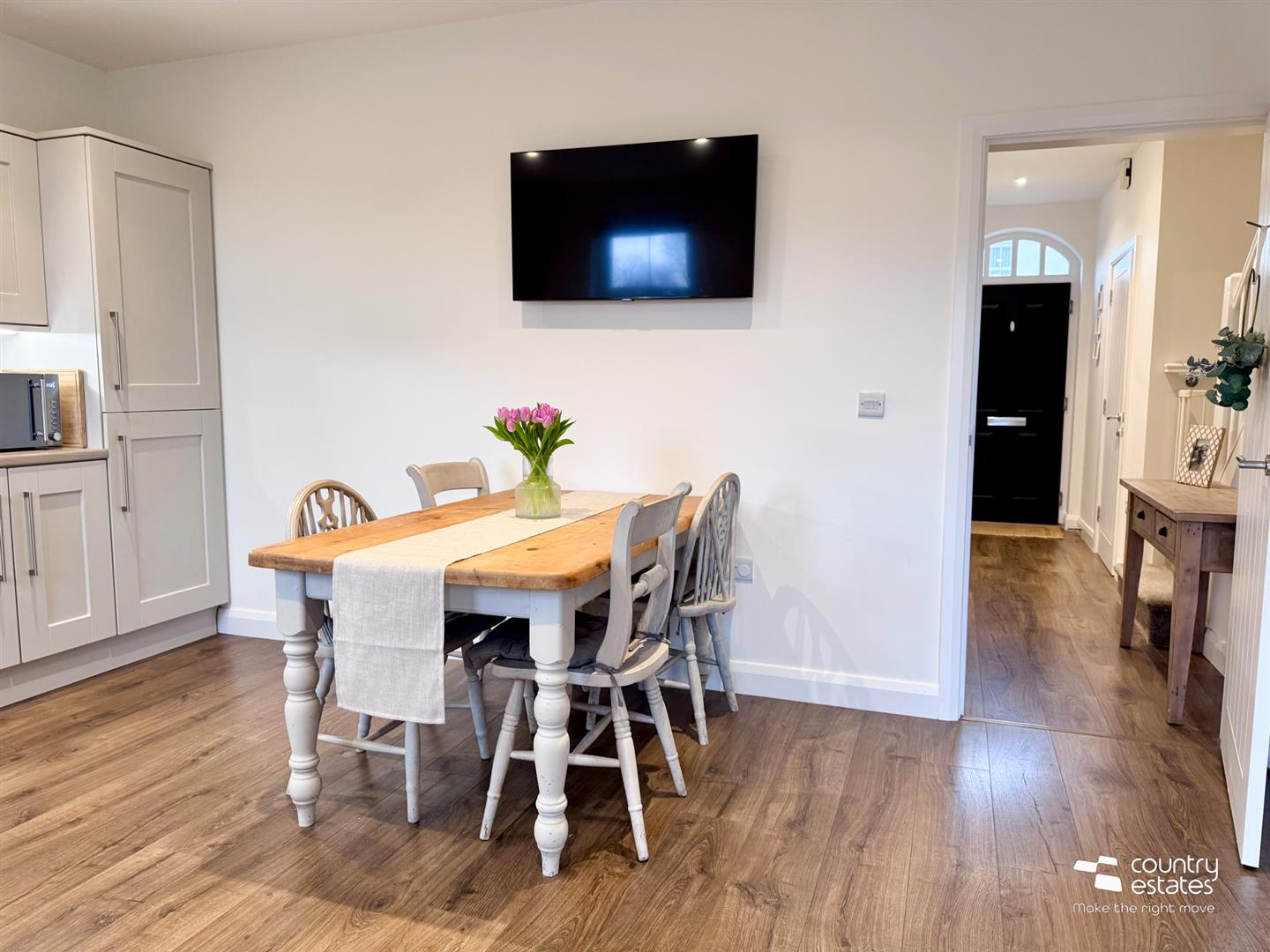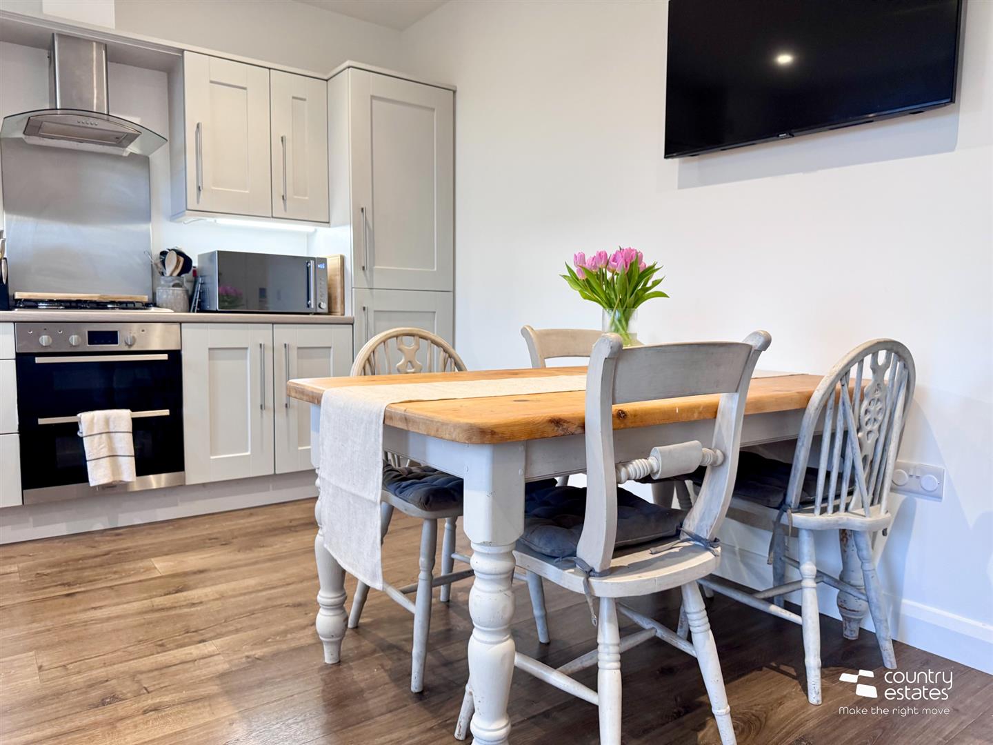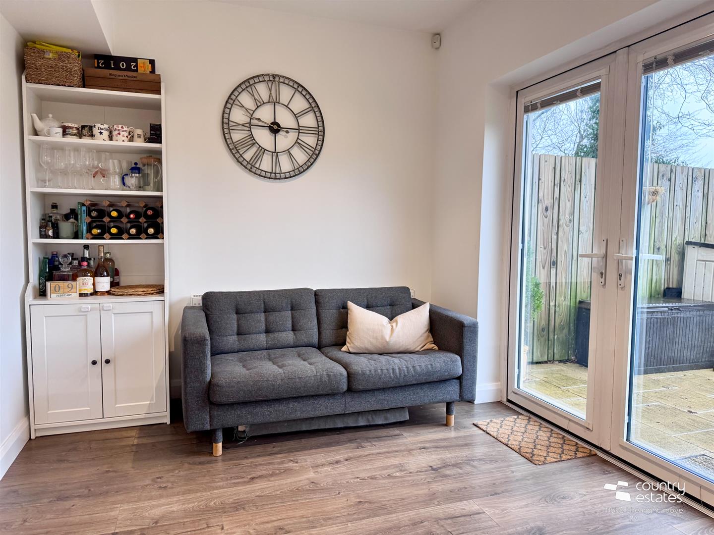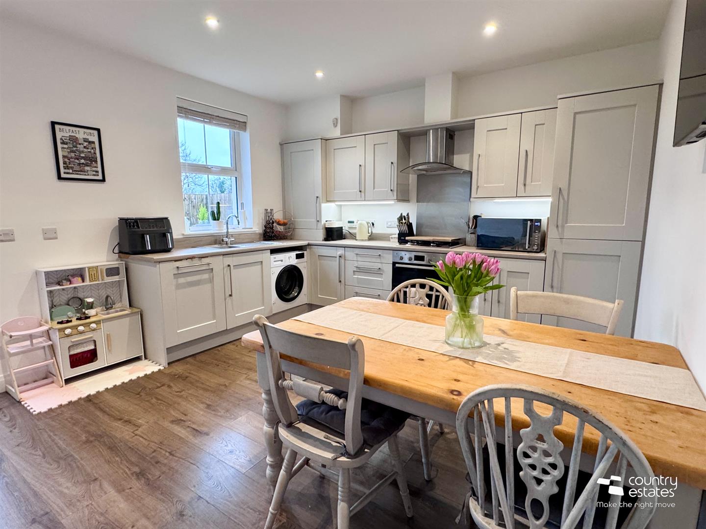 Shaker style fitted kitchen with range of high and low level units with matching work surfaces. Range of integrated appliances to include inlaid 4 ring gas hob with electric under oven and overhead stainless steel extractor unit. Integrated fridge freezer, dishwasher and washer/ dryer. Inlaid stainless steel sink unit with swan neck mixer tap and drying tray. Recessed under unit lighting. Walnut effect laminate flooring. Recessed ceiling lighting. Understairs larder storage cupboard. PVC double glazed French doors accessing rear patio area.