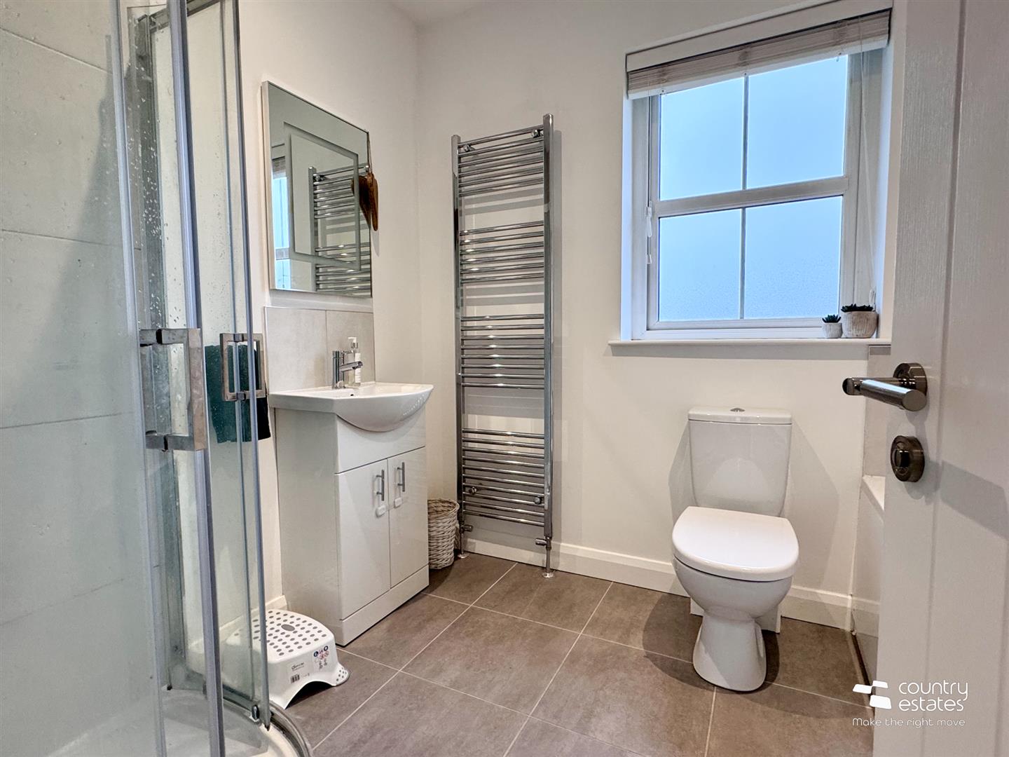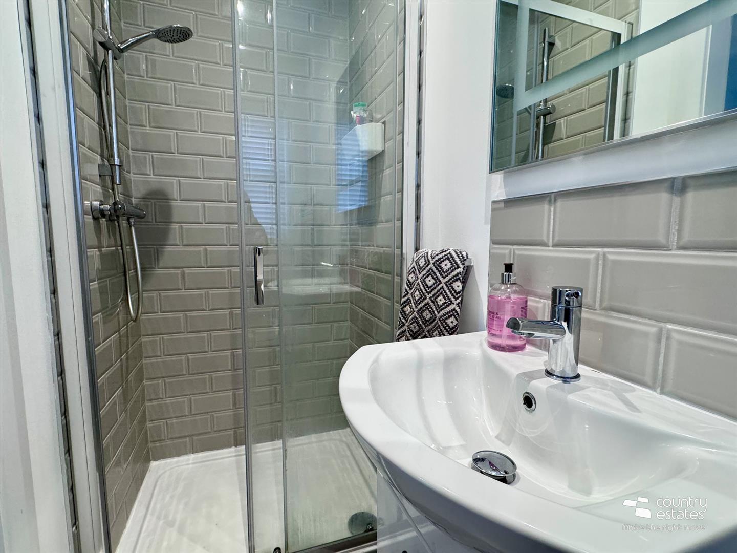 With three piece suite comprising fully tiled shower cubicle with sliding screen door, vanity unit with monobloc tap and wall mounted mirror and low flush w.c. Chrome heated towel rail. Ceramic tiled floor. Recessed ceiling lighting.