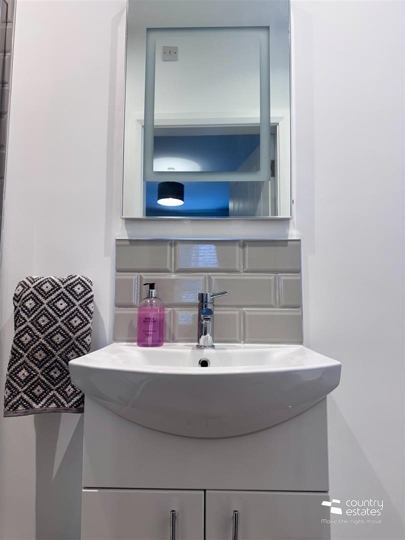 Comprising low flush w.c. and semi pedestal wash hand basin with mono block tap and splashback. Ceramic tiled floor. Automatic recessed ceiling lighting.