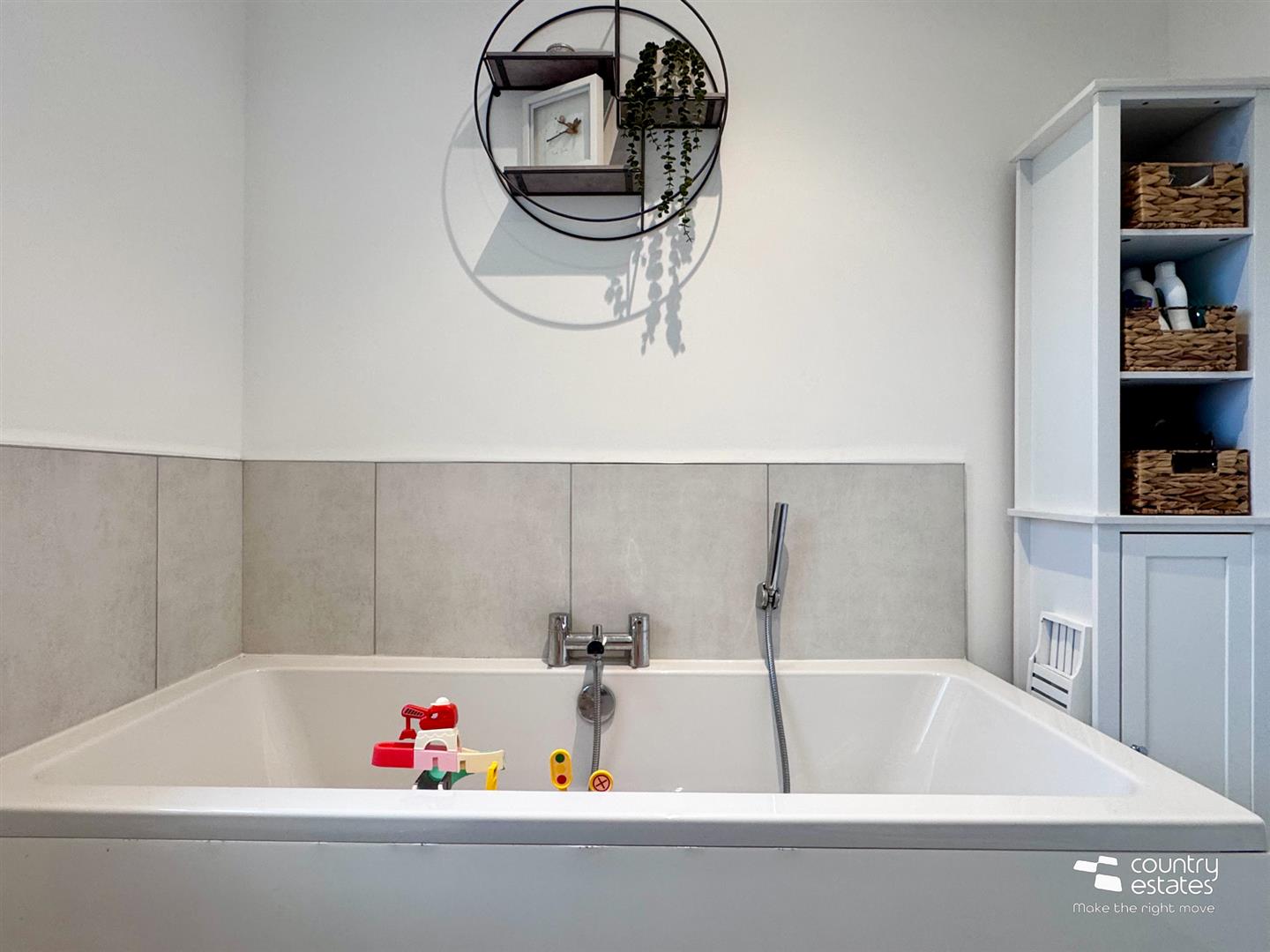 Contemporary 4 piece suite comprising panelled bath with shower attachment and splashback tiling, fully tiled corner shower cubicle with sliding screen door and mains operated shower unit, low flush w.c. and vanity unit with mixer tap. Chrome heated towel rail. Wall mounted mirror. Ceramic tiled floor. Recessed ceiling lighting.