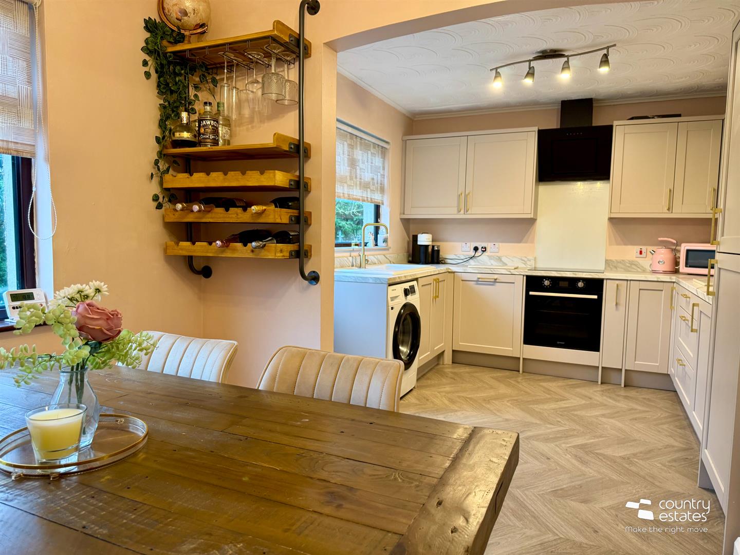 Equipped with a comprehensive range of high and low level fitted shaker style units with contrasting work services and upstands. Ceramic single drainer sink unit with swan neck tap in brushed gold effect. A range of Integrated appliances including oven with four ring hob and modern angled overhead extractor fan. Dishwasher and fridge freezer. Plumbed for washing machine. PVC mahogany effect double glazed door to garden.