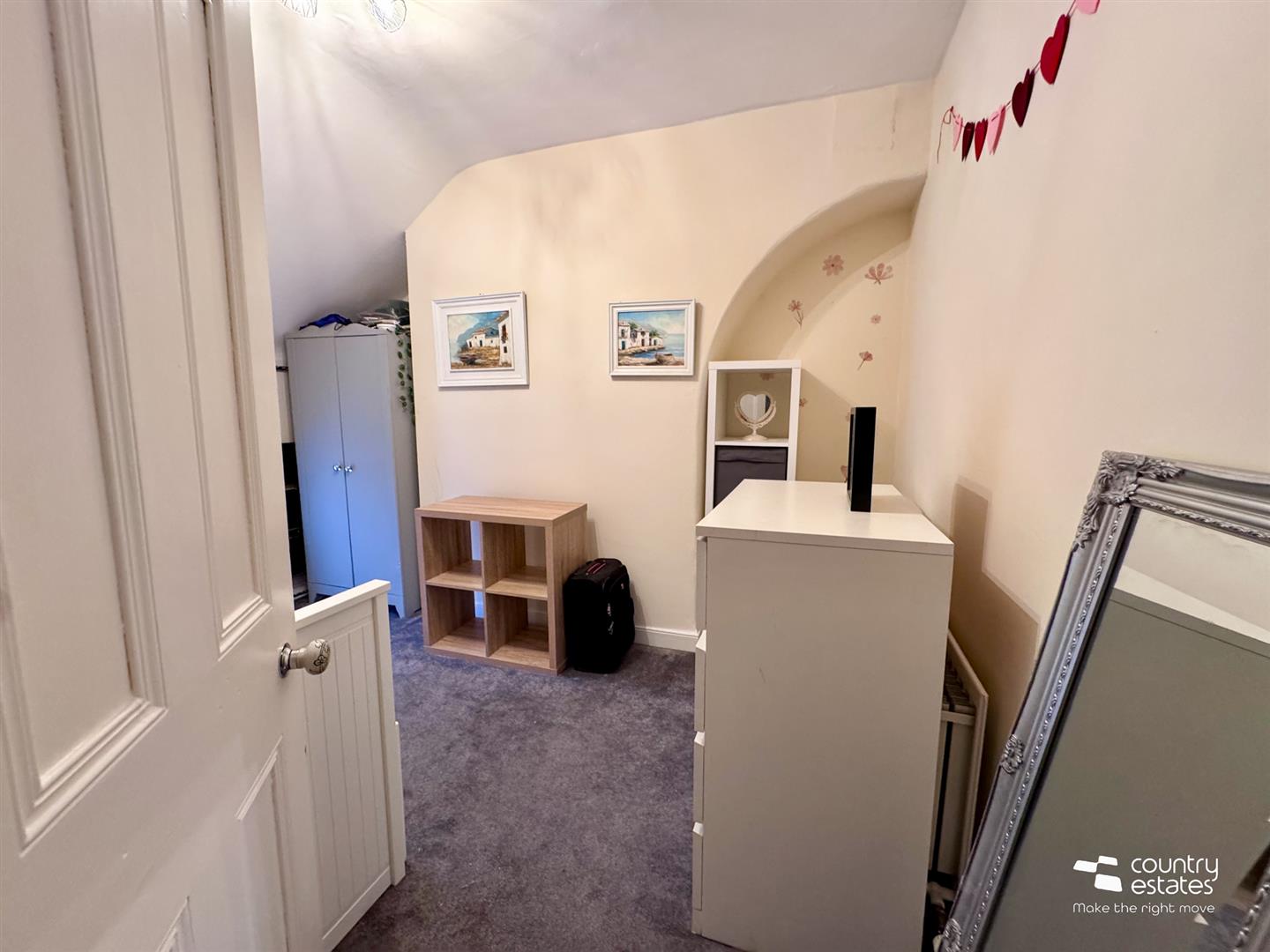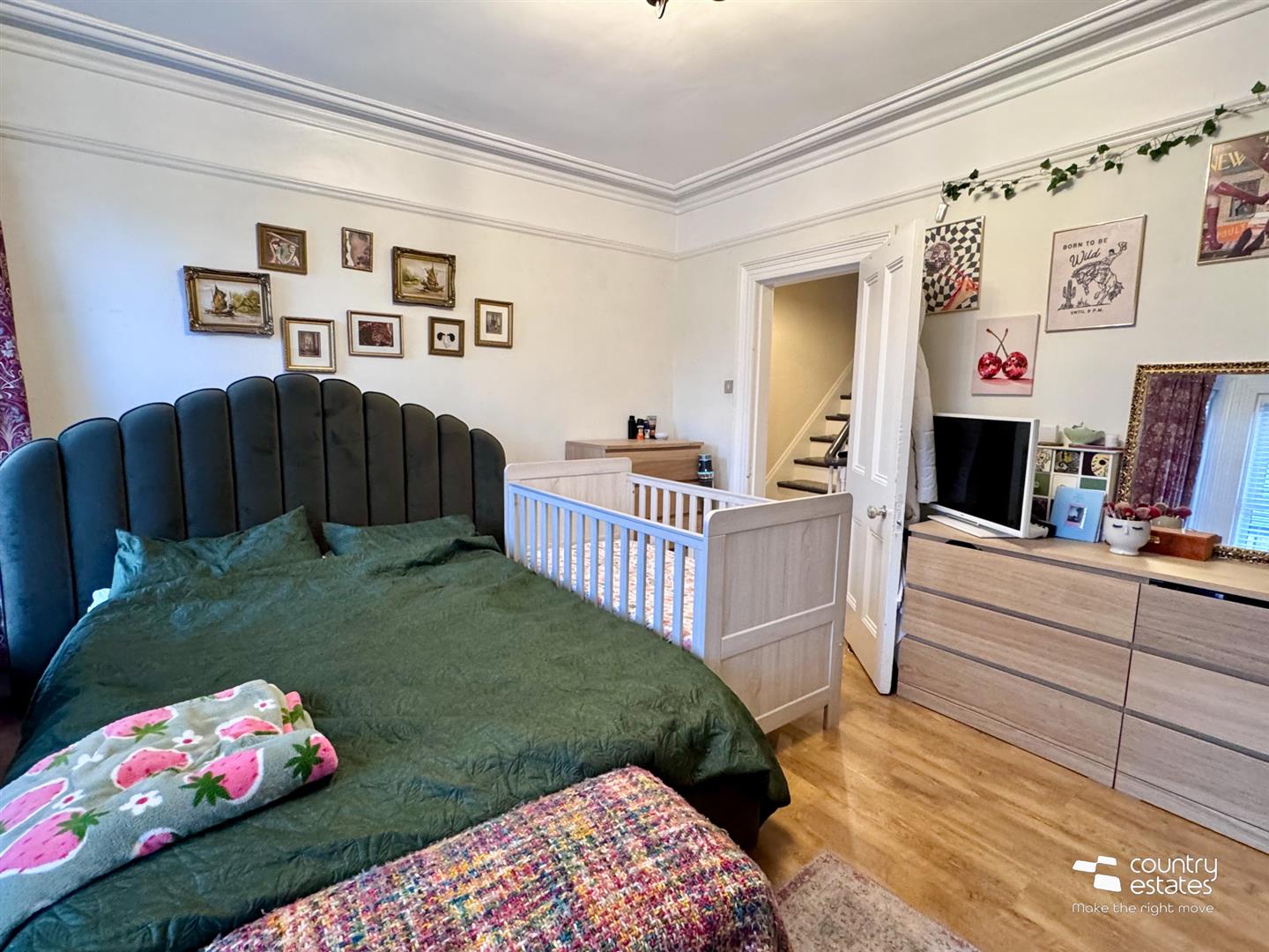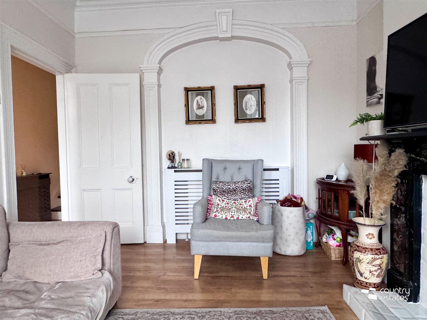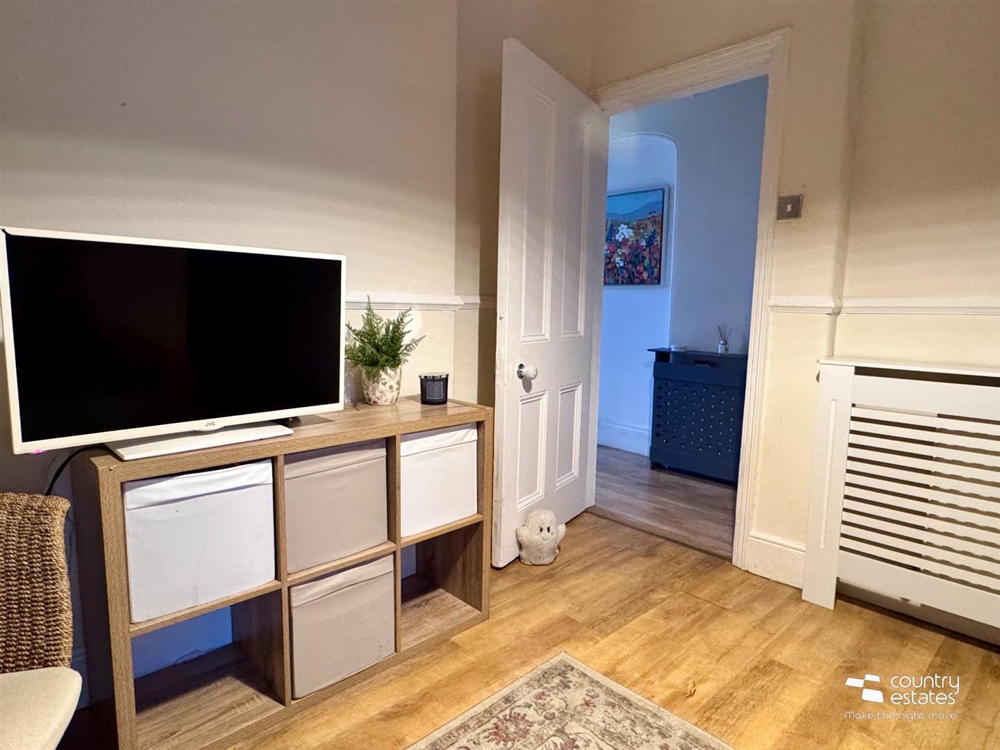 Period fireplace with modern electric feature fire inset. Built in understairs storage cupboard. Corncied ceiling. Dado rail. Quality laminate flooring.