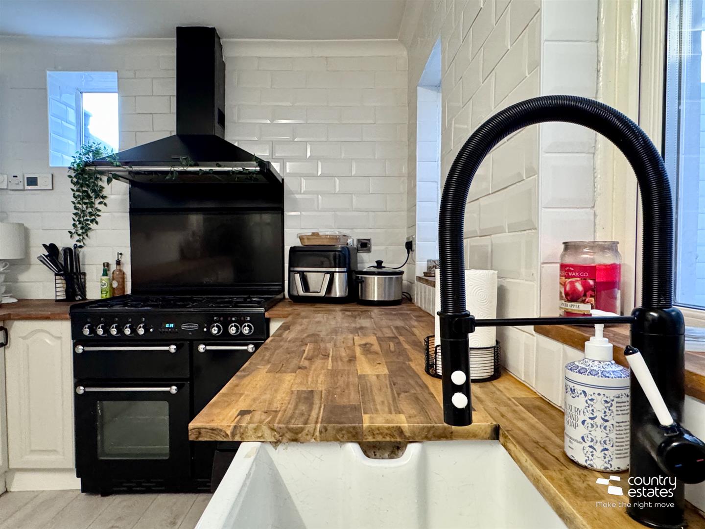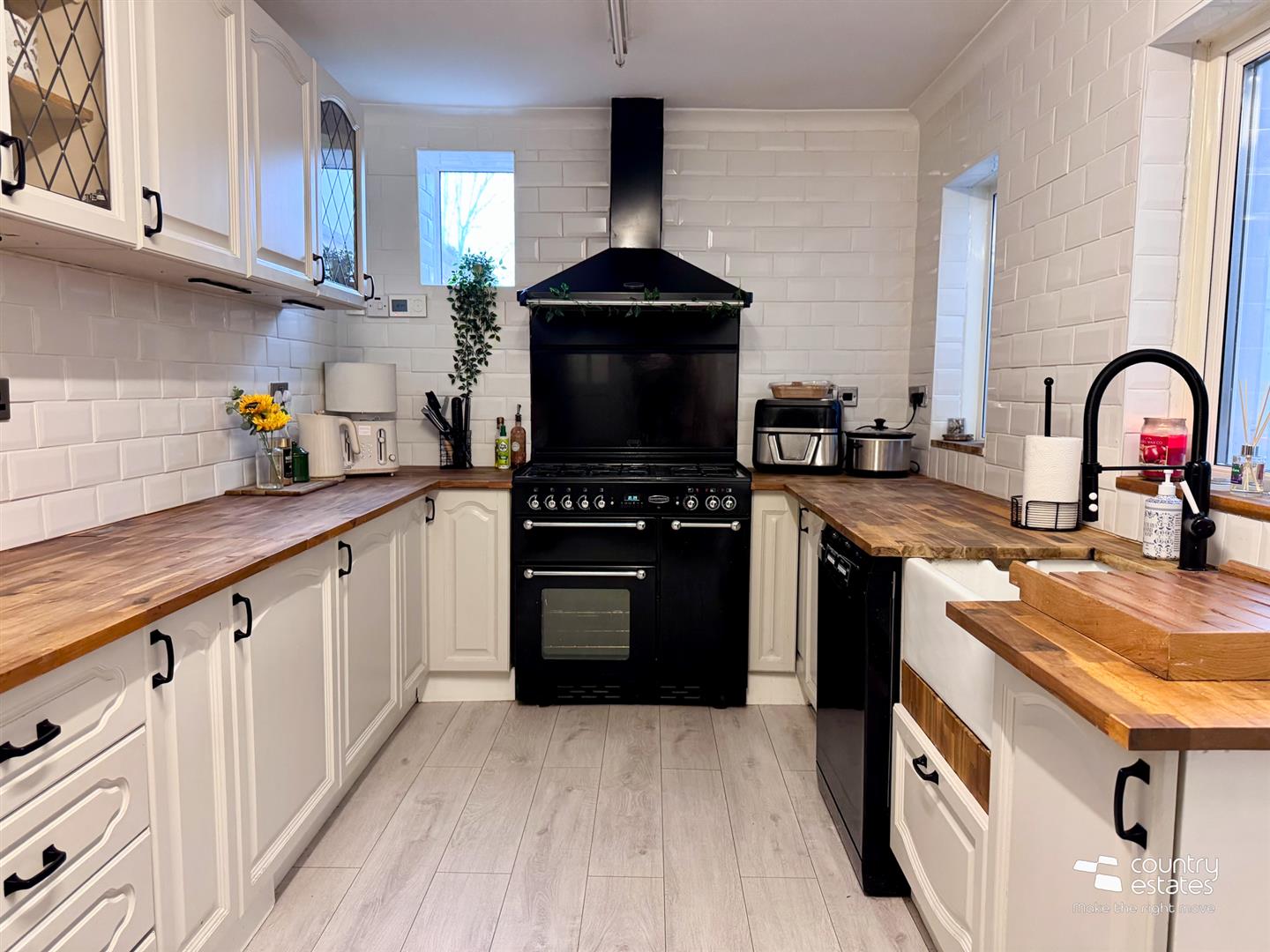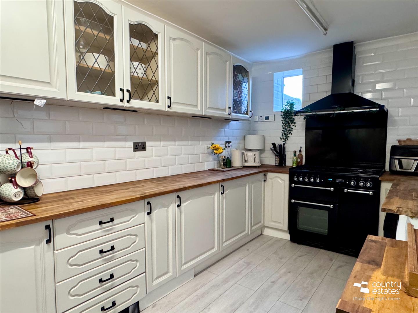 Equipped with a comprehensive range of high and low modern fitted units with contrasting wood worksurfaces. Leaded glass display cabinets. Space for freestanding Range style cooker. Overhead extractor fan housed in colour coded canopy. Old Belfast style sink with colour coded hose style mixer taps. Part tiled walls in metro brick style tile. Laminate wood flooring.