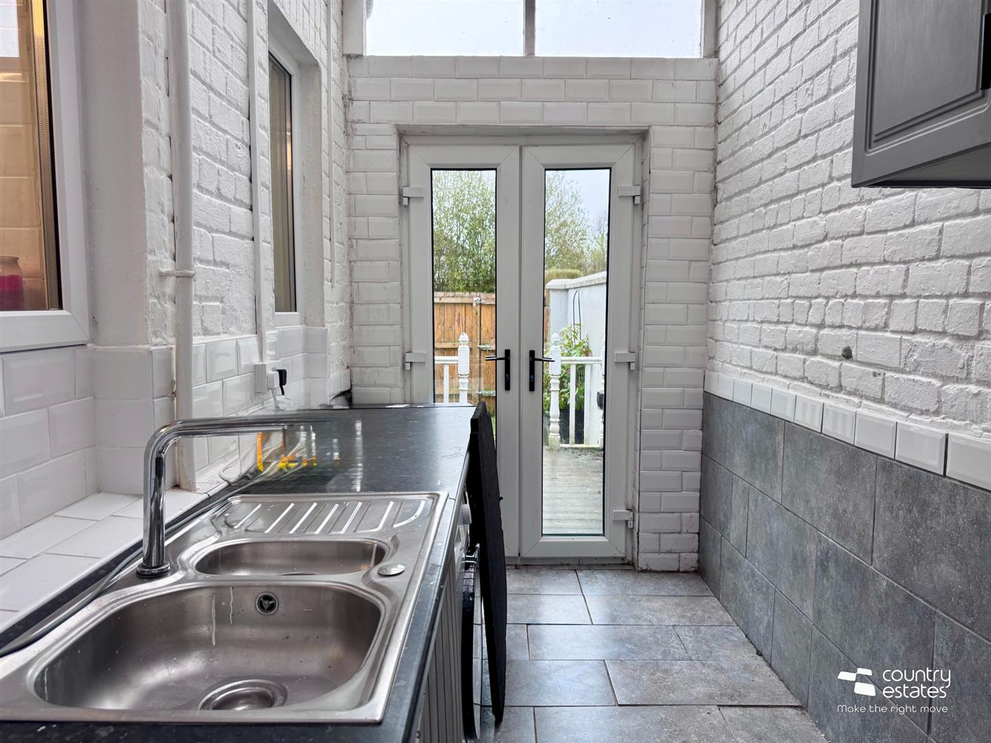 Fitted units with contrasting worksurfaces. Stainless steel one and half bowl sink unit with mixer taps. Space for washing machine. Space for dryer. Tiled floor and half tiled walls. Twin PVC double glazed doors to rear.