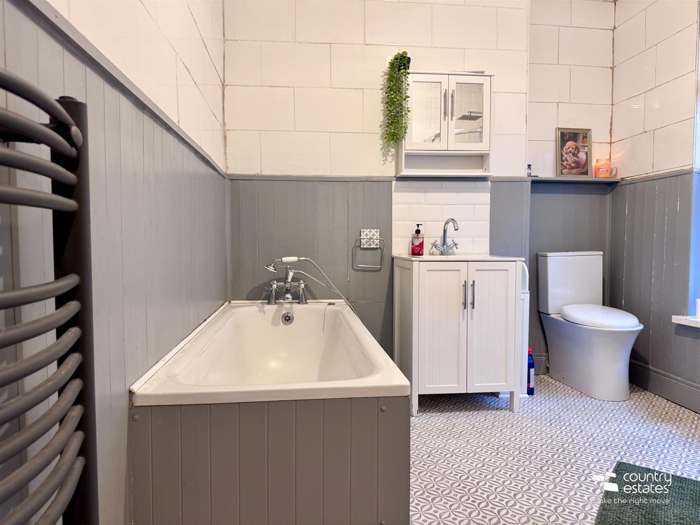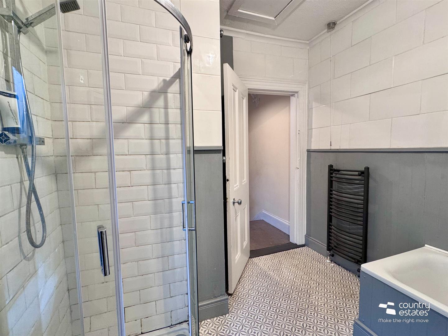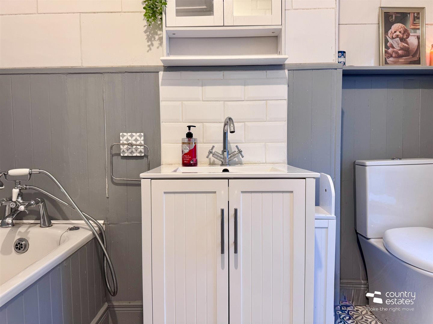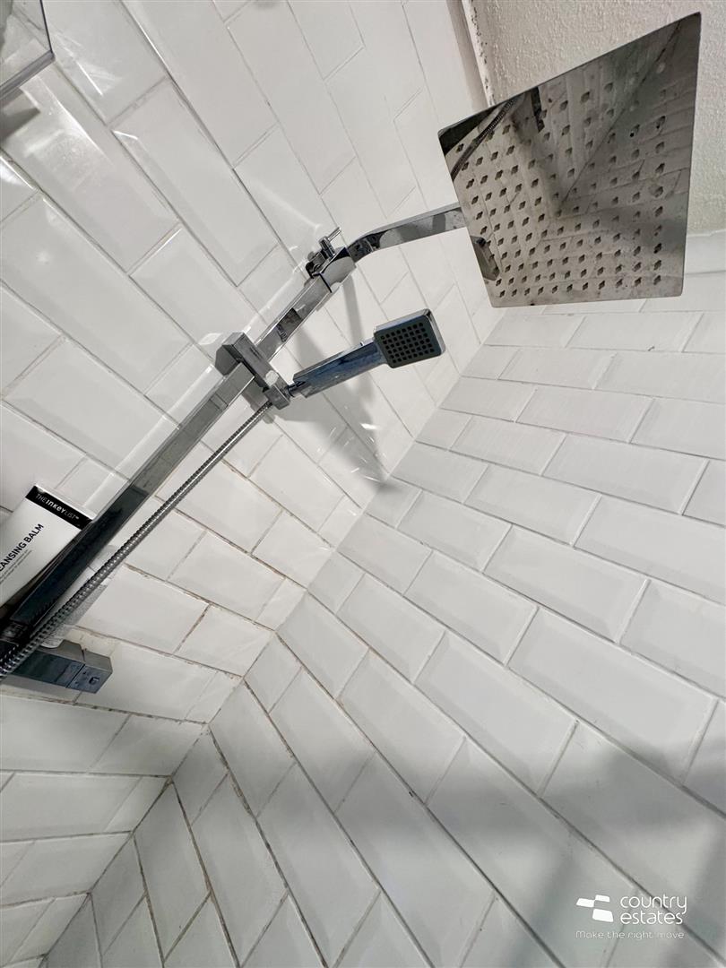 Comprising panelled bath with telephone shower attachment, separate corner rounded shower enclosure with rainfall shower head and hand shower attachment, vanity style sink with mixer taps and button flush w.c. Partially panelled and tiled walls. Heated towel rail.
