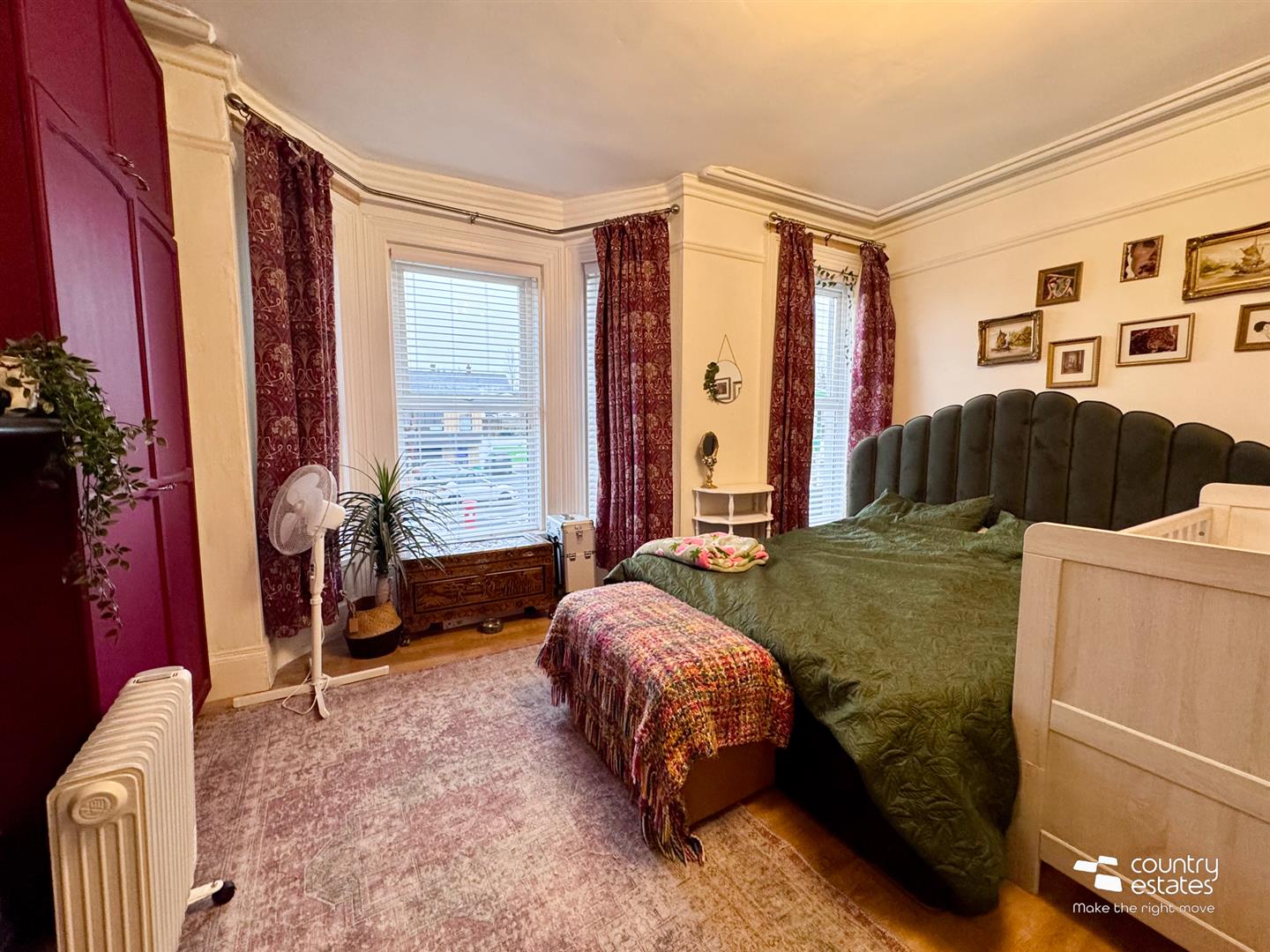 Feature bay window. Period original fireplace with tiled inset and hearth. Built in wardrobe with overhead storage cupboard. Original corncied ceiling and picture rail . Quality laminate flooring.