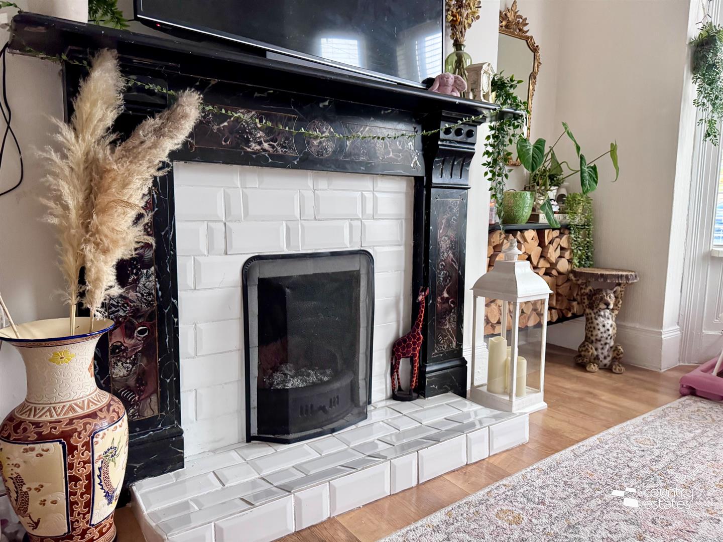 Feature fireplace with matching mantle and surround.