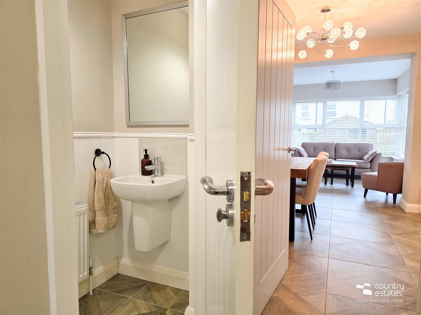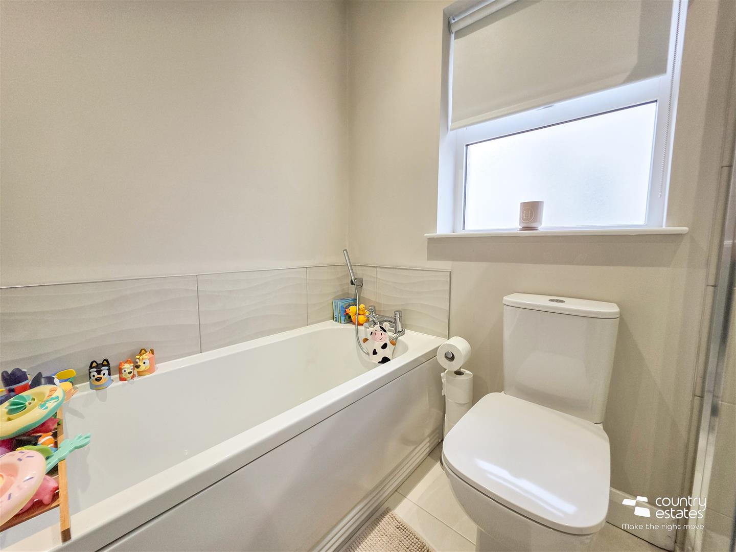 Comprising panel bath with hand shower, fully tiled quadrant shower cubicle with thermostatically controlled drench style shower and hand shower attachment, semi-pedestal wash hand basin with monobloc tap and a button flush WC. Tiled floor. Part tiled walls. Chrome towel radiator. Recessed down lighting.
