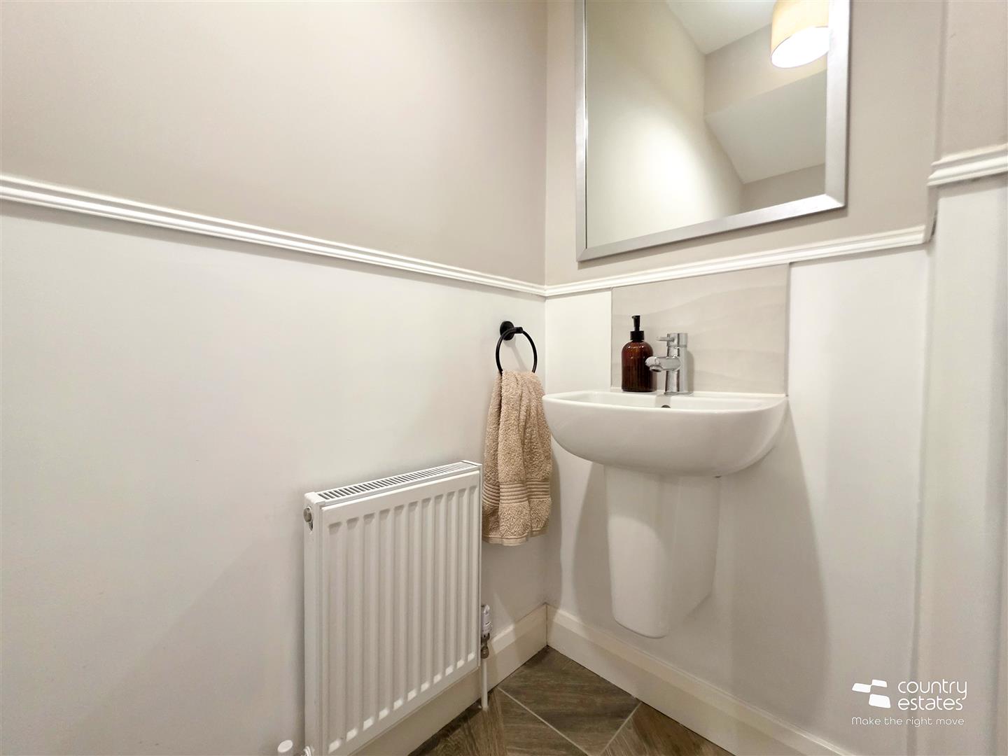 Comprising semi-pedestal wash hand basin with tiled splashback and monobloc tap and a button flush WC. Ceramic floor tiling.