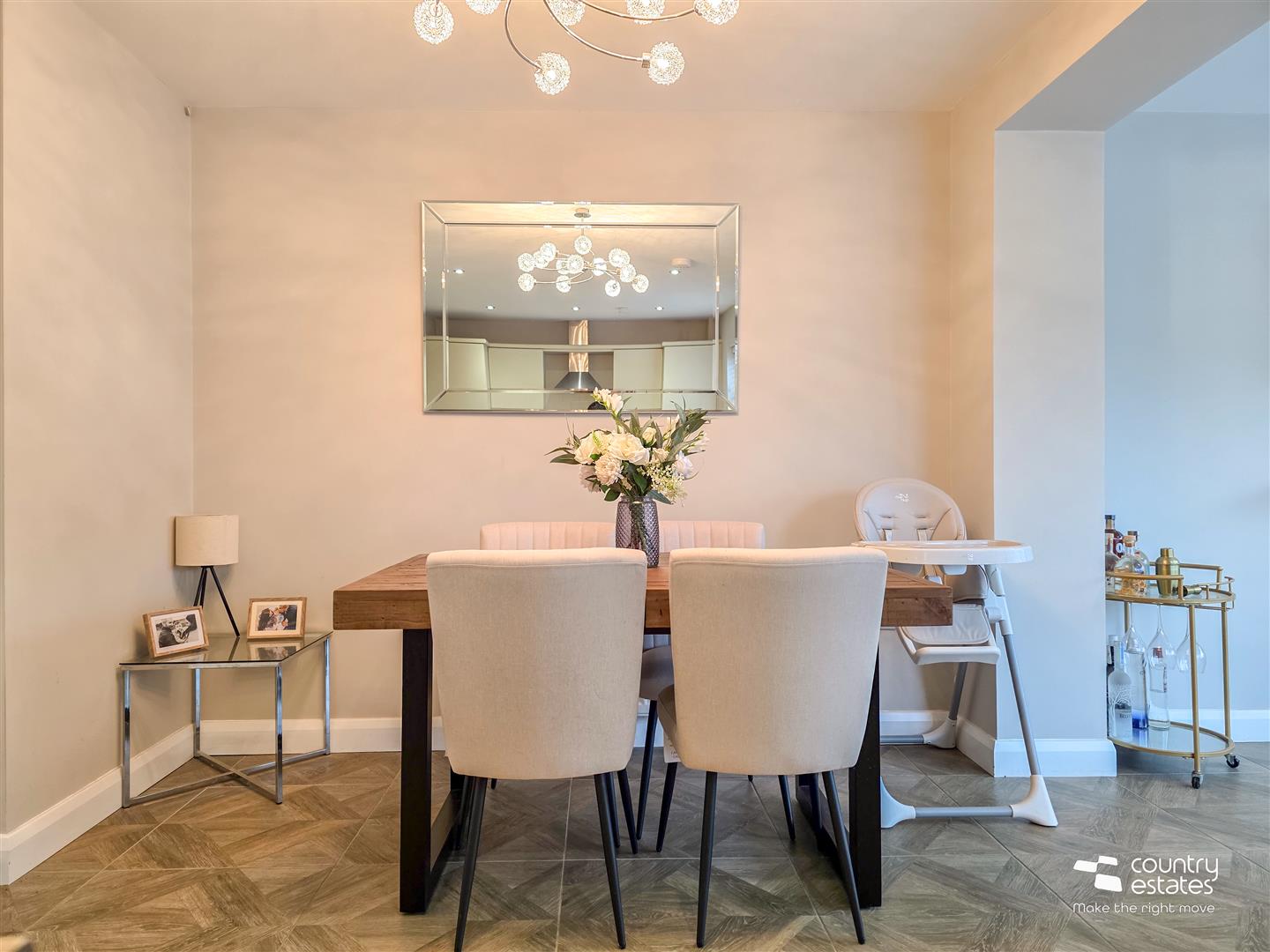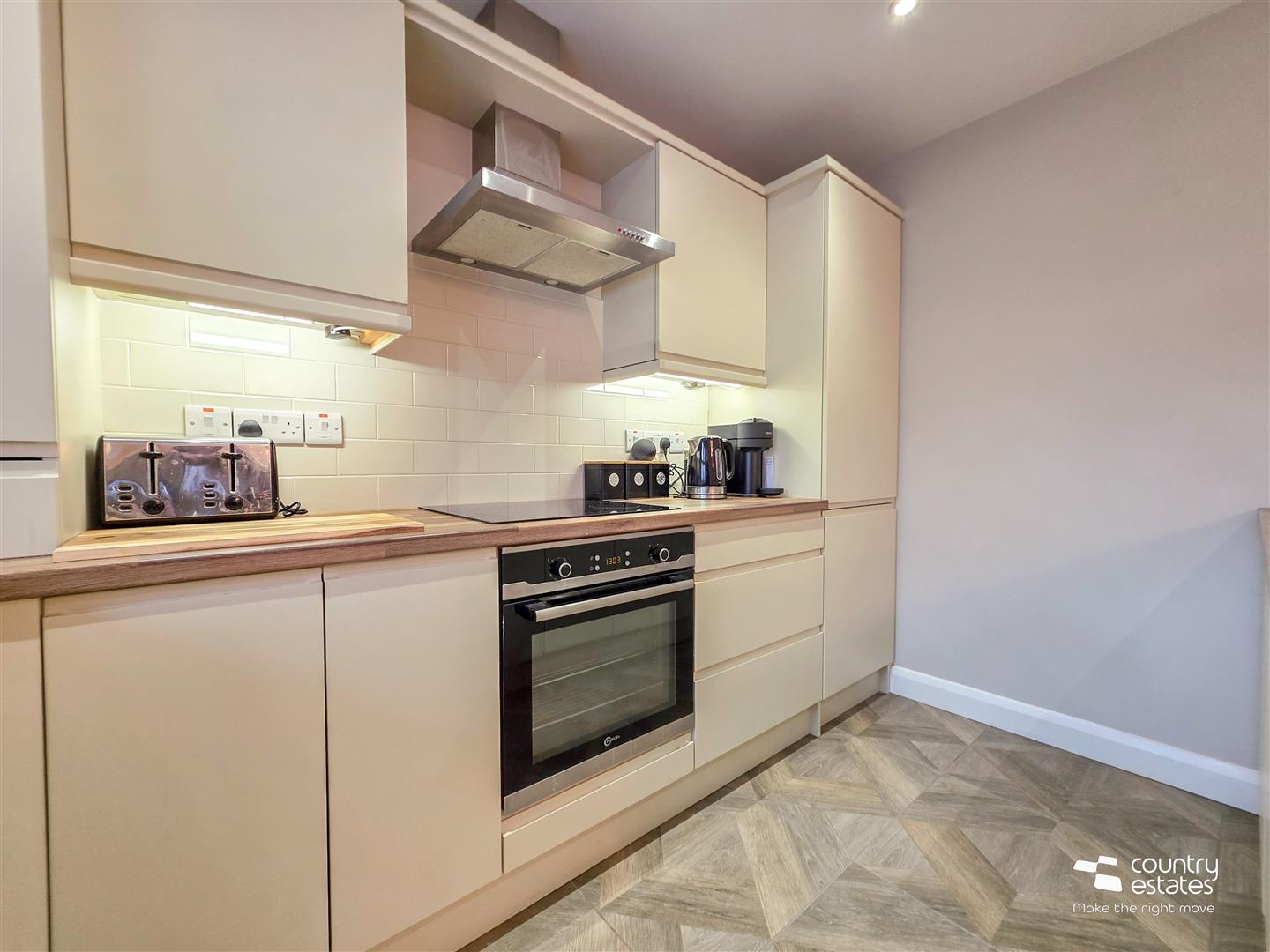 Equipped with a comprehensive range of high and low level shaker style fitted units and contrasting butcher block effect work surfaces. Single drainer stainless steel sink unit with swan neck mixer tap. Boasting a range of integrated appliances to include; Oven, separate four ring electric hob with overhead extractor fan housed in stainless steel canopy, dishwasher, washer/dryer and fridge freezer. Fixed breakfast bar with low base units for storage and matching work surface. Ample space for casual dining. Part tiled walls in Metro brick style. Ceramic floor tiling. Recessed downlighting. Open into: