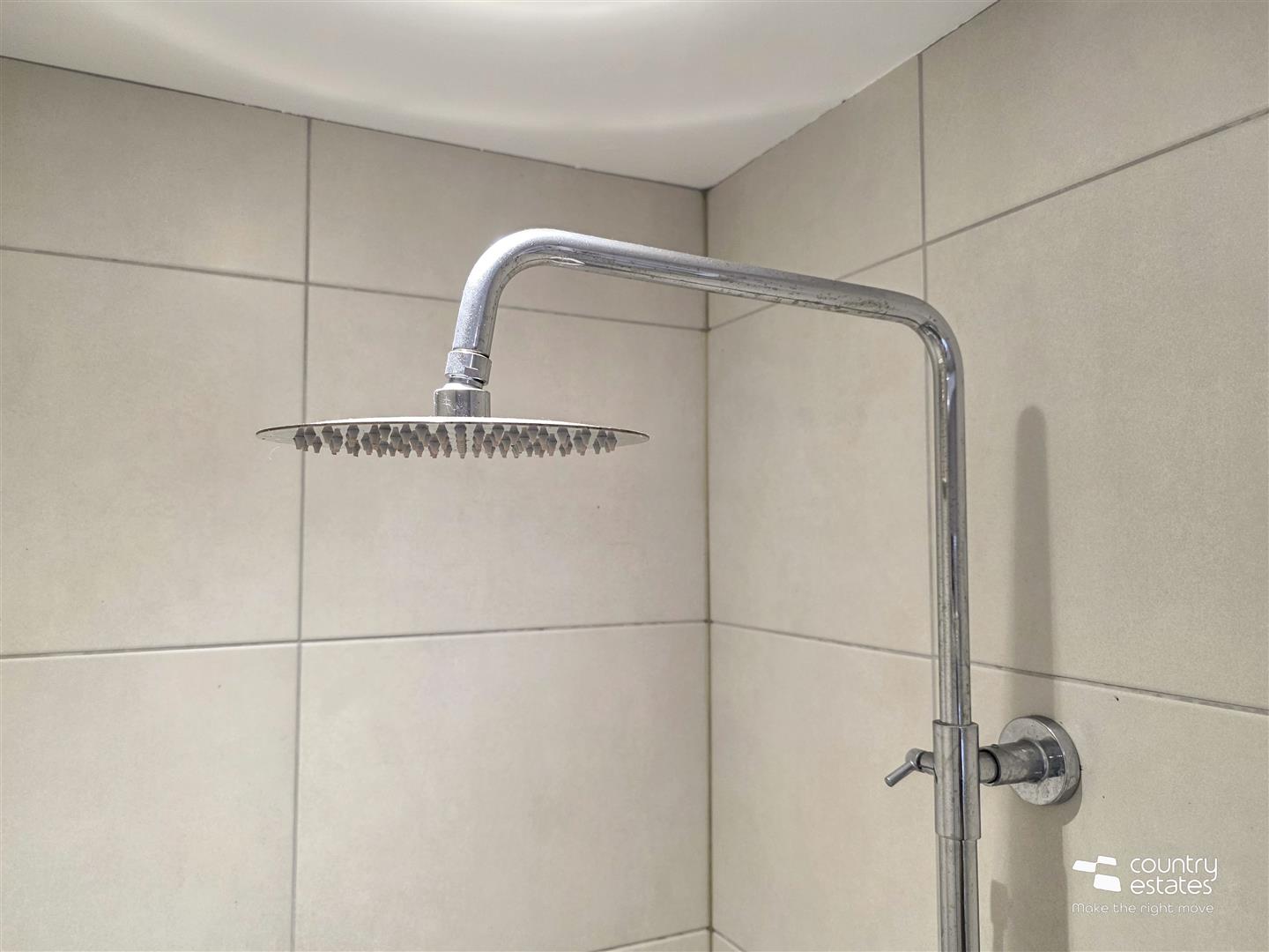 Comprising fully tiled shower cubicle with thermostatically controlled drench style shower and hand shower attachment, semi-pedestal wash hand basin with monobloc tap and tiled splashback, and button flush WC. Tiled floor. Recessed down lighting.