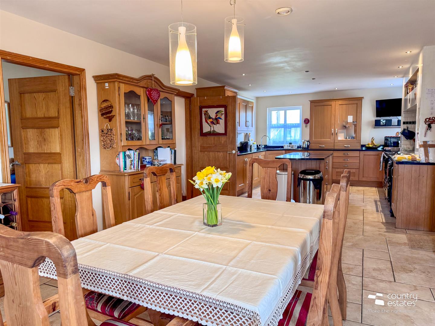 At max. Equipped with a comprehensive range of high and low level oak shaker style fitted units with contrasting granite work surfaces. Inlaid stainless steel sink with mixer tap. Integrated fridge/ freezer. Aga Range cooker. Fixed centre island with under counter cupboard and integrated dishwasher and contrasting granite work surfaces. Tiled floor. Open plan through dining area into:-