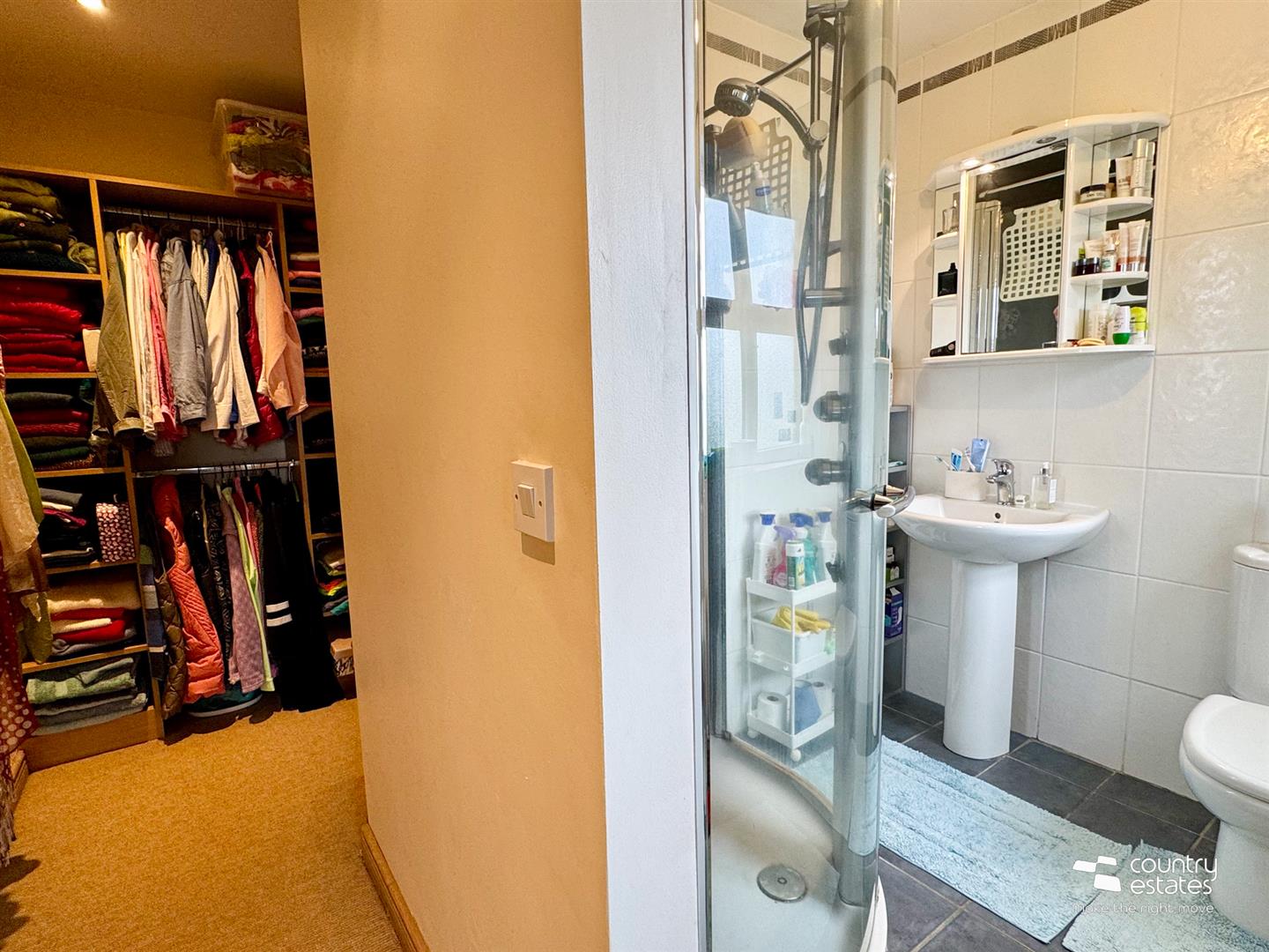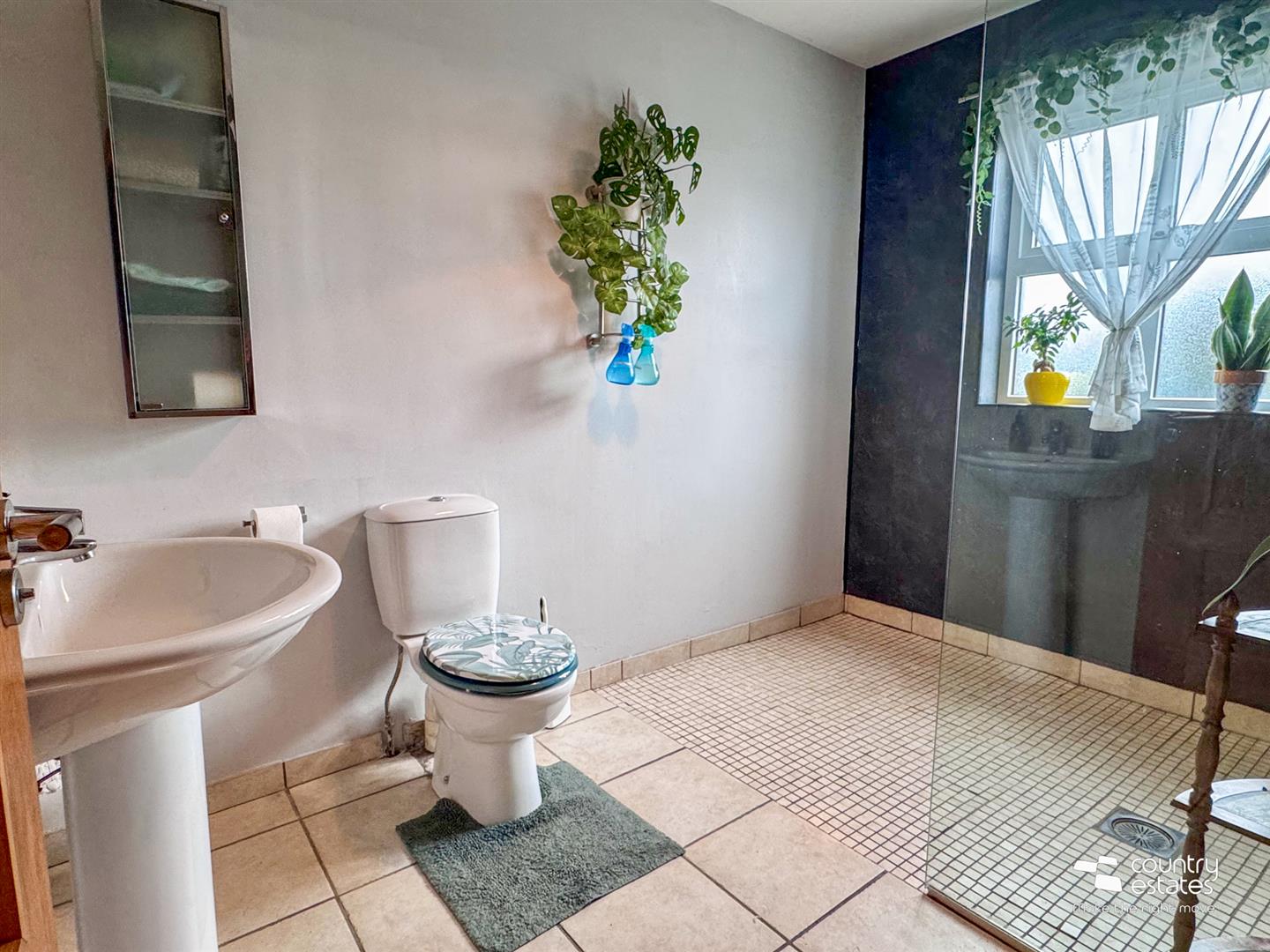 Comprising button flush w.c, modern vanity unit and large shower enclosure with electric shower unit. Tiled floor.